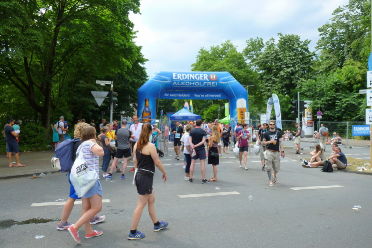 Im Ziel kann ich mir den Bauch vollhauen: Butterbrote mit Salz oder Wurst, Kuchen, Bananen, Äpfel, Cola und dergleichen. Und im Bereich der Sportanlage Schürenkamp wartet der Erdingerstand mit Weizen, Russ und Grapefruit-Weizen. Ich hole mir den Gerstensaft und gehe dann nochmals zum Zielgelände, wo ich die Zielläufer fotografiere.