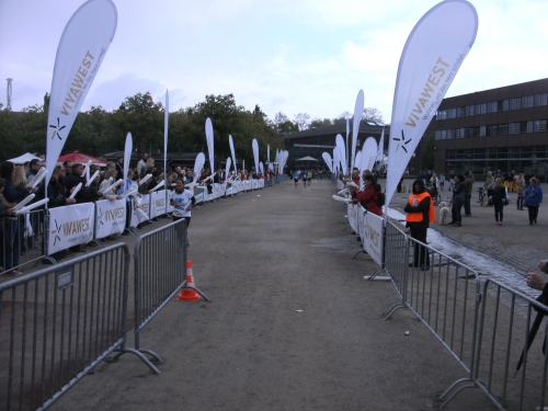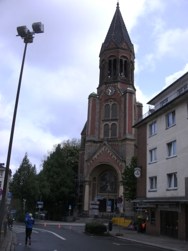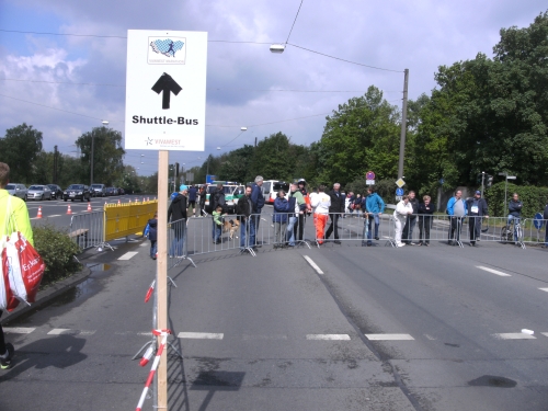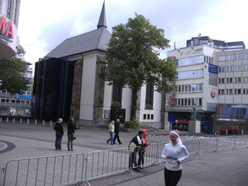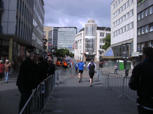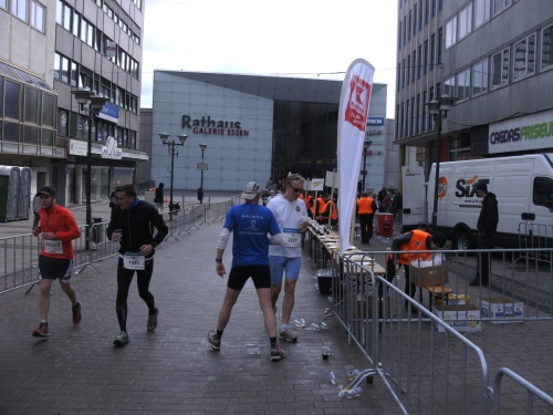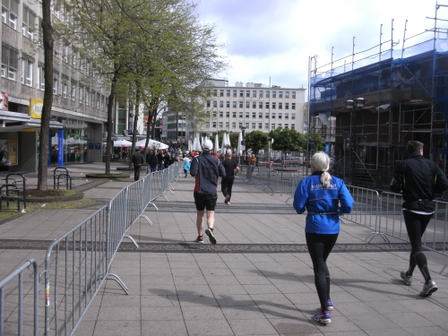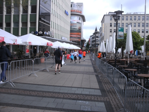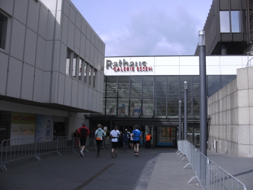 Kaum draußen, geht es weiter mitten durch die Essener Stadtmitte. Die Laufstrecke ist mit Gittern gut abgeschirmt, wie überhaupt die ganze Strecke gut gesichert ist.