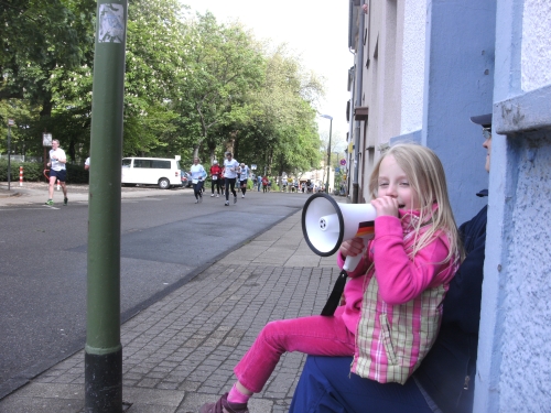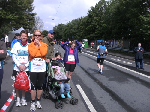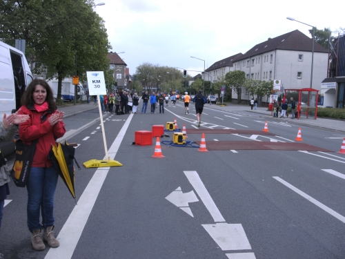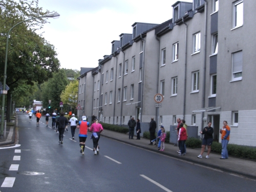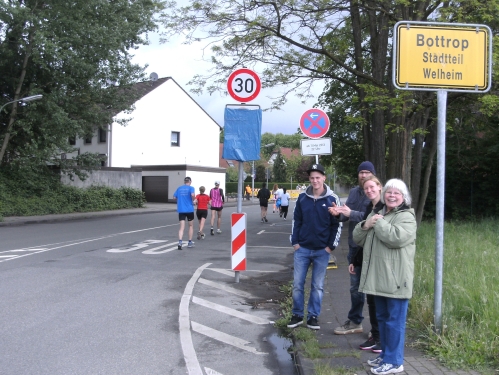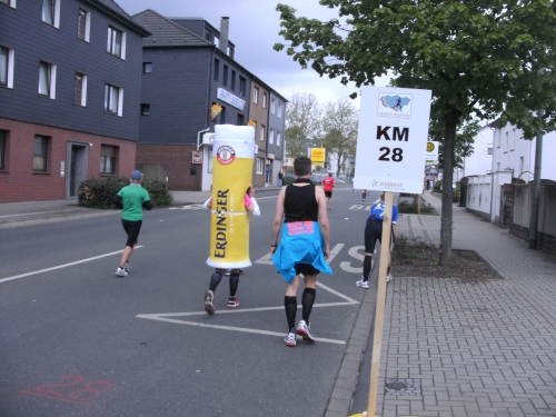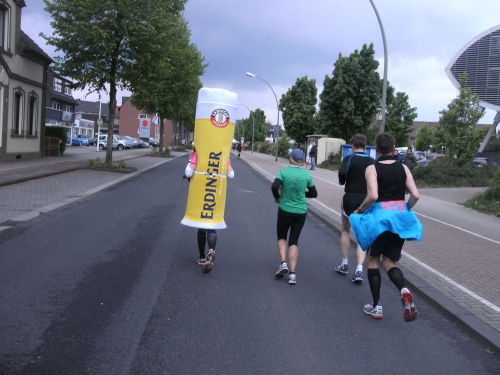 Wir durchlaufen Bottrop Welheim. Auch hier sitzen Zuschauer vor ihren Häusern und schauen dem Treiben der Marathonis zu. Gemütlich. Vor mir erscheint ein laufendes Weizenglas aus dem Münchner Norden, mein Lieblingsgetränk. Hier und heute aus Schaumstoff. Ich muss noch bis zur Zielverpflegung warten.