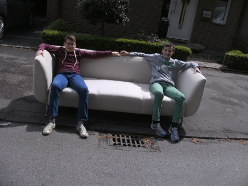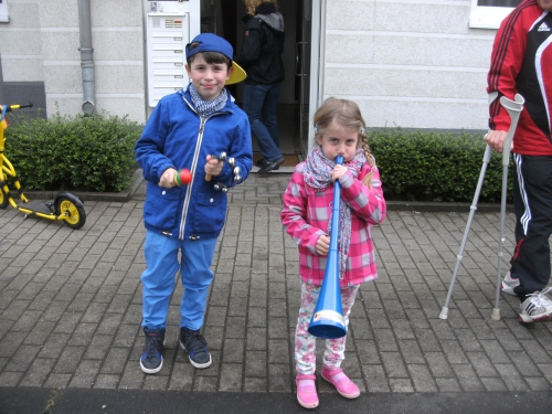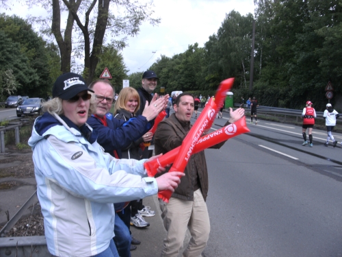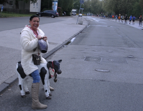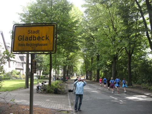 Wir kommen nach Gladbeck, der vierten Ruhrgebietsstadt der heutigen Lauftour durchs Revier. Km 32 wird passiert. Zwei Burschen sitzen bequem auf einem Sofa und eine Zuschauerin gibt alles mit einer Kuhglocke auf einer Kuh sitzend.