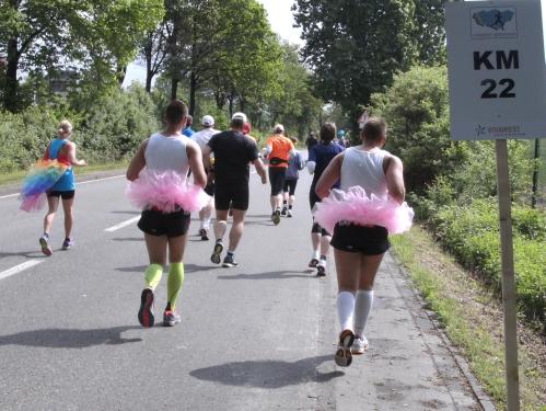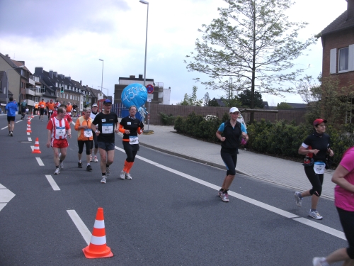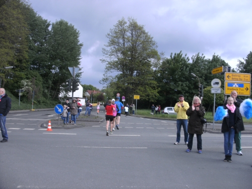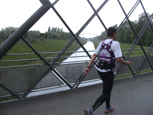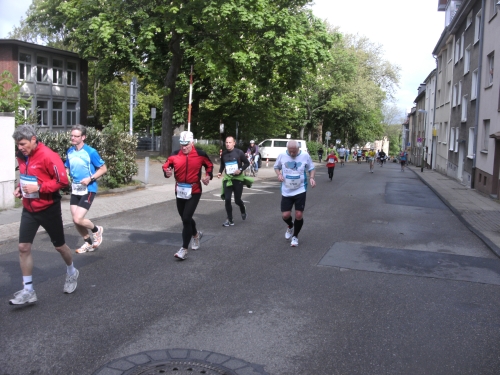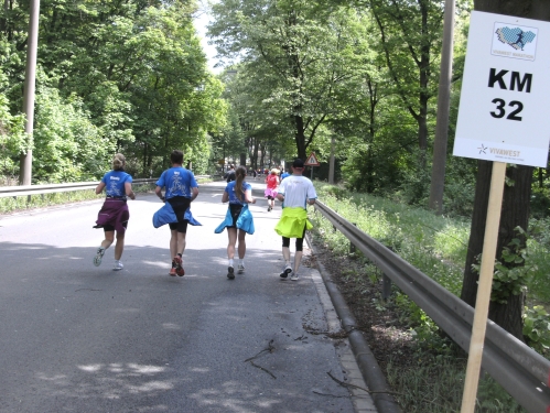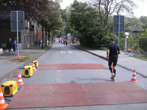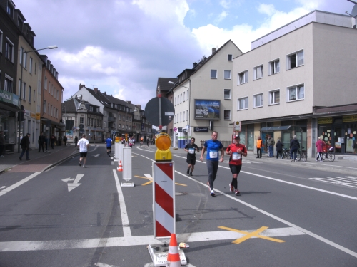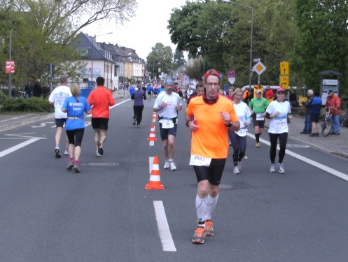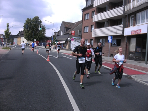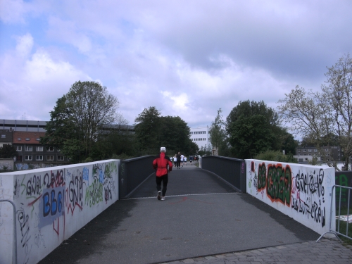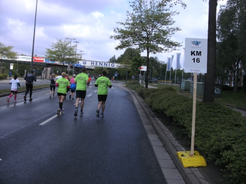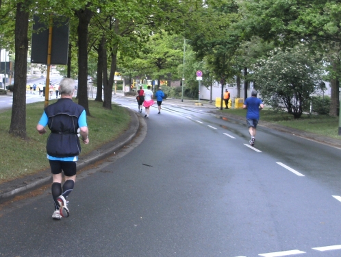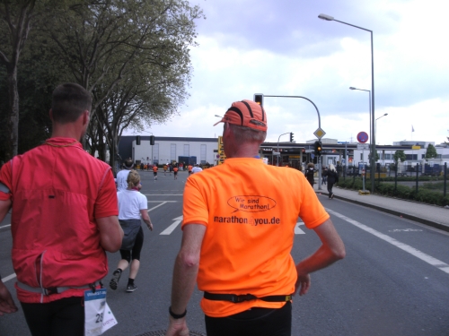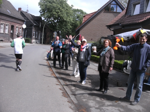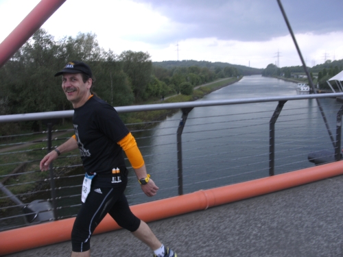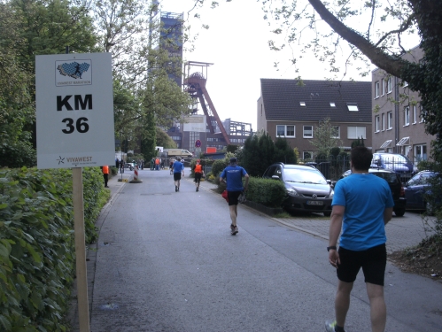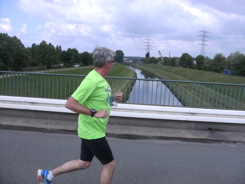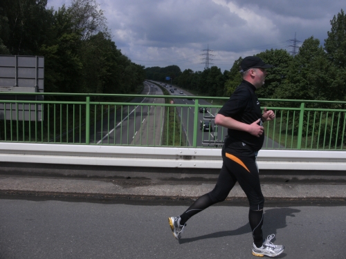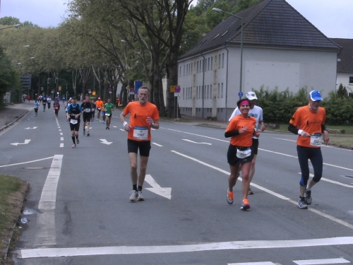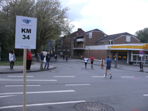 Noch in Bottrop kommen mir vor Km 29 plötzlich Läufer entgegen. Wir haben eine kurze Wendepunktstrecke vor uns. Im Gegenverkehr mache ich ein mir bekanntes Gesicht mit m4y-Shirt aus. Es ist Werner Kerkenbusch. Ob er auch so oft wie ich heute als Oranier, sprich Holländer angesprochen wurde ob der T-Shirtfarbe?