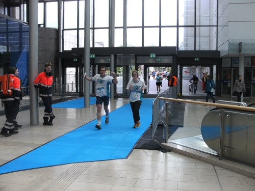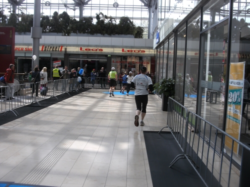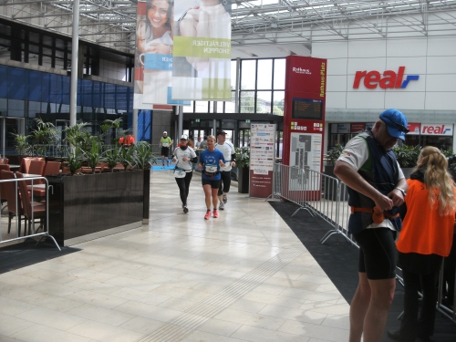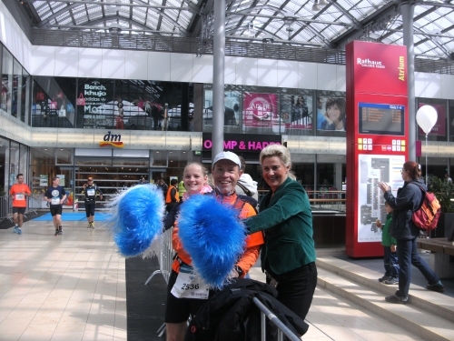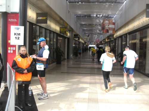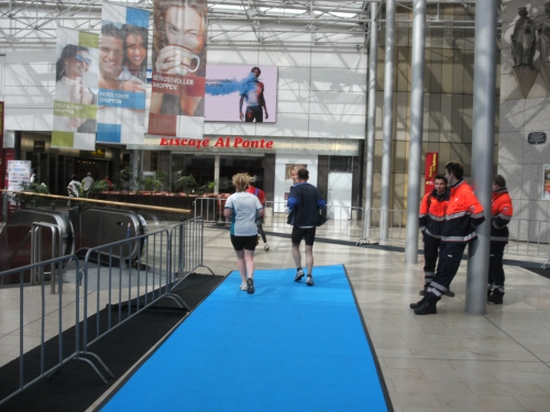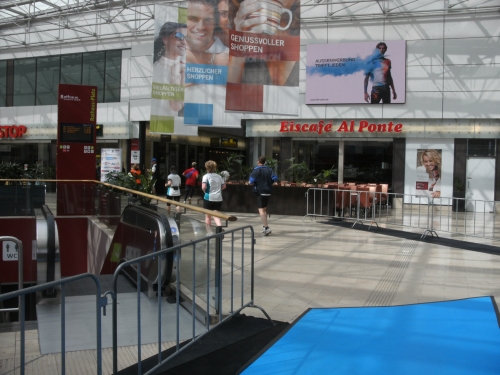 Bei Km 12 werde ich jedoch durch einen weiteren Höhepunkt der Strecke abgebremst und zu einigen Fotos gezwungen. Es geht durch die Essener Rathaus Galerie. Und zwar mitten durch auf einem blauen Teppich. Ist richtig schön. Und dazu werde ich von zwei netten Mädels ganz blau umwedelt. Man ist das heiß hier drin!