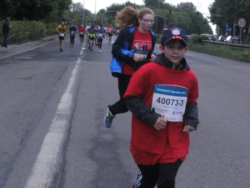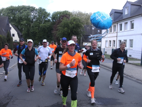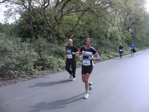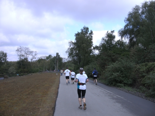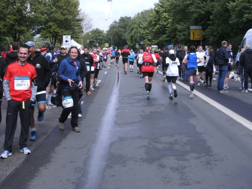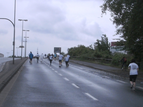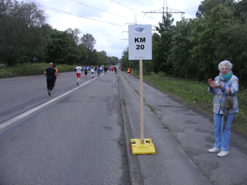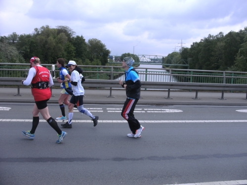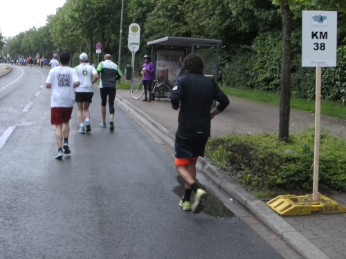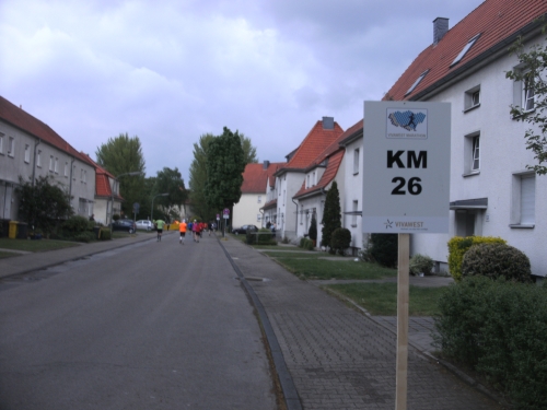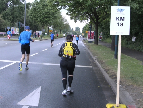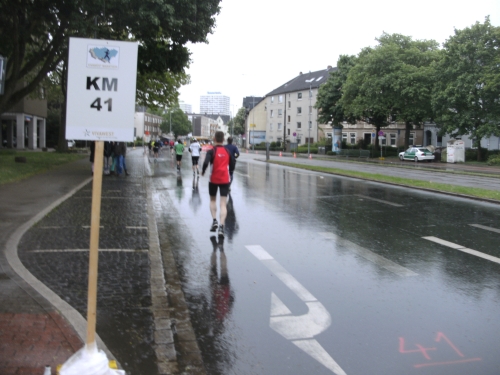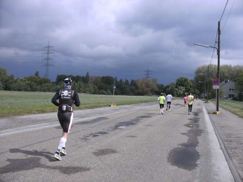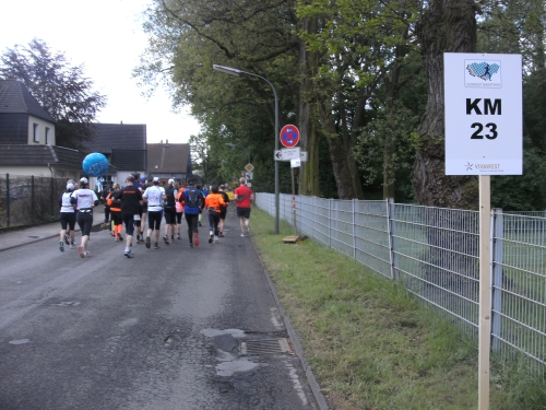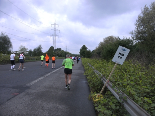 Zwei Läufern mit Röckchen fallen mir auf, als wir ein Stück parallel der A 42 laufen. Nach Km 23 überhole ich die 4.30 Std. Tempomacher. Ich habe meinen Tritt gefunden und freue mich über den abwechslungsreichen Lauf. Der ist nicht nur von der Strecke her wechselhaft, auch das Wetter wechselt ständig. Eben noch schönste Sonne, schon ist sie wieder weg und es zieht Regen auf. Und Wind haben wir ja eh die ganze Zeit.