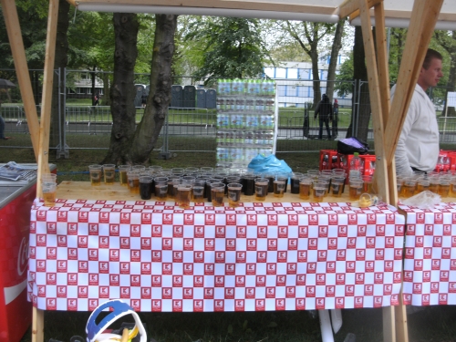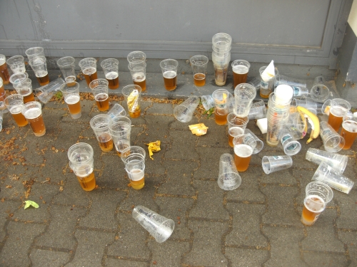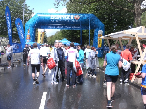 Einen Wermutstropfen hat die Zielverpflegung allerdings. Ich finde als 4.14 Std.-Finisher einige Stände bereits leer vor. Irgendwo soll es auch Fleischwurst gegeben haben. Wollte ich eigentlich nicht. Jetzt, wo nichts mehr da ist, will ich doch. Bleifreies Bier gibt es reichlich.