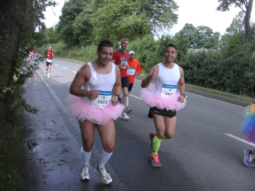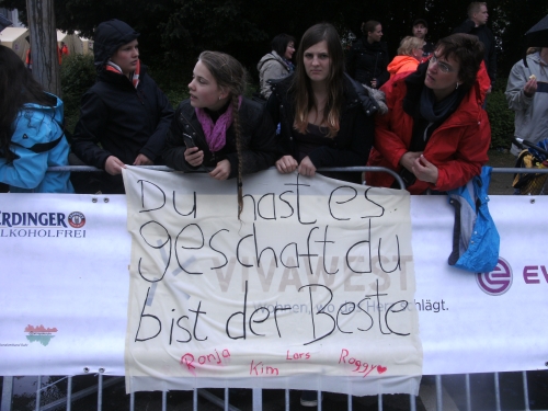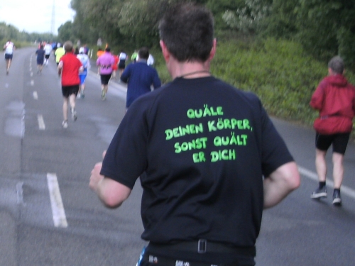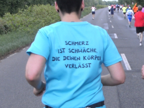 Ich merke meinen Rücken. Muss man auch am Vortag eines Marathons über 2.000 m² Rasen mähen? So etwas spornt mich jedoch nur an. „Schmerz ist Schwäche, die Deinen Körper verlässt“. Der Spruch auf dem Shirt einer Läuferin gibt es treffend wieder, besser könnte ich es nicht formulieren.