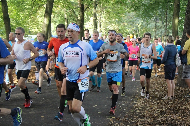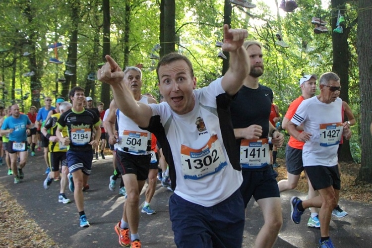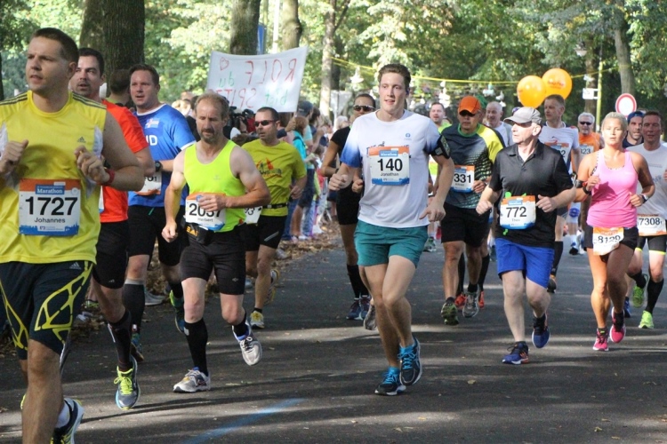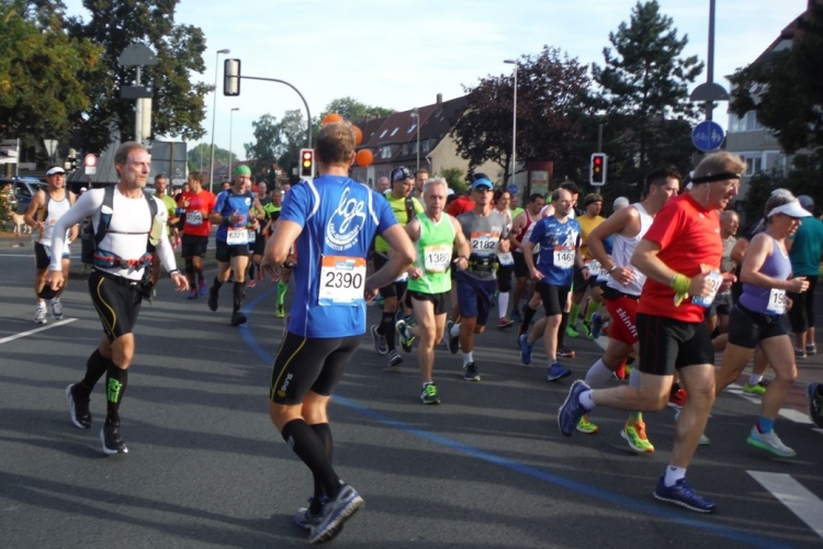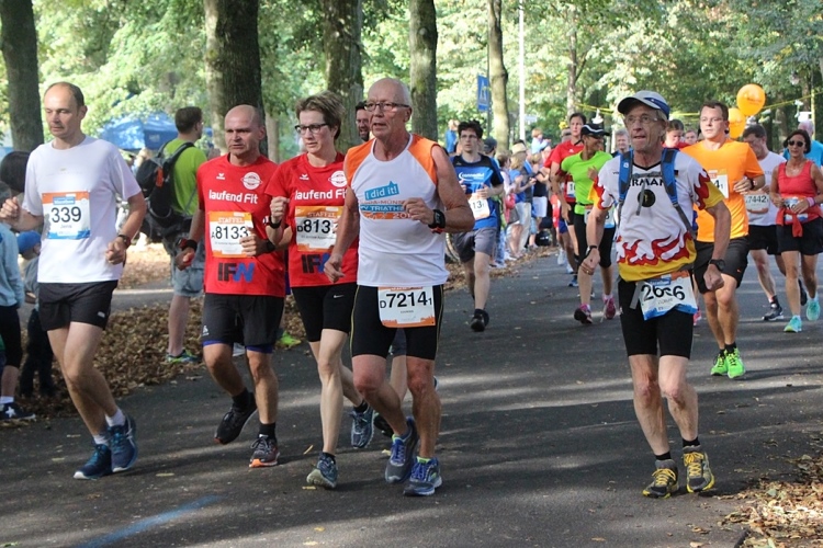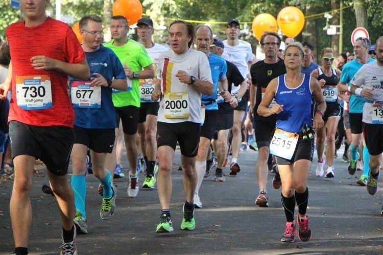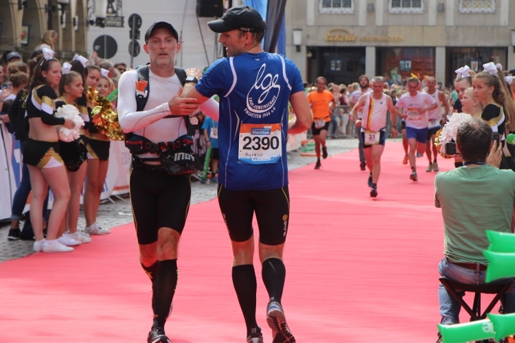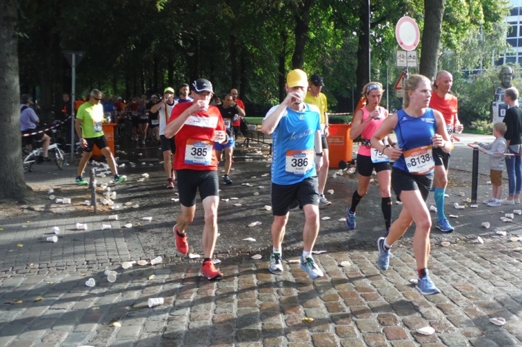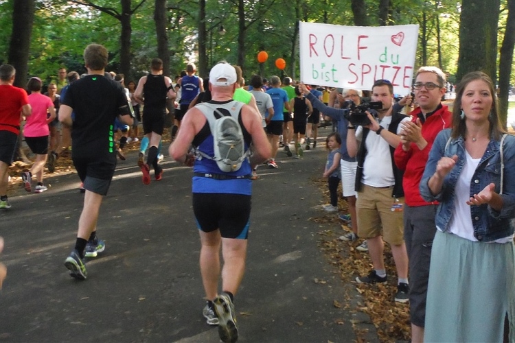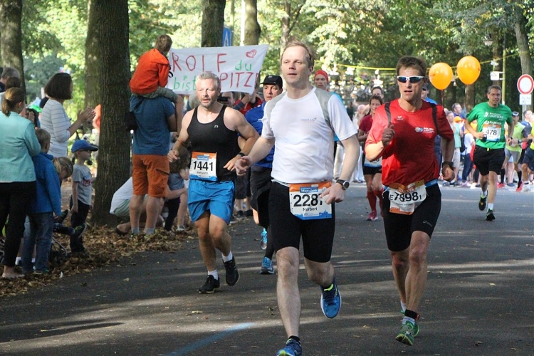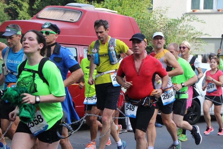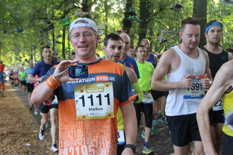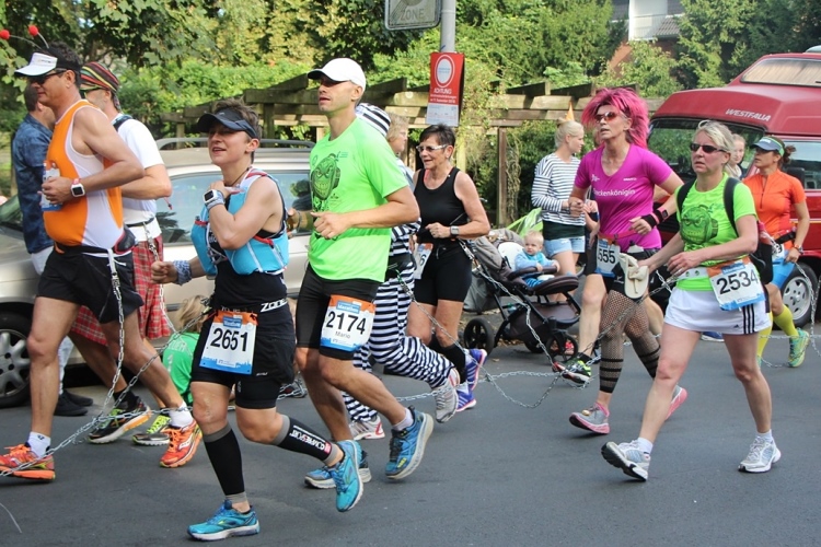 Auf geht’s. Am Stadtgraben ist die Straße breit genug, und jede Läuferin und jeder Läufer findet sein Tempo. Ich blicke derweil Markus direkt ins Gesicht, obwohl ich geradeaus laufe. Mein Namensvetter bewältigt den heutigen Marathon nämlich rückwärts. Da sollte ich doch wohl dranbleiben können, denke ich. Dass dies nur Wunschdenken ist, erfahre ich im Ziel, denn mit 3:51er Zeit hängt er mich locker ab. Dafür bleibe ich deutlich vor den Kettenläufern, die ihre eigene Zielvorgabe von 5 Stunden 30 einhalten werden. Von diesem Event im Event erfahrt ihr näheres im Bericht von Mario, der für M4Y in dieser Gruppe unterwegs ist.