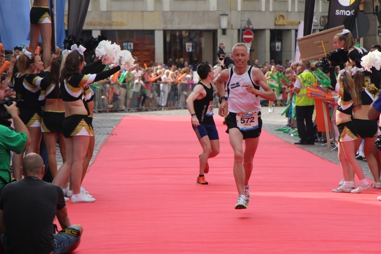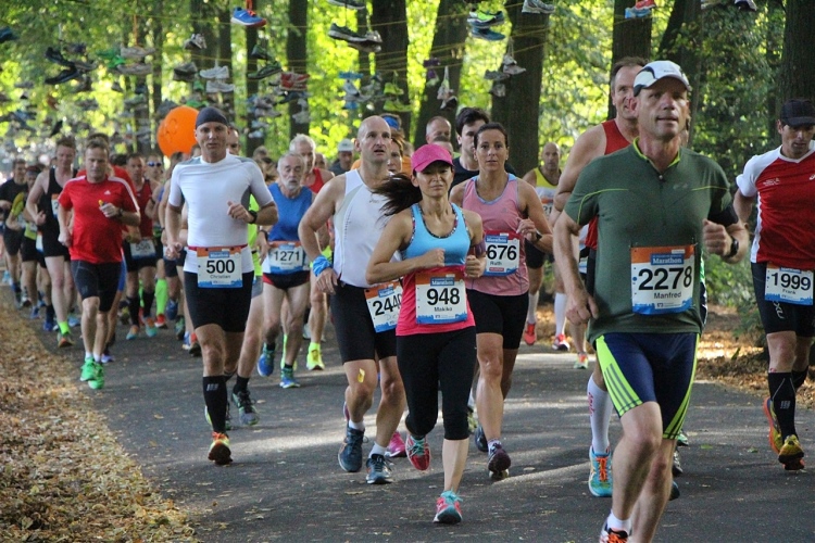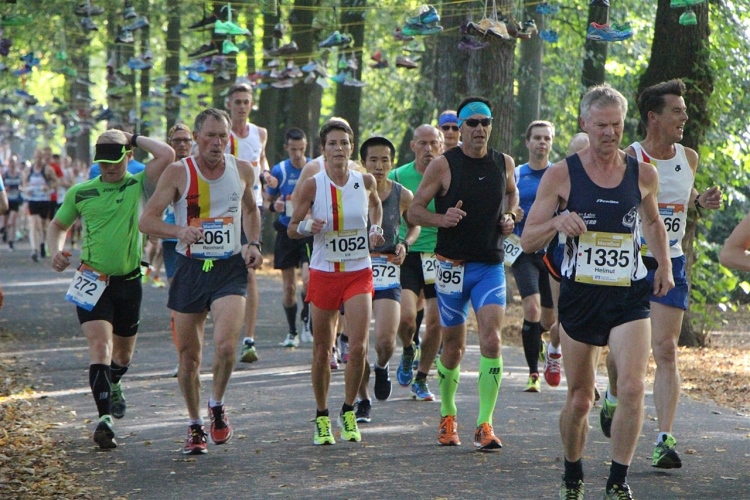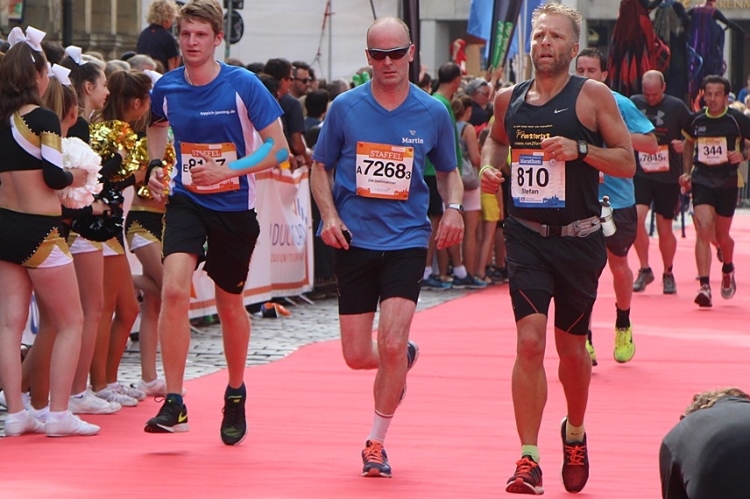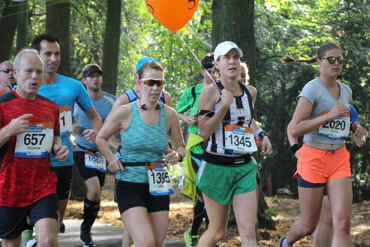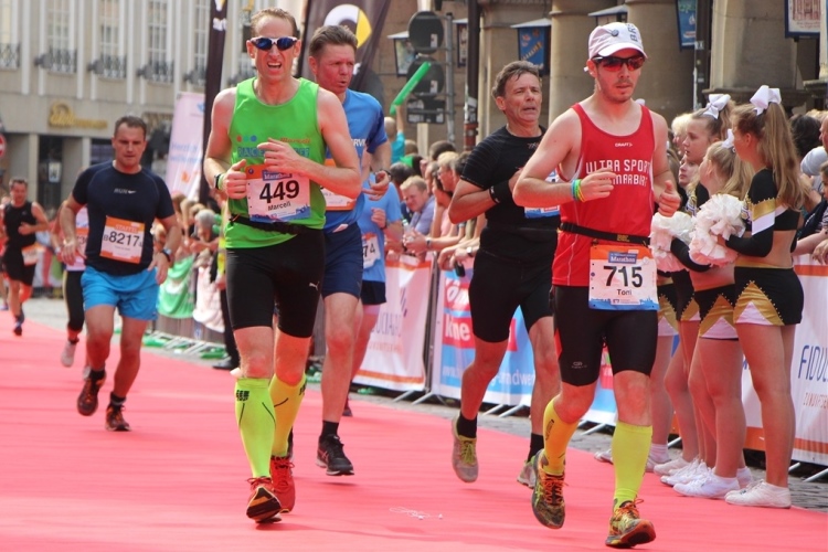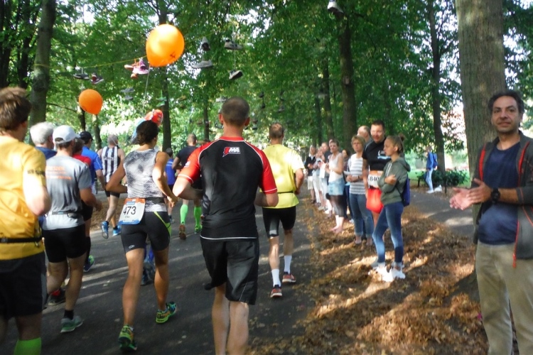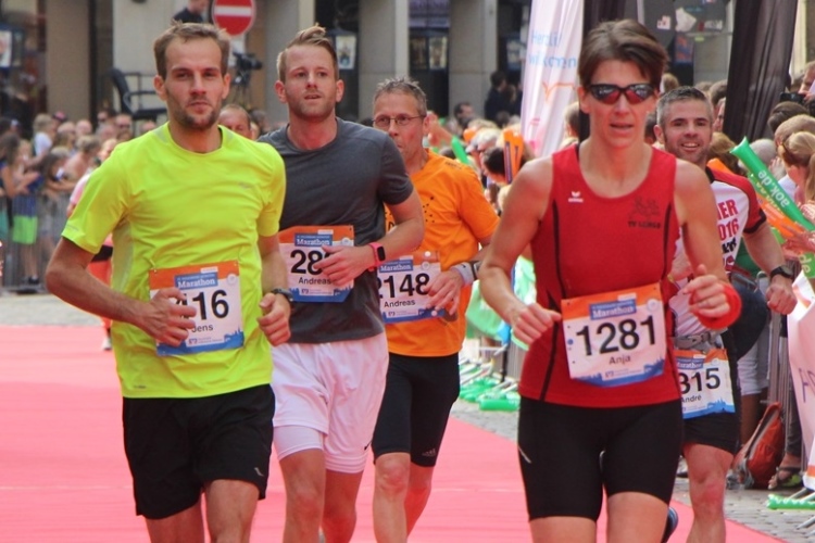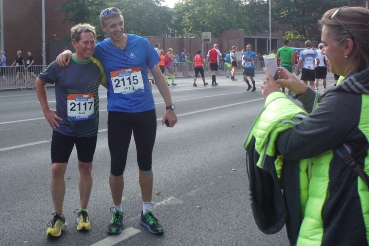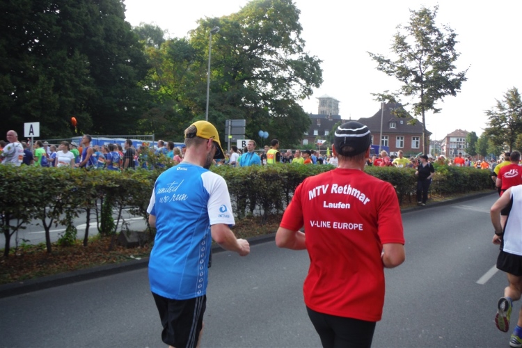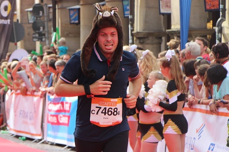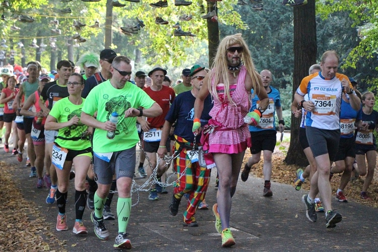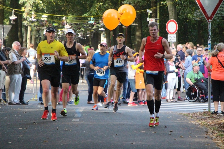 Auf geht’s. Am Stadtgraben ist die Straße breit genug, und jede Läuferin und jeder Läufer findet sein Tempo. Ich blicke derweil Markus direkt ins Gesicht, obwohl ich geradeaus laufe. Mein Namensvetter bewältigt den heutigen Marathon nämlich rückwärts. Da sollte ich doch wohl dranbleiben können, denke ich. Dass dies nur Wunschdenken ist, erfahre ich im Ziel, denn mit 3:51er Zeit hängt er mich locker ab. Dafür bleibe ich deutlich vor den Kettenläufern, die ihre eigene Zielvorgabe von 5 Stunden 30 einhalten werden. Von diesem Event im Event erfahrt ihr näheres im Bericht von Mario, der für M4Y in dieser Gruppe unterwegs ist.