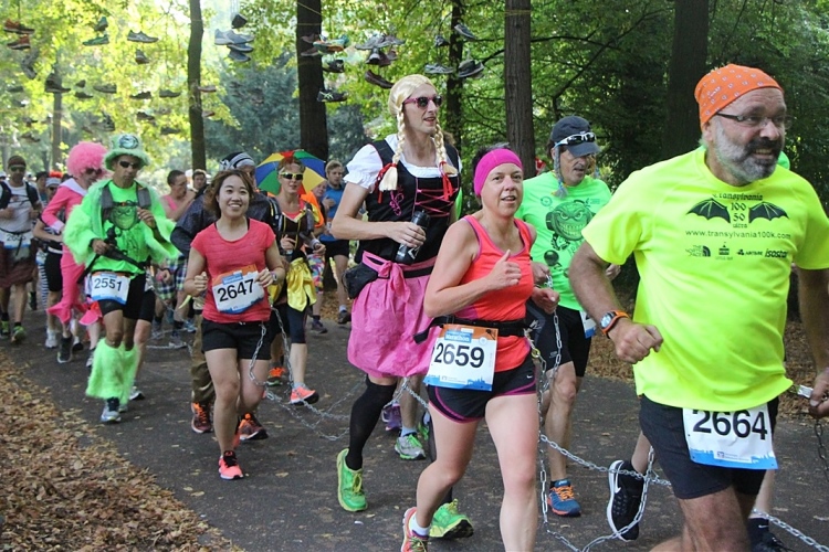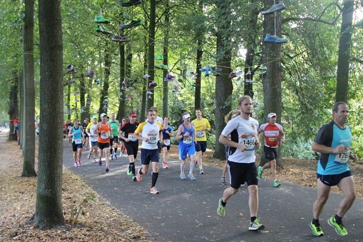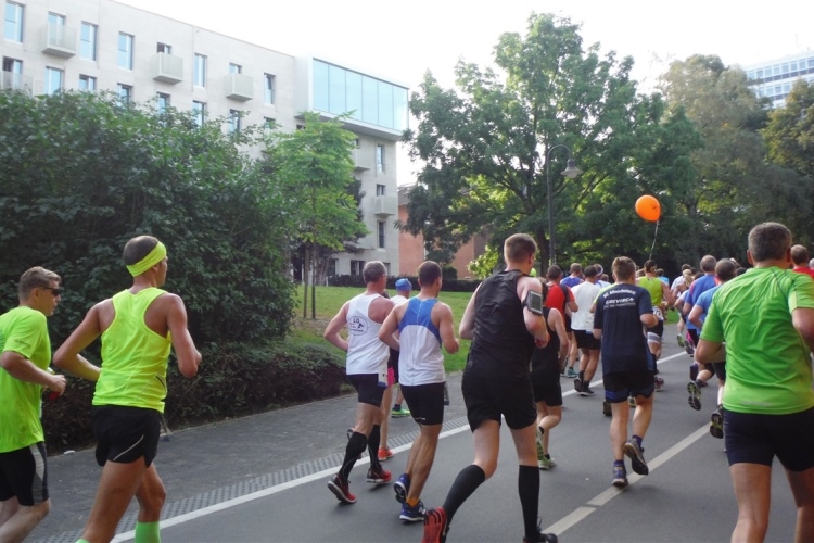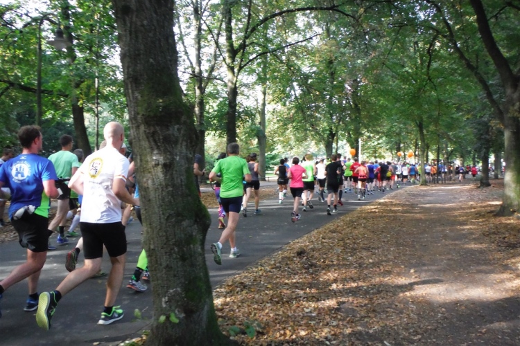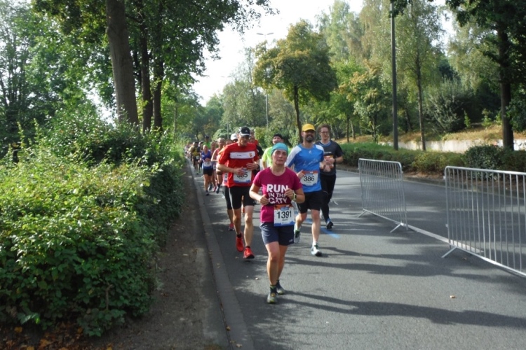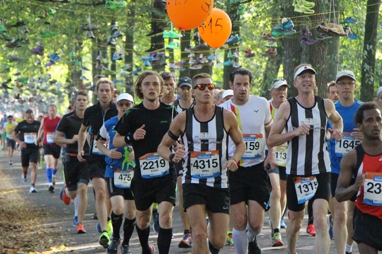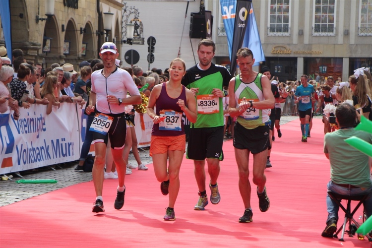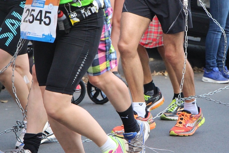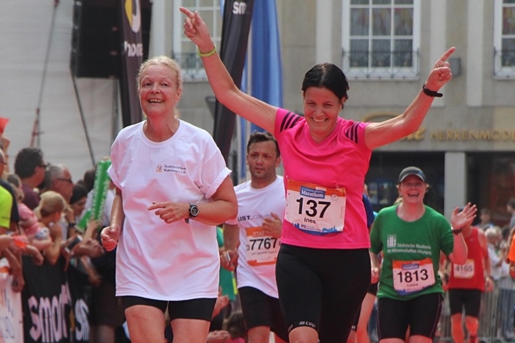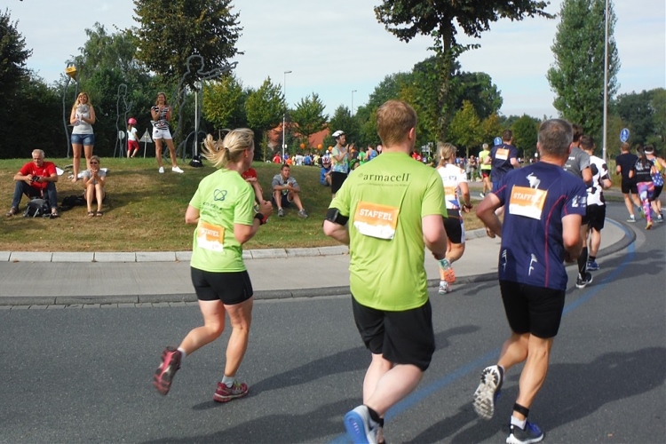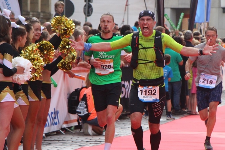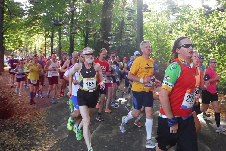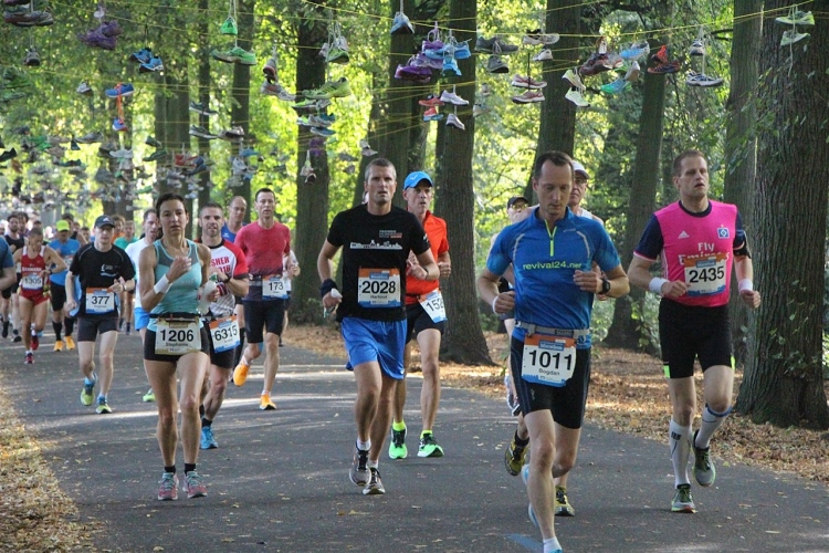 Auf geht’s. Am Stadtgraben ist die Straße breit genug, und jede Läuferin und jeder Läufer findet sein Tempo. Ich blicke derweil Markus direkt ins Gesicht, obwohl ich geradeaus laufe. Mein Namensvetter bewältigt den heutigen Marathon nämlich rückwärts. Da sollte ich doch wohl dranbleiben können, denke ich. Dass dies nur Wunschdenken ist, erfahre ich im Ziel, denn mit 3:51er Zeit hängt er mich locker ab. Dafür bleibe ich deutlich vor den Kettenläufern, die ihre eigene Zielvorgabe von 5 Stunden 30 einhalten werden. Von diesem Event im Event erfahrt ihr näheres im Bericht von Mario, der für M4Y in dieser Gruppe unterwegs ist.