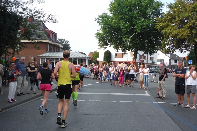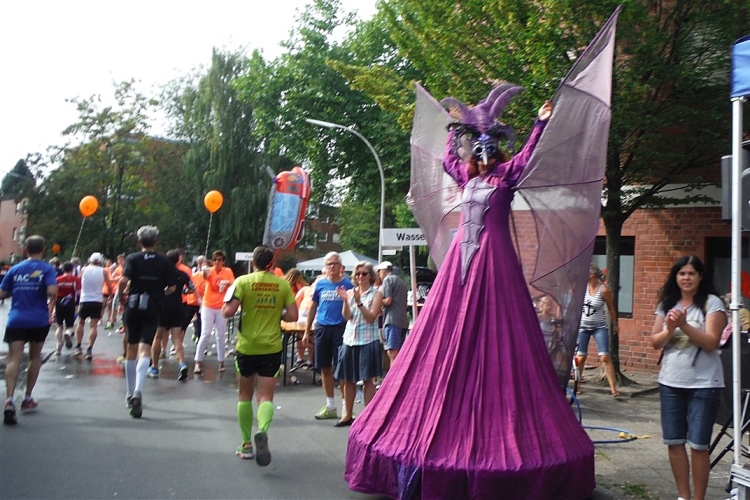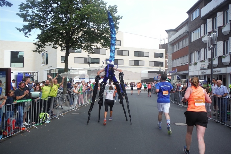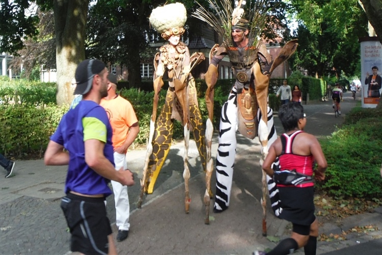 Am Ortseingang wird es wieder voll. Die Staffelläufer wechseln das zweite Mal. Anschließend erwarten mich Erdmännchen auf Stelzen. Was die mit dem Powerpoint Karibik zu tun haben, erschließt sich mir nicht sofort, aber vielleicht gibt es die putzigen Nager ja auch dort. Da passen die Tänzerinnen auf der Bühne schon eher ins Bild. Natürlich feiern auch hier viele Zuschauer die Marathonis und die Fangruppe Zieglein steht wieder in der ersten Reihe. Mit ihren Standortwechseln bringen sie heute einen Marathon ganz anderer Art hinter sich. Überhaupt freut mich das Interesse der Zuschauer, die uns immer lautstark anspornen. Etwa 100.000 werden heute die Strecke säumen. Da kann bei weitem nicht jeder Stadtmarathon mithalten. Erst kurz hinter KM 23 wird es wieder etwas ruhiger.