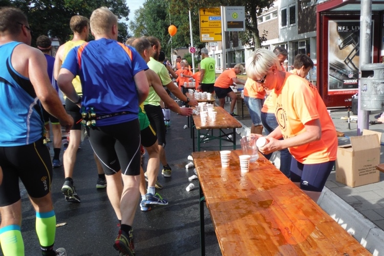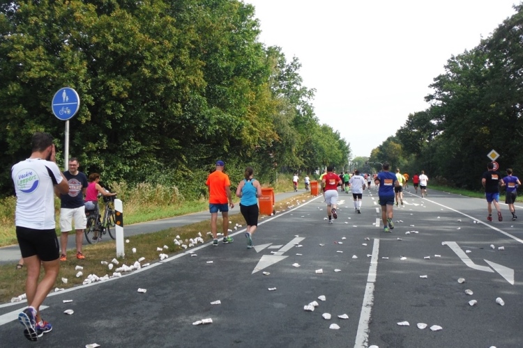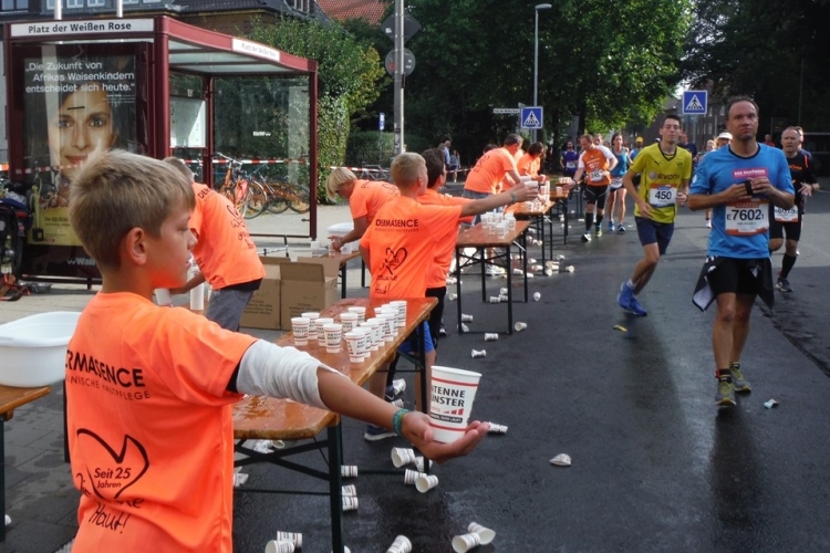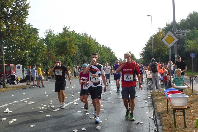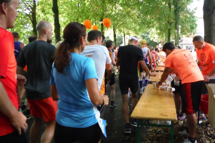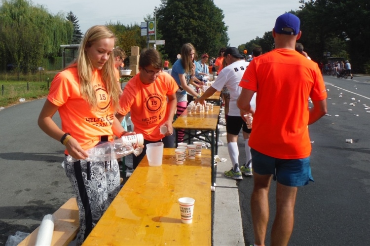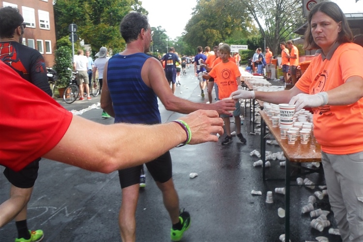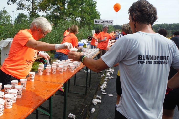 17 Verpflegungs- und Erfrischungspunkte an der Strecke und Verpflegung im Ziel. Gereicht werden Powerrade, Wasser und Cola. Dazu Bananen- und Apfelsinenstücke. An den Erfrischungspunkten nur Wasser.