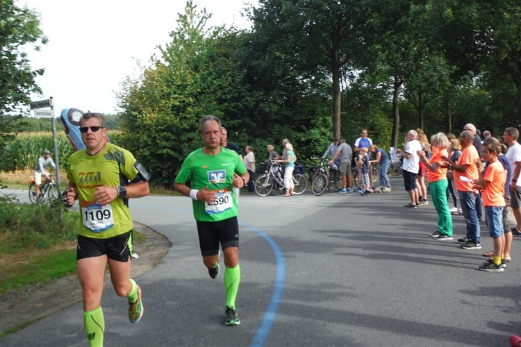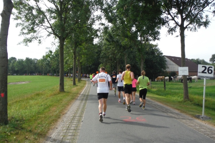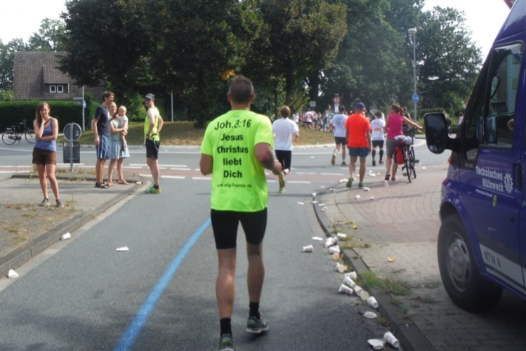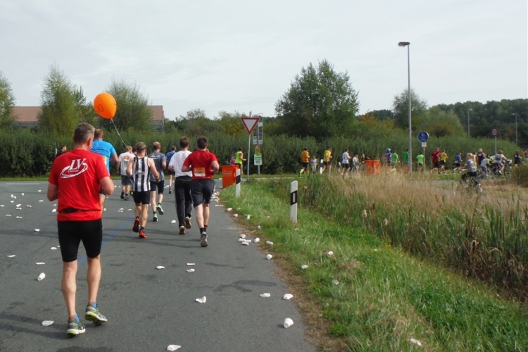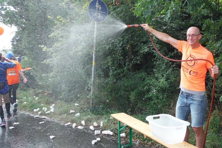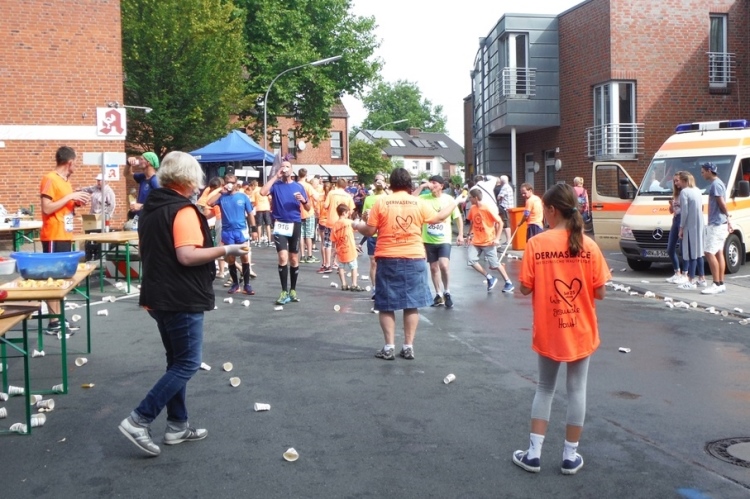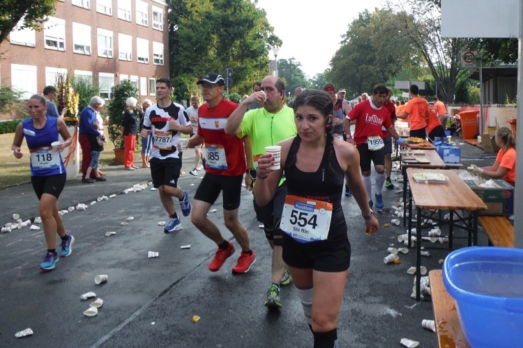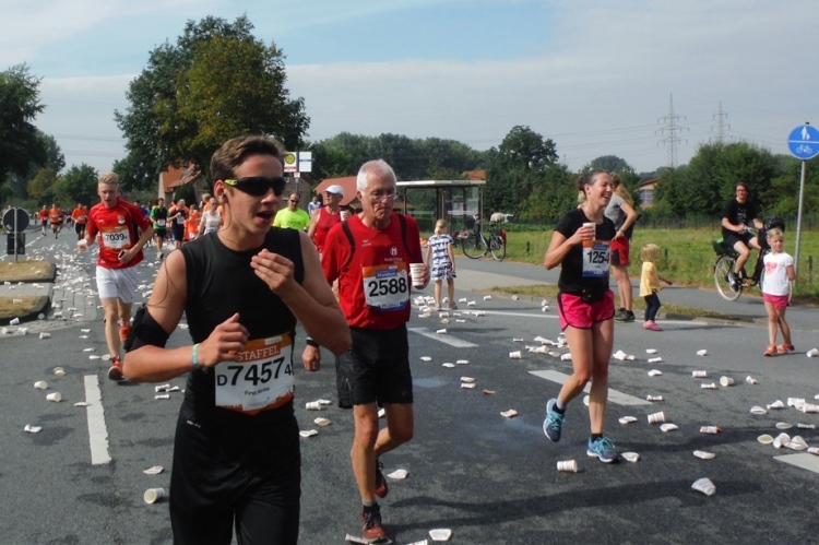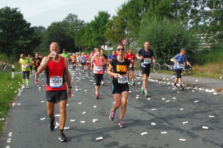 17 Verpflegungs- und Erfrischungspunkte an der Strecke und Verpflegung im Ziel. Gereicht werden Powerrade, Wasser und Cola. Dazu Bananen- und Apfelsinenstücke. An den Erfrischungspunkten nur Wasser.