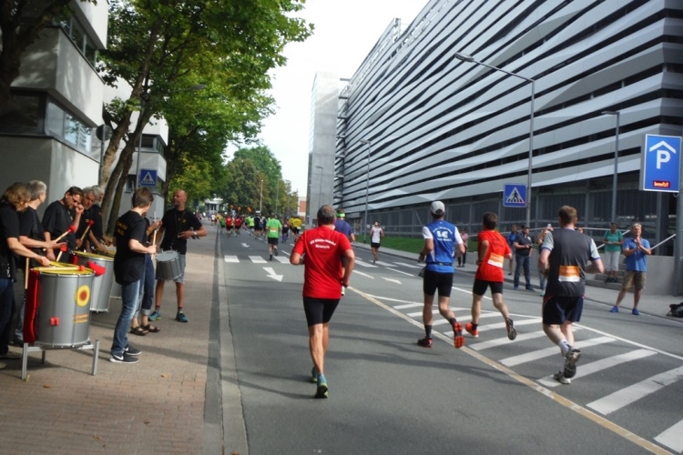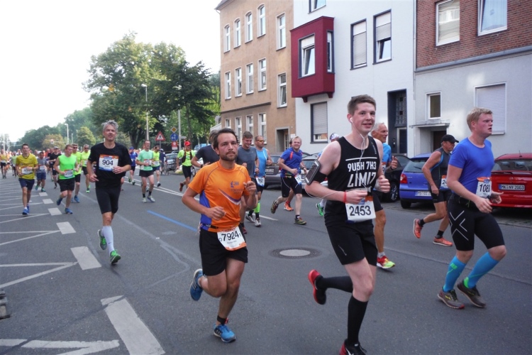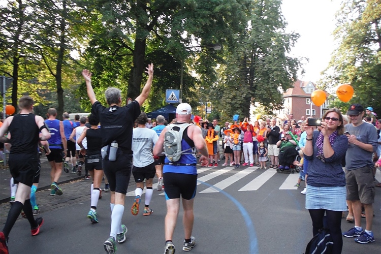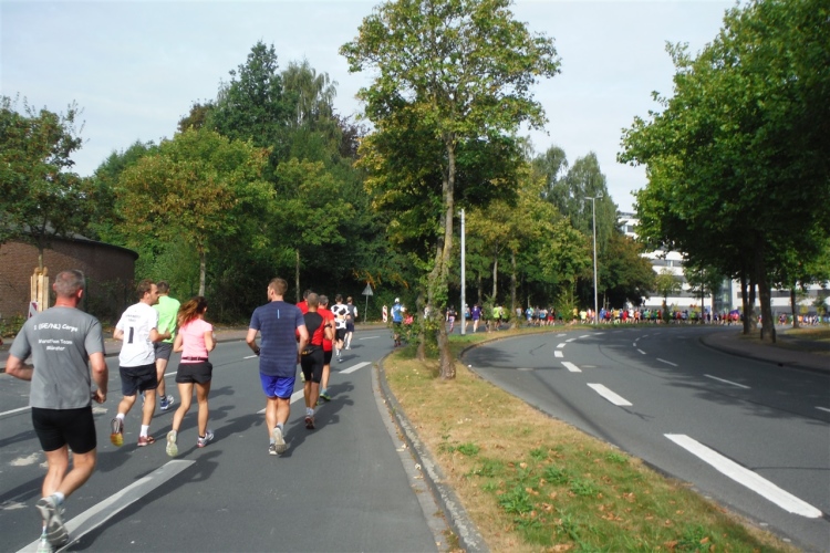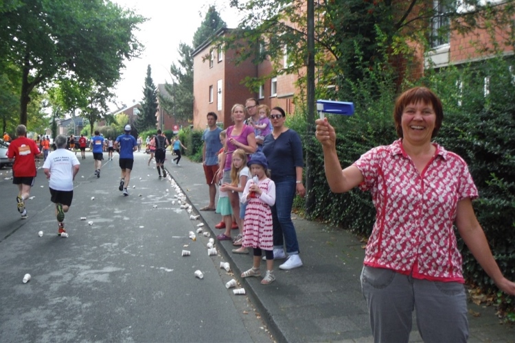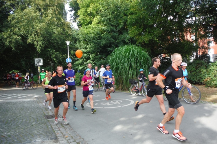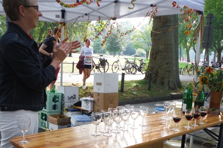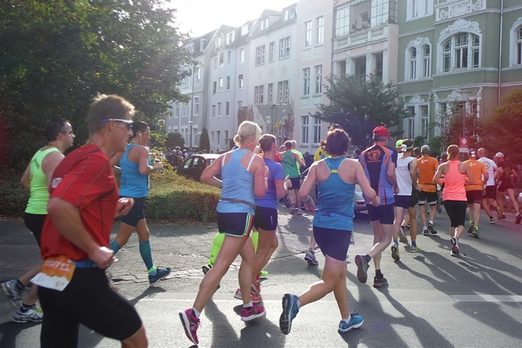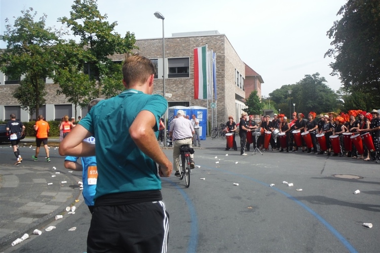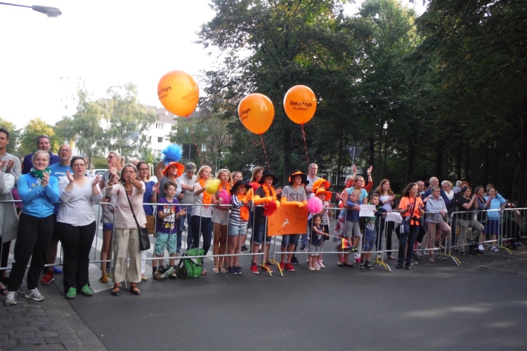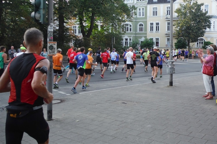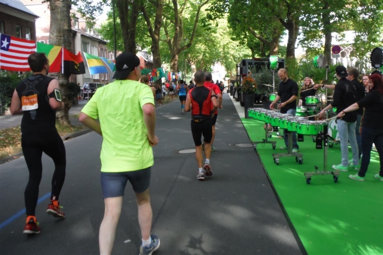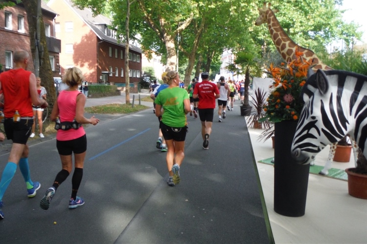 In diesem Wohnviertel stehen viele Zuschauer Spalier, wie fast überall an der Strecke. Sonnenblumen strahlen mit unserem Zentralgestirn um die Wette. Die Temperaturen sind noch angenehm, werden aber noch steigen. Von Wolken ist wenig zu sehen. Bei KM 5 fließt der Schweiß bereits kräftig, da kommt die erste Getränkestelle gerade recht. Trinken, trinken, trinken ist bereits angesagt und wird vom erfahrenen Pacemaker eindringlich empfohlen. Die ersten erfrischenden Duschen haben aufmerksame Zuschauer eingerichtet, sie werden gerne genutzt. Weiter geht es durch die Straßenschluchten des Kreuzviertels. Die Sonne steht noch nicht hoch genug, es gibt noch Schatten. Zurück auf der Promenade ist es auch die folgenden Kilometer so. Heute ist dieser Streckenabschnitt, auf dem sonst stündlich bis zu 1.200 Fahrräder unterwegs sind, den Läufern vorbehalten.