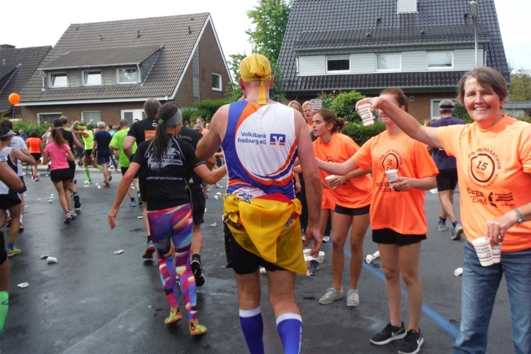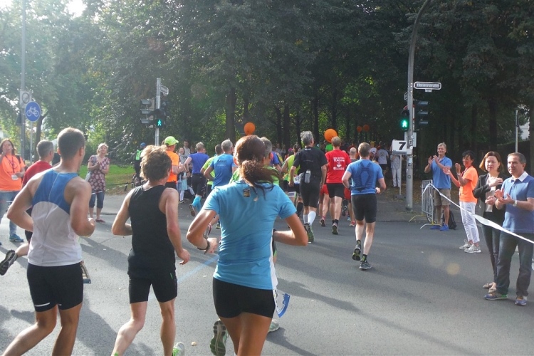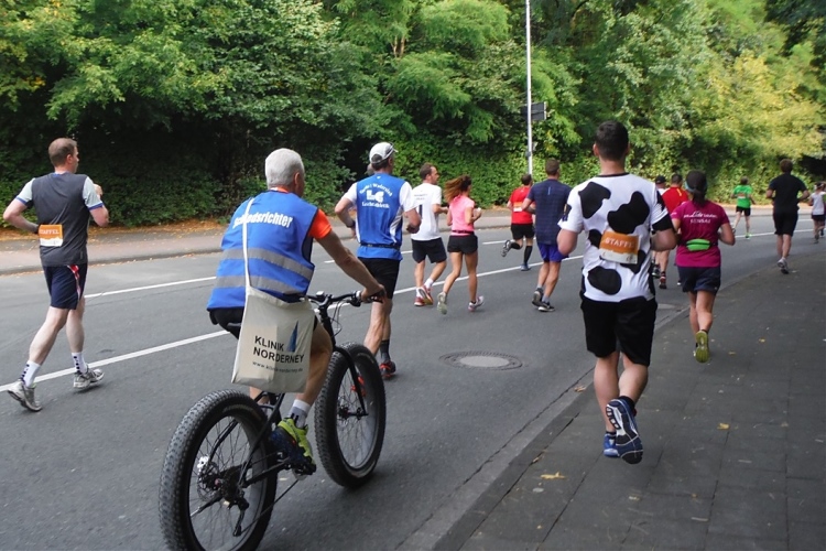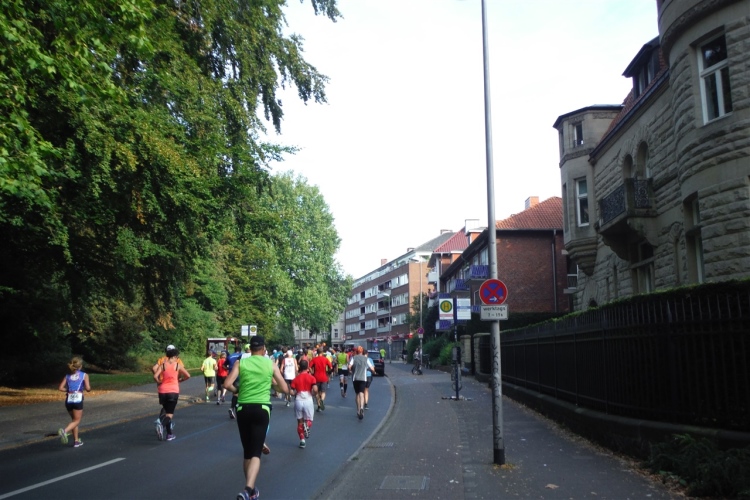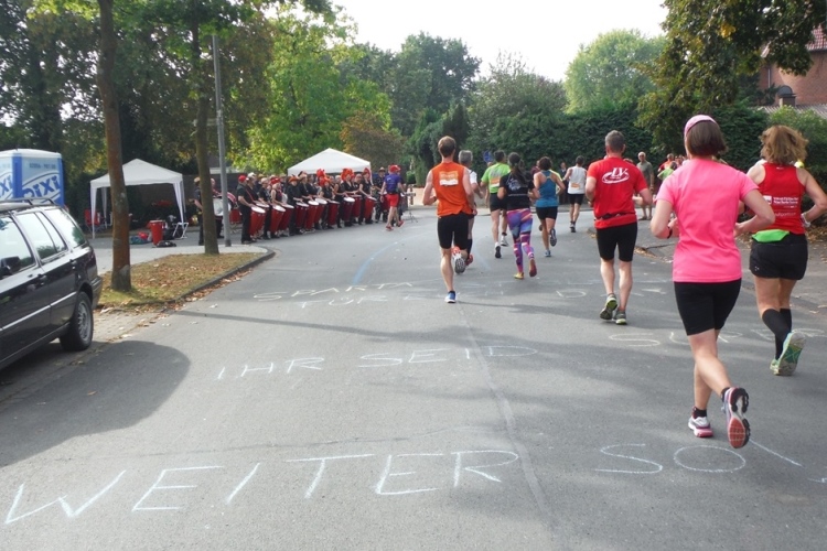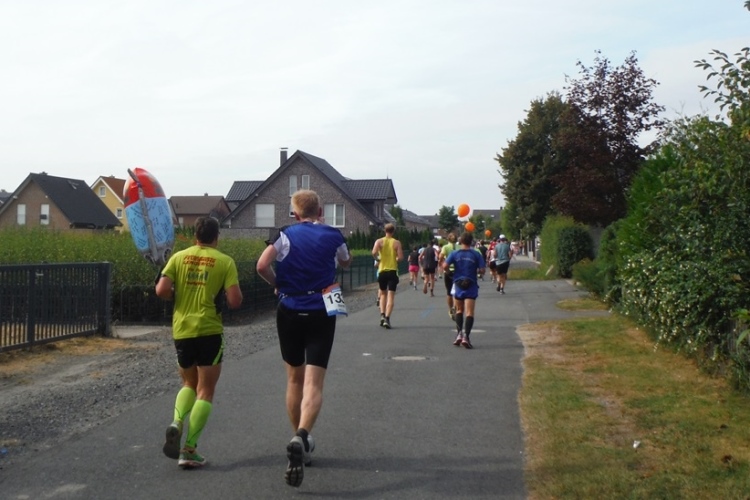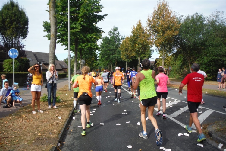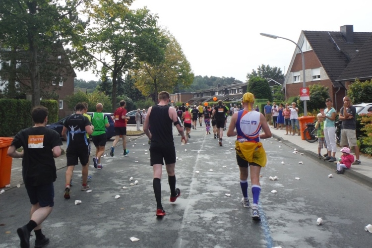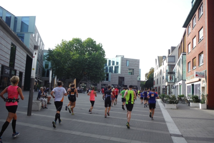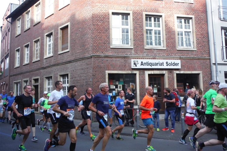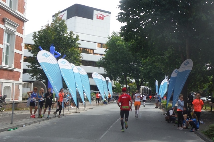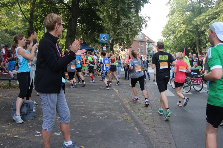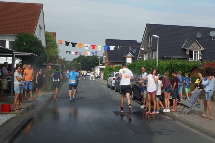 In diesem Wohnviertel stehen viele Zuschauer Spalier, wie fast überall an der Strecke. Sonnenblumen strahlen mit unserem Zentralgestirn um die Wette. Die Temperaturen sind noch angenehm, werden aber noch steigen. Von Wolken ist wenig zu sehen. Bei KM 5 fließt der Schweiß bereits kräftig, da kommt die erste Getränkestelle gerade recht. Trinken, trinken, trinken ist bereits angesagt und wird vom erfahrenen Pacemaker eindringlich empfohlen. Die ersten erfrischenden Duschen haben aufmerksame Zuschauer eingerichtet, sie werden gerne genutzt. Weiter geht es durch die Straßenschluchten des Kreuzviertels. Die Sonne steht noch nicht hoch genug, es gibt noch Schatten. Zurück auf der Promenade ist es auch die folgenden Kilometer so. Heute ist dieser Streckenabschnitt, auf dem sonst stündlich bis zu 1.200 Fahrräder unterwegs sind, den Läufern vorbehalten.