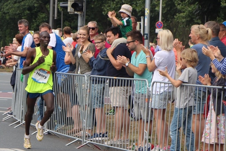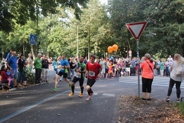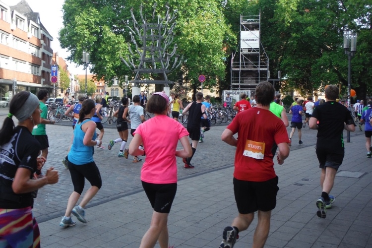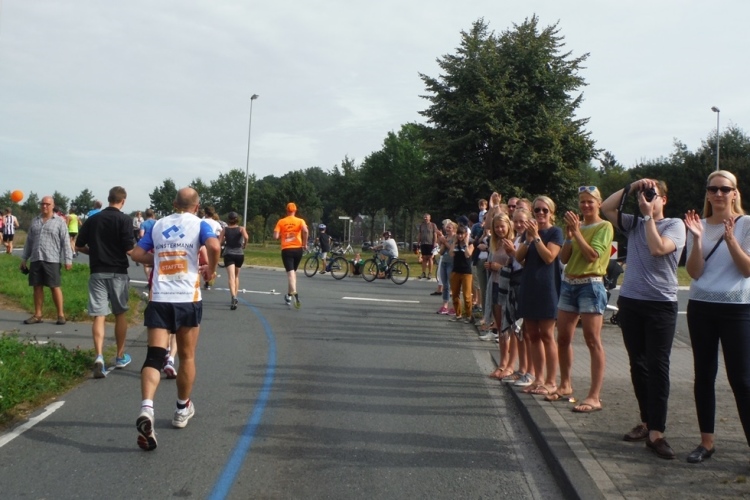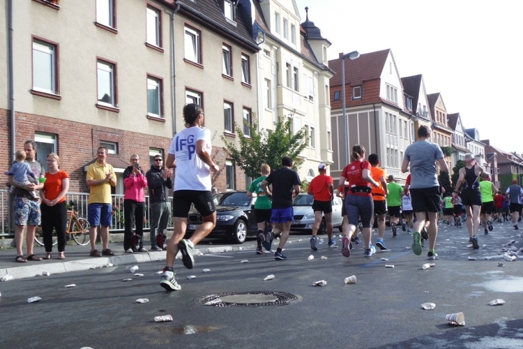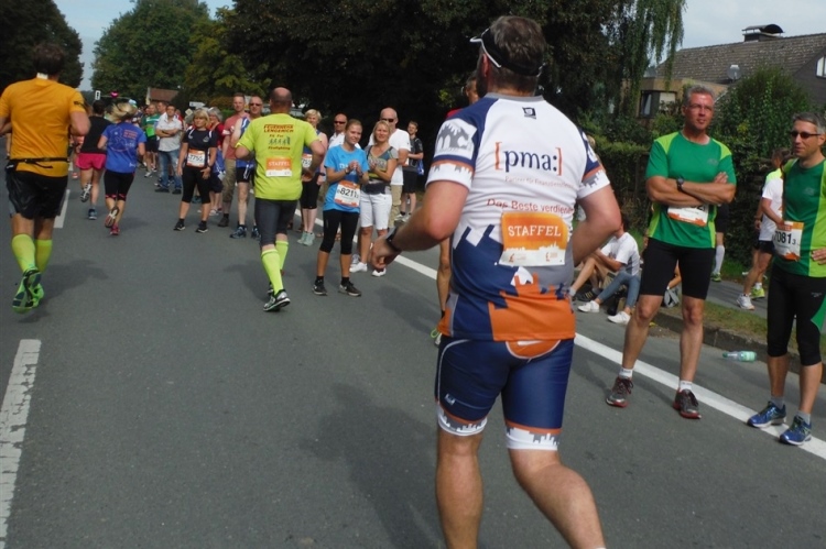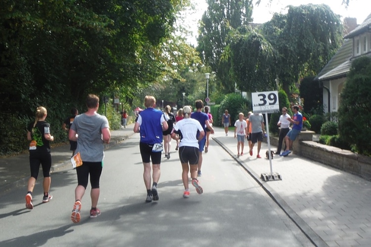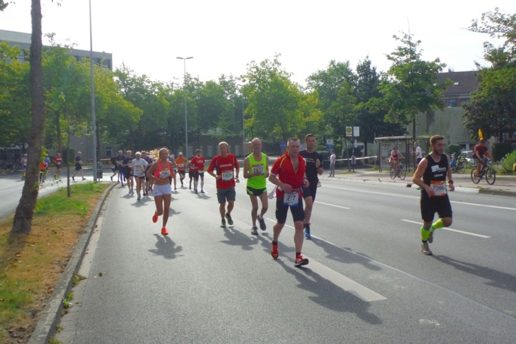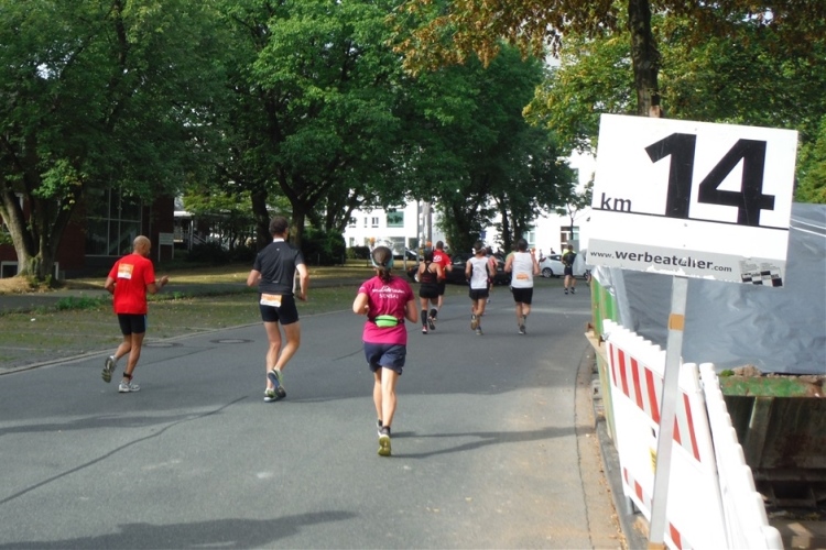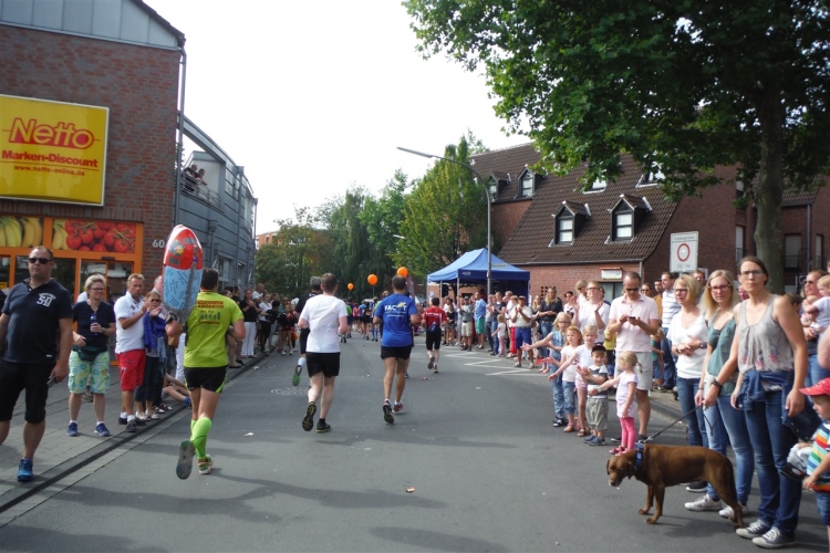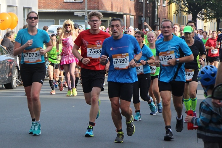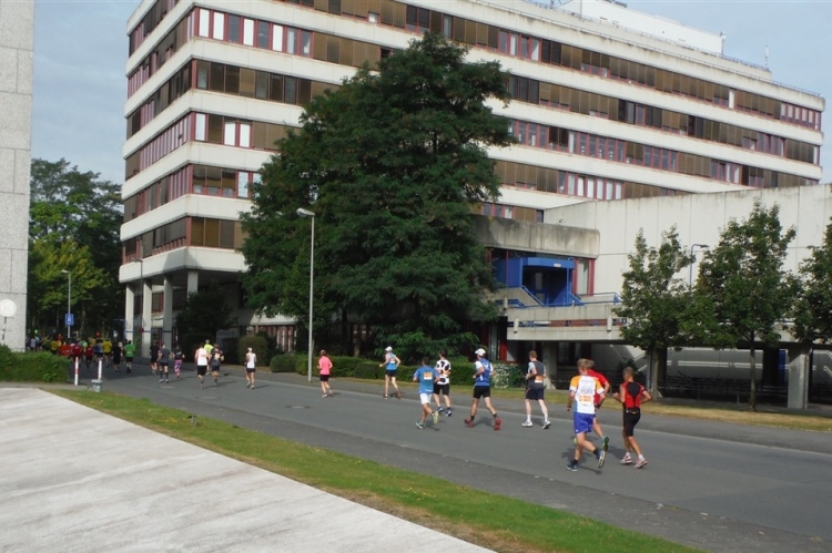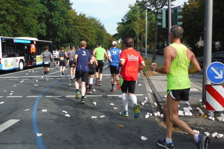 In diesem Wohnviertel stehen viele Zuschauer Spalier, wie fast überall an der Strecke. Sonnenblumen strahlen mit unserem Zentralgestirn um die Wette. Die Temperaturen sind noch angenehm, werden aber noch steigen. Von Wolken ist wenig zu sehen. Bei KM 5 fließt der Schweiß bereits kräftig, da kommt die erste Getränkestelle gerade recht. Trinken, trinken, trinken ist bereits angesagt und wird vom erfahrenen Pacemaker eindringlich empfohlen. Die ersten erfrischenden Duschen haben aufmerksame Zuschauer eingerichtet, sie werden gerne genutzt. Weiter geht es durch die Straßenschluchten des Kreuzviertels. Die Sonne steht noch nicht hoch genug, es gibt noch Schatten. Zurück auf der Promenade ist es auch die folgenden Kilometer so. Heute ist dieser Streckenabschnitt, auf dem sonst stündlich bis zu 1.200 Fahrräder unterwegs sind, den Läufern vorbehalten.
