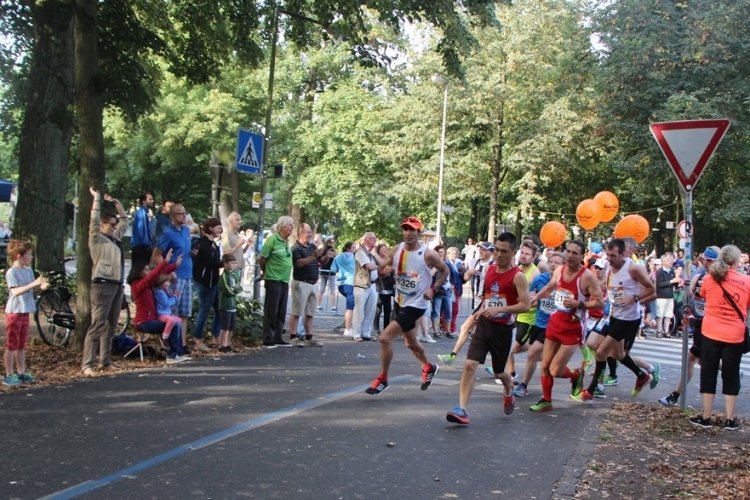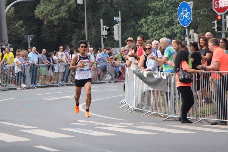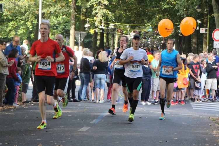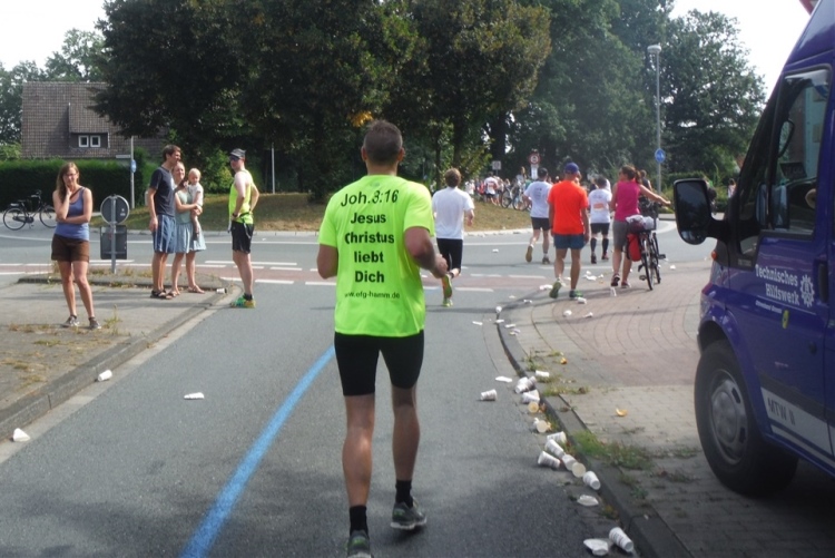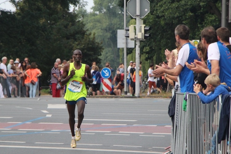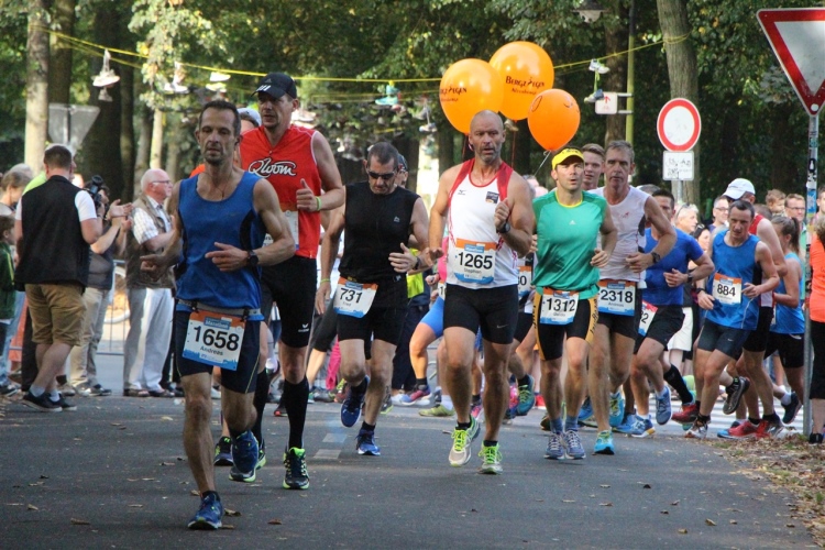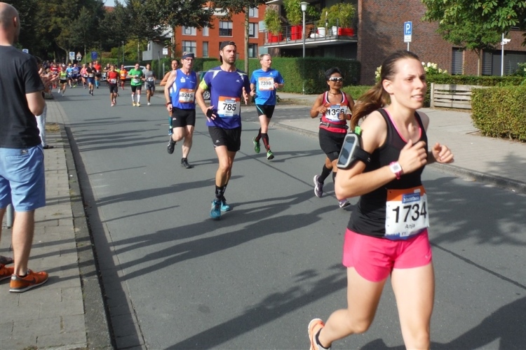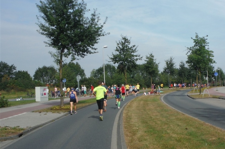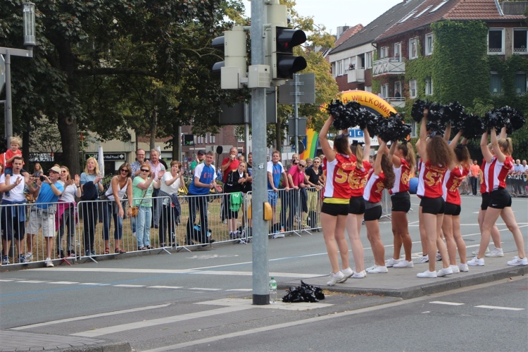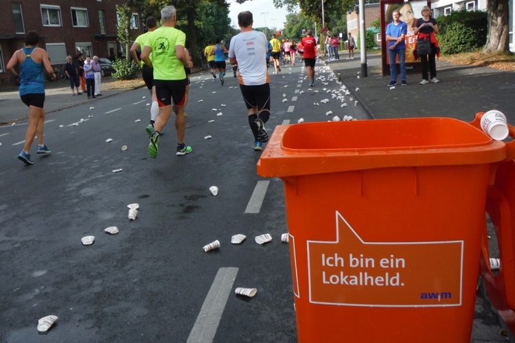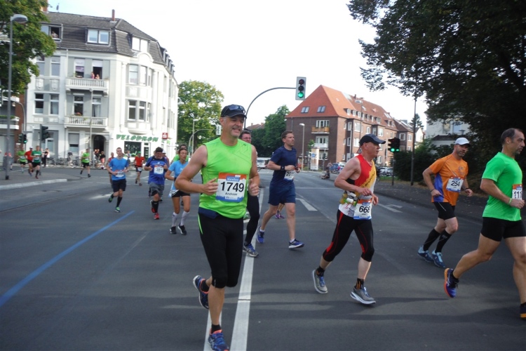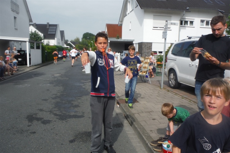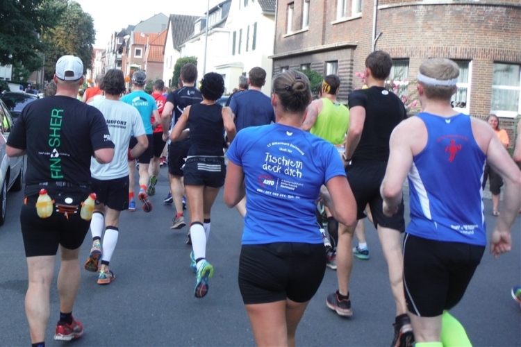 In diesem Wohnviertel stehen viele Zuschauer Spalier, wie fast überall an der Strecke. Sonnenblumen strahlen mit unserem Zentralgestirn um die Wette. Die Temperaturen sind noch angenehm, werden aber noch steigen. Von Wolken ist wenig zu sehen. Bei KM 5 fließt der Schweiß bereits kräftig, da kommt die erste Getränkestelle gerade recht. Trinken, trinken, trinken ist bereits angesagt und wird vom erfahrenen Pacemaker eindringlich empfohlen. Die ersten erfrischenden Duschen haben aufmerksame Zuschauer eingerichtet, sie werden gerne genutzt. Weiter geht es durch die Straßenschluchten des Kreuzviertels. Die Sonne steht noch nicht hoch genug, es gibt noch Schatten. Zurück auf der Promenade ist es auch die folgenden Kilometer so. Heute ist dieser Streckenabschnitt, auf dem sonst stündlich bis zu 1.200 Fahrräder unterwegs sind, den Läufern vorbehalten.