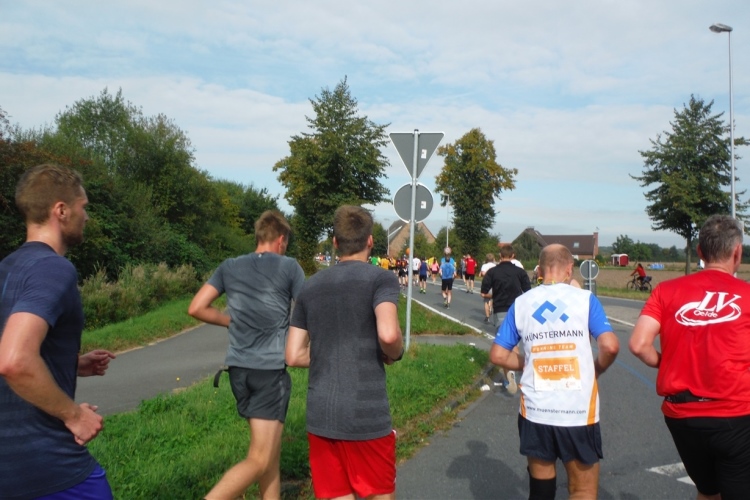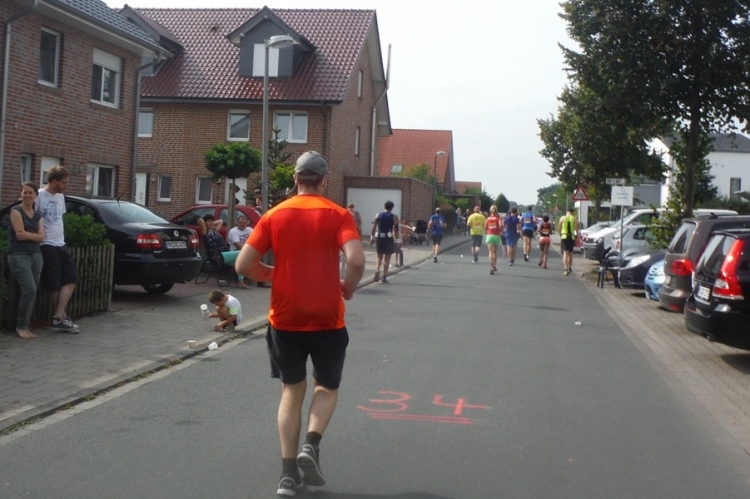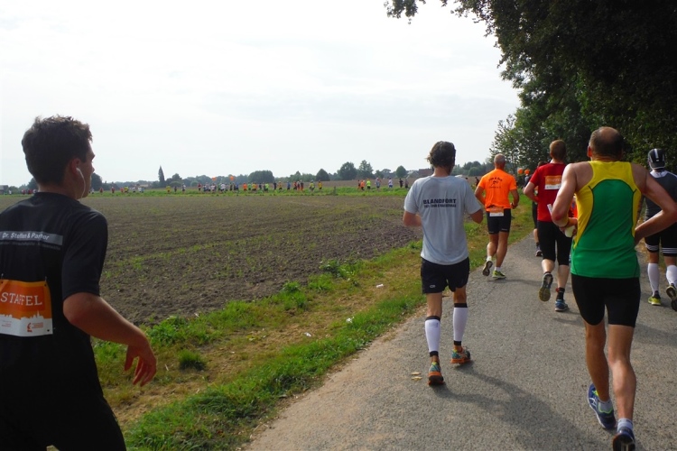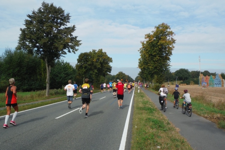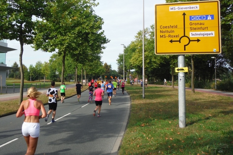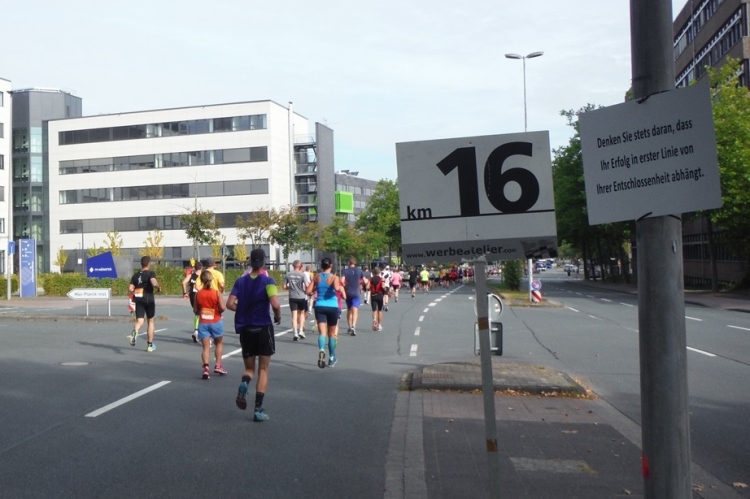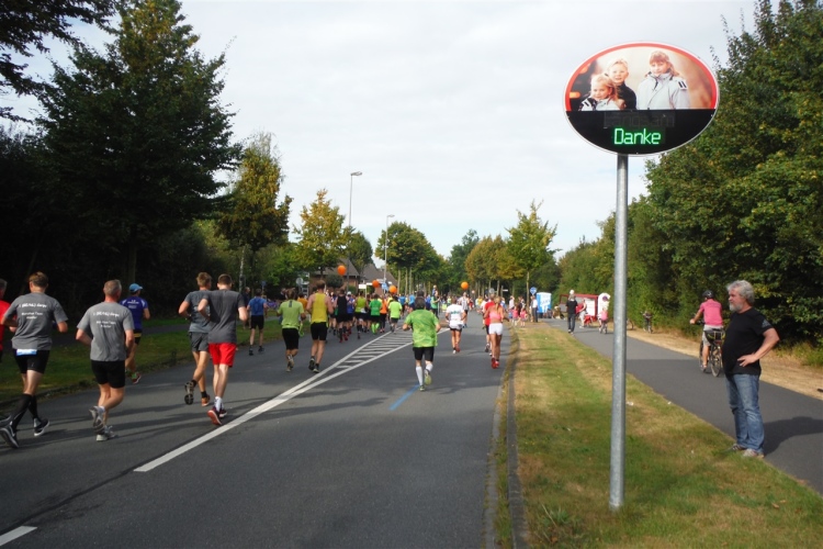 KM 15, ich bin auf dem äußeren Stadtring. Linker Hand beginnt ein größeres Universitätsgelände, das ich auf den nächsten Kilometern durchlaufen werde. Konzentriert sind hier Naturwissenschaften und Medizin. Ich nähere mich Gievenbeck und der nächsten Verpflegungsstelle. Trinken, trinken, trinken ist weiter das Gebot der Stunde. Pacemaker Manfred prophezeit, dass es heute noch sehr schwer werden wird und er soll Recht behalten. Das 30er-Schild mahnt zudem, nicht zu schnell zu werden. Ich bin voll im Soll, denn die Geschwindigkeitkontrolle dankt mir für meine Disziplin. Nach der Reizüberflutung in der Innenstadt geht es jetzt durch die Felder in Richtung Nienberge. Ich genieße diesen ruhigeren Streckenabschnitt, die Fotostopps werden weniger, dafür das Tempo gleichmäßiger.