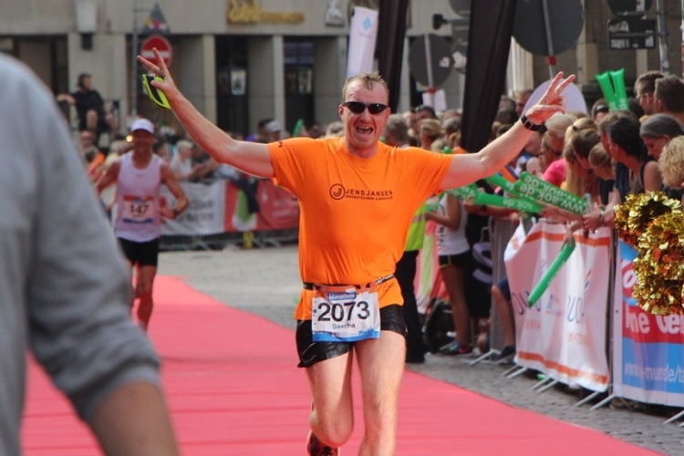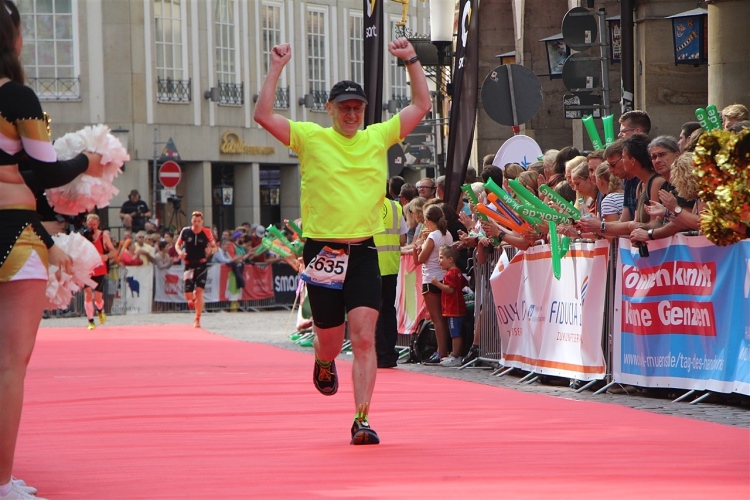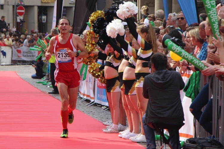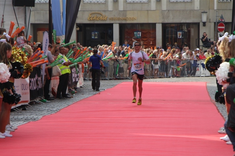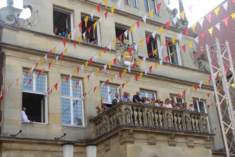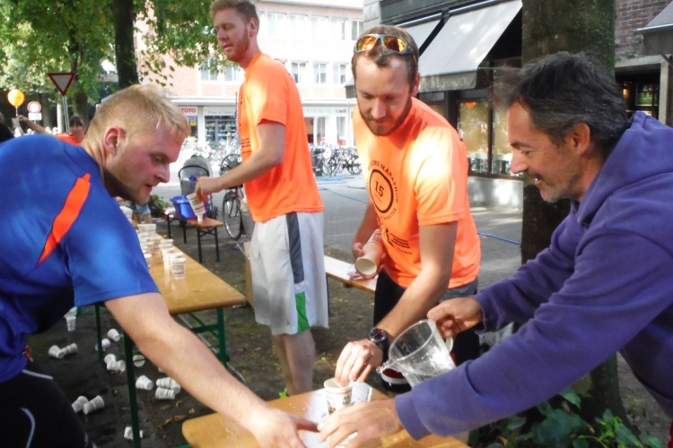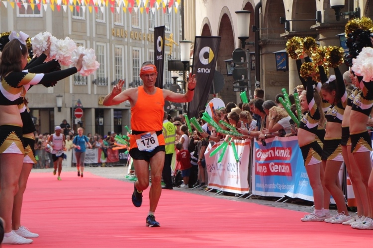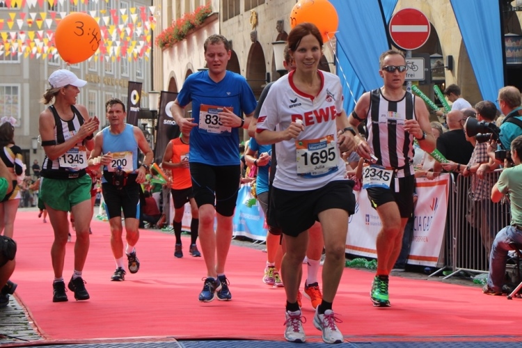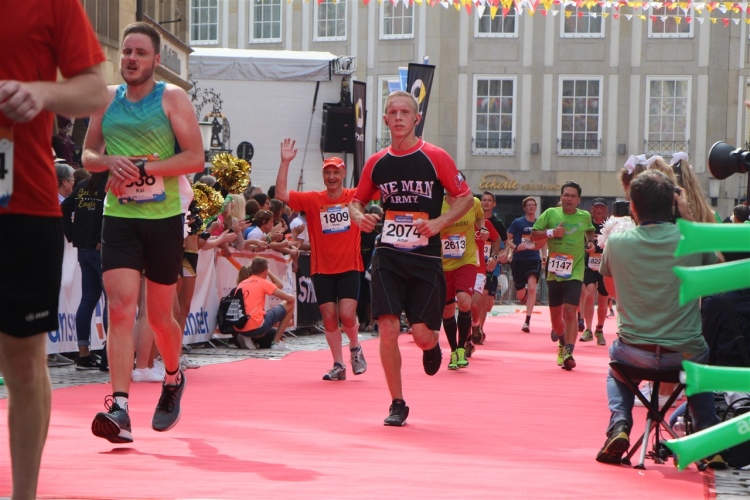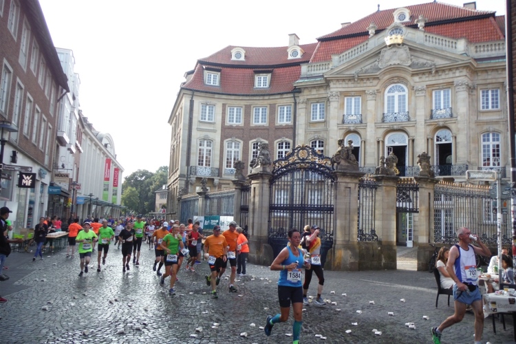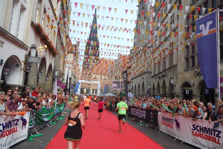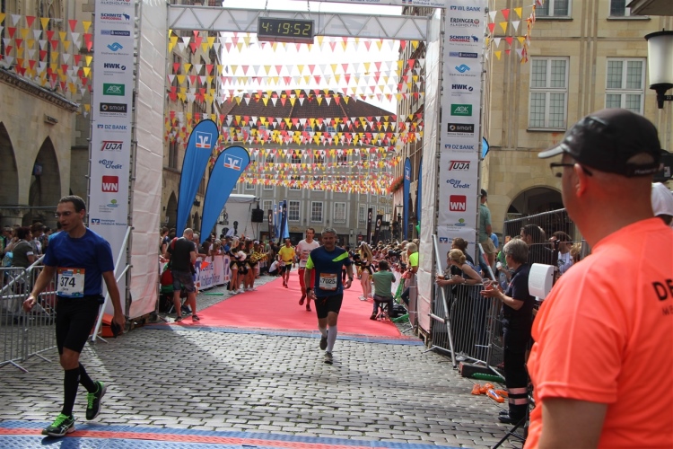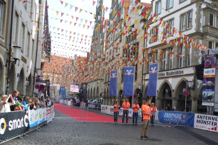 Ich erreiche den Prinzipalmarkt, die jubelnde Menge trägt mich ins Ziel. Nach Empfang der Medaille begebe ich mich schnurstracks auf den Weg zur Hopfenkaltschale, denn Labung tut Not. Der Andrang ist groß, aber es reicht für alle.