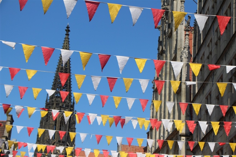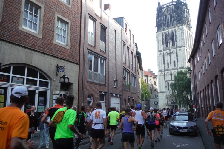 Nur noch zweimal rechts abbiegen und ich erblicke die Türme des alten Rathauses und der Stadtkirche St. Lamberti, Ausdruck des bürgerlichen Stolzes im mittelalterlichen Münster. Kurz vor KM 10 streife ich erstmals den Prinzipalmarkt, rechts grüßt das Rathaus mit seinem Friedenssaal, in dem 1648 das Ende des 30-jährigen Krieges besiegelt wurde.