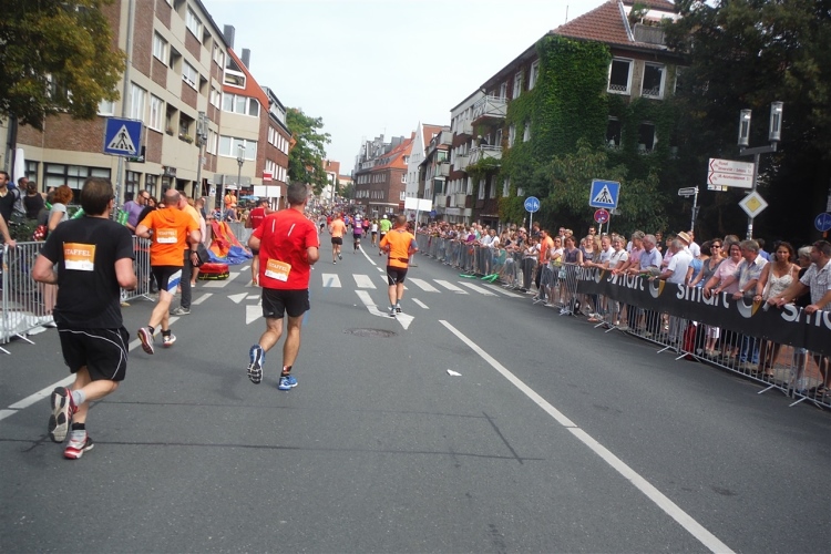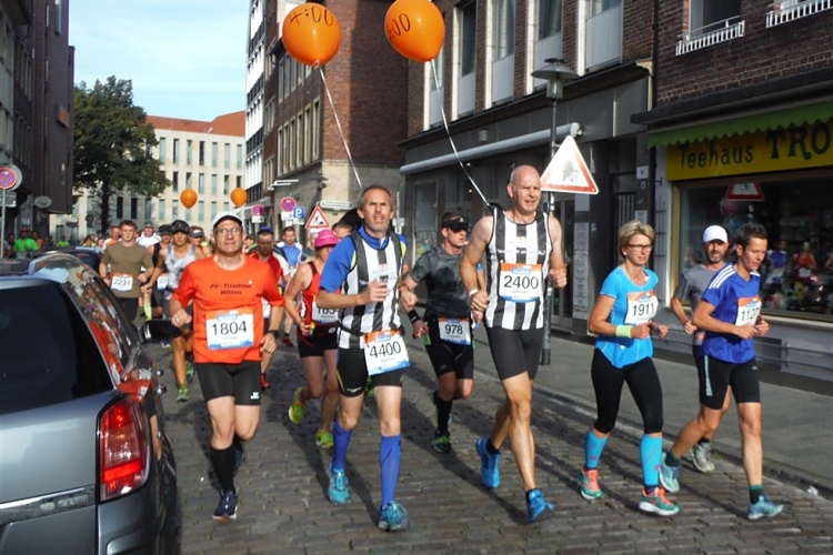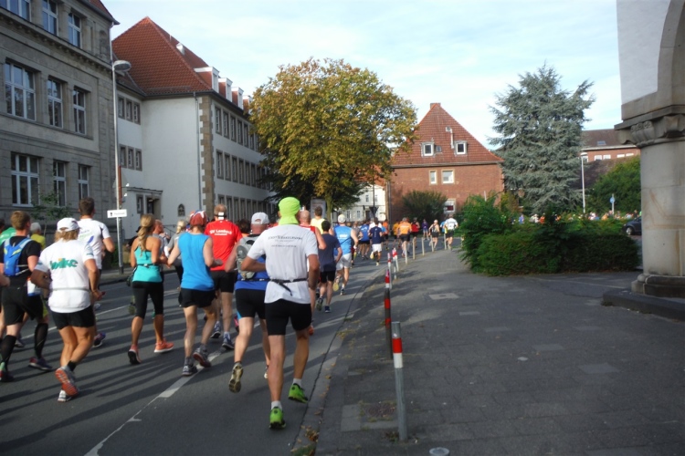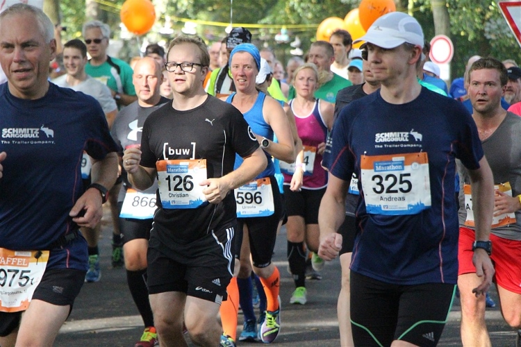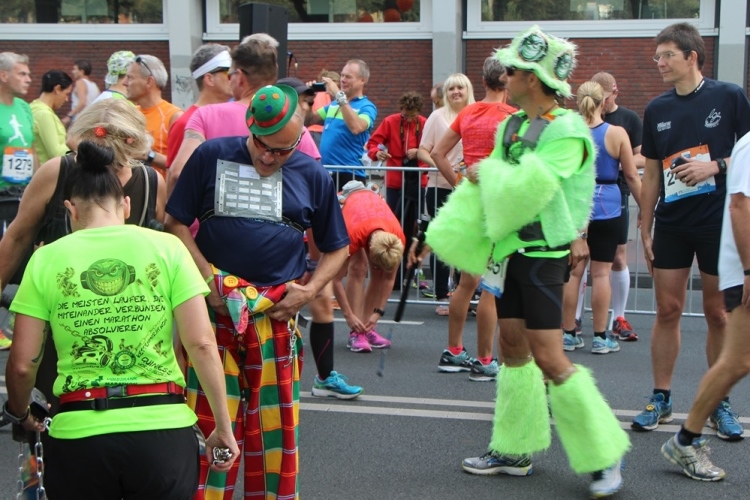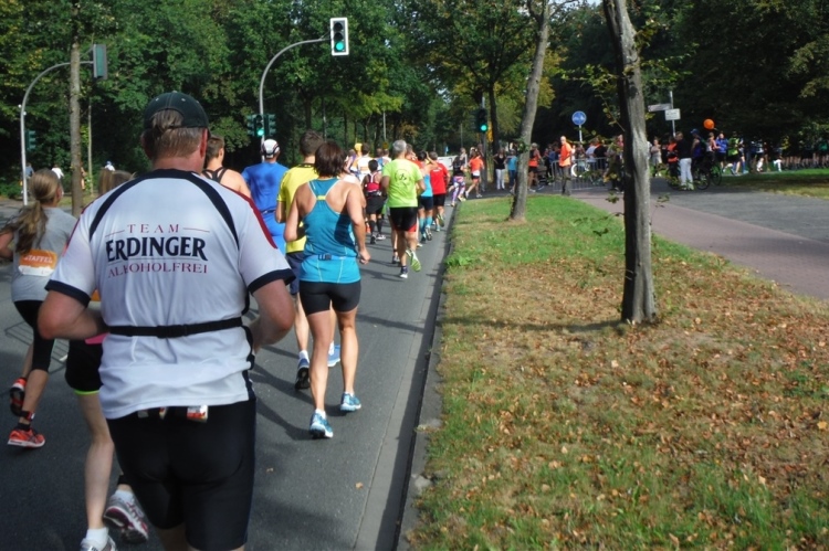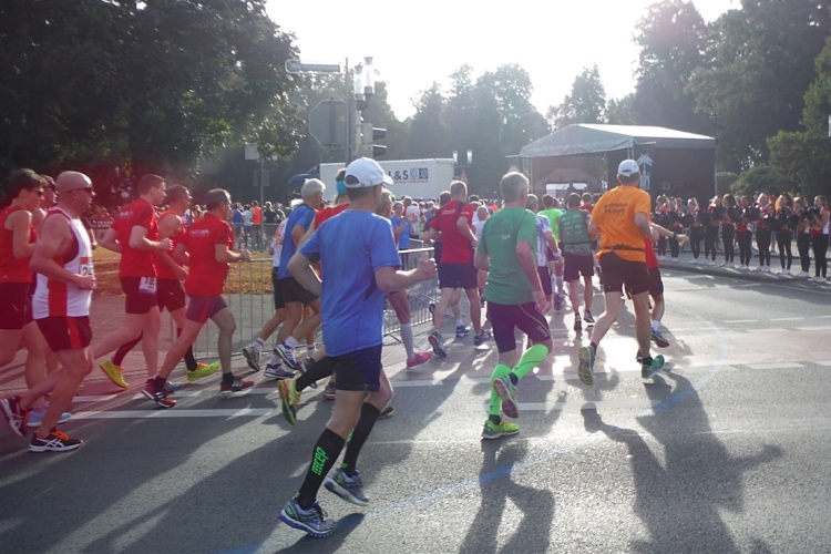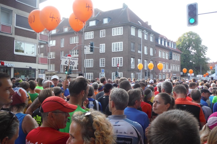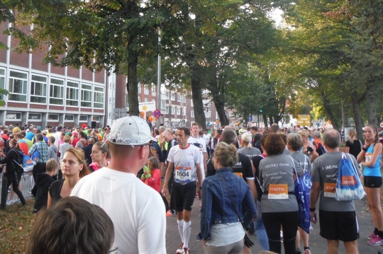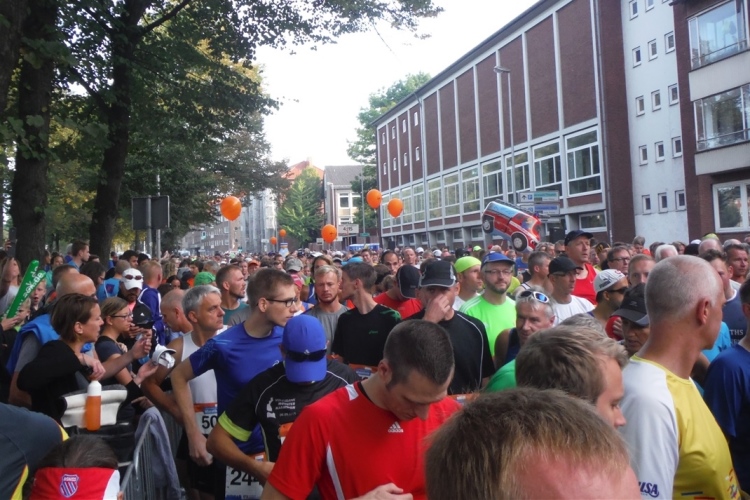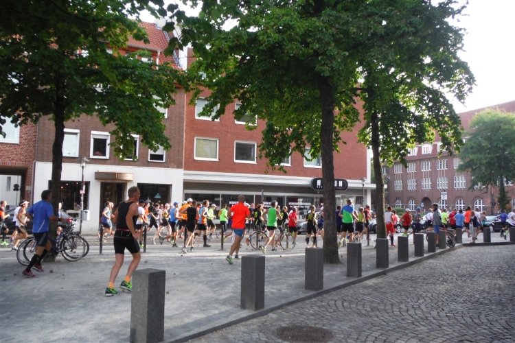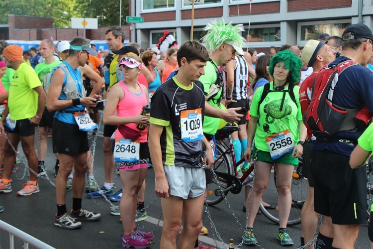 Über 8.500 Teilnehmer bewältigen den Rundkurs in Münster, wobei sich die meisten die Strecke als Staffel teilen. Trotz der vielen Menschen entdecke ich zahlreiche Bekannte, wie HaWe, Gerd oder Michael. HaWe und Gerd geht es dabei wie mir, auch sie können von der begeisternden Stimmung in Münster nicht genug bekommen und sind bei jeder Ausgabe mitgelaufen. Sie begleiten zudem traditionell die 5-Stundeläufer, weshalb ich mich schnell weiter nach vorne begebe, denn ich möchte noch einen Platz bei den Pacemakern für 4 Stunden ergattern. Der Startblock ist gut gefüllt, aber ein Plätzchen für mich bleibt noch. Gerade rechtzeitig bin ich angekommen, als die Menge mit dem Countdown beginnt und kurz darauf der Startschuß ertönt. Langsam kommt Bewegung ins Feld, dabei ist langsam wörtlich zu nehmen, denn bis zur Startlinie brauche ich schon eine knappe Minute.