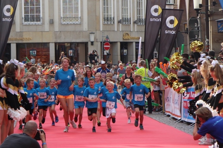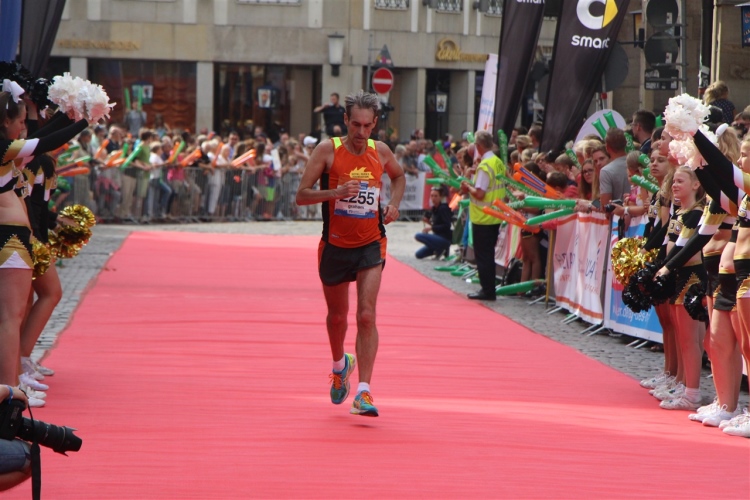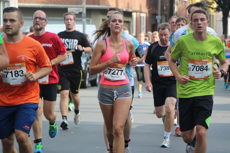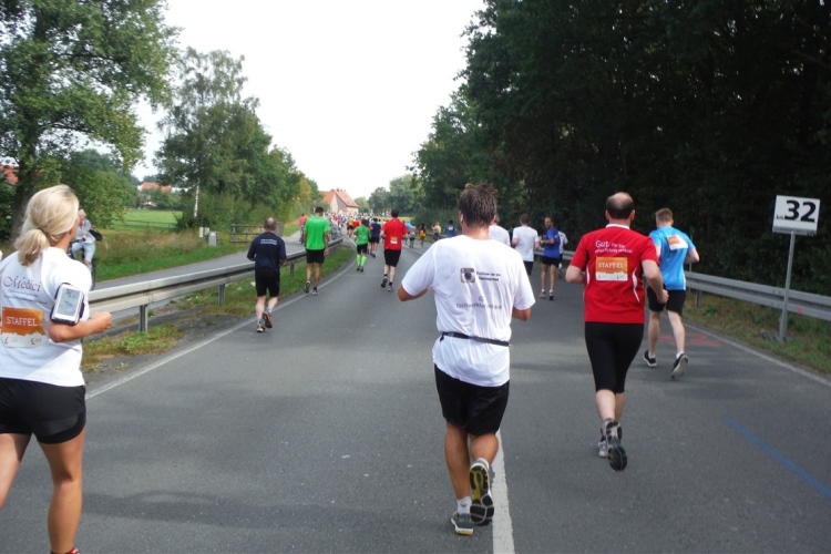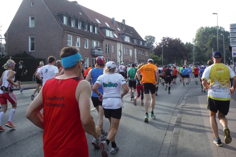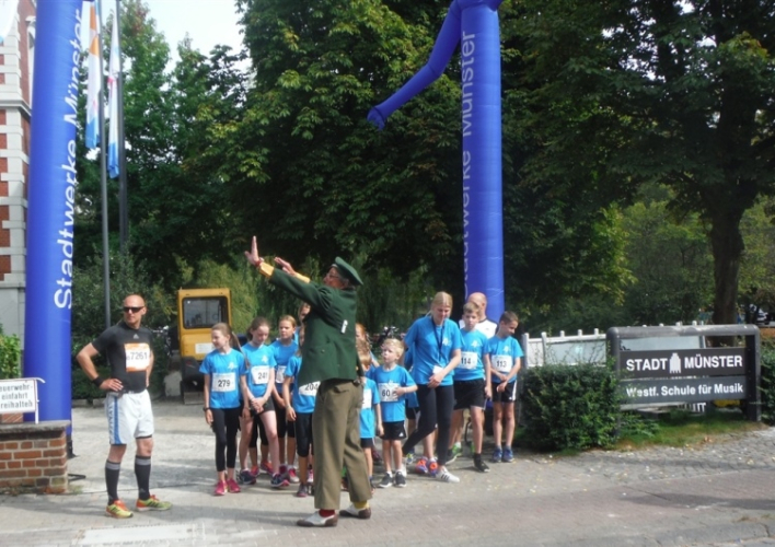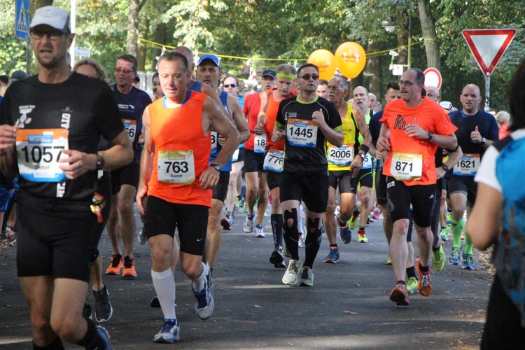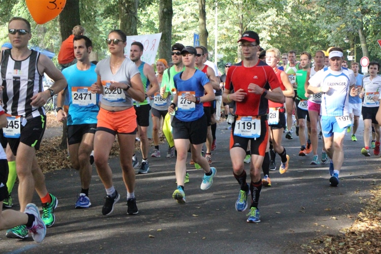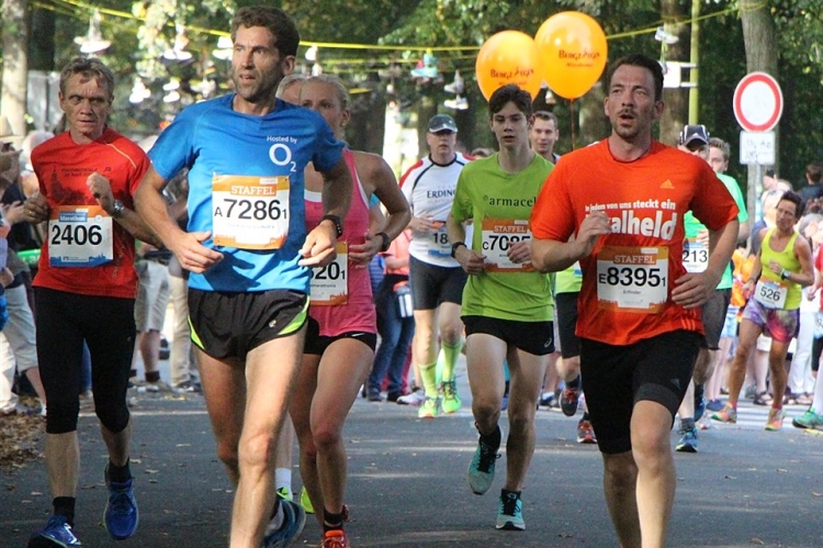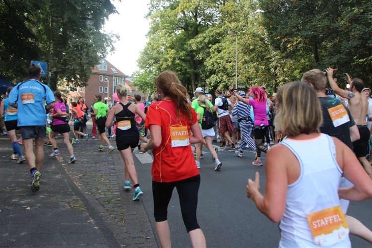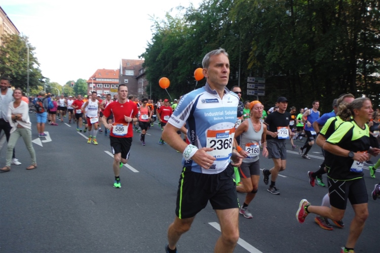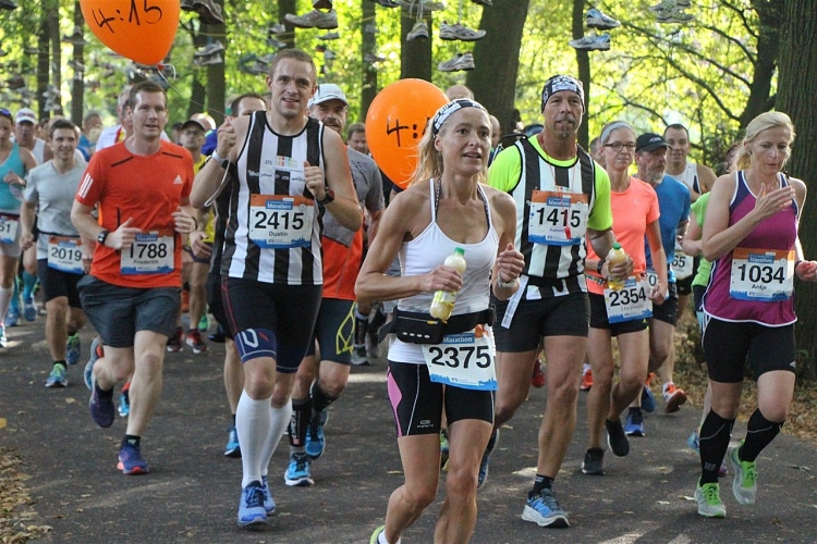Über 8.500 Teilnehmer bewältigen den Rundkurs in Münster, wobei sich die meisten die Strecke als Staffel teilen. Trotz der vielen Menschen entdecke ich zahlreiche Bekannte, wie HaWe, Gerd oder Michael. HaWe und Gerd geht es dabei wie mir, auch sie können von der begeisternden Stimmung in Münster nicht genug bekommen und sind bei jeder Ausgabe mitgelaufen. Sie begleiten zudem traditionell die 5-Stundeläufer, weshalb ich mich schnell weiter nach vorne begebe, denn ich möchte noch einen Platz bei den Pacemakern für 4 Stunden ergattern. Der Startblock ist gut gefüllt, aber ein Plätzchen für mich bleibt noch. Gerade rechtzeitig bin ich angekommen, als die Menge mit dem Countdown beginnt und kurz darauf der Startschuß ertönt. Langsam kommt Bewegung ins Feld, dabei ist langsam wörtlich zu nehmen, denn bis zur Startlinie brauche ich schon eine knappe Minute.