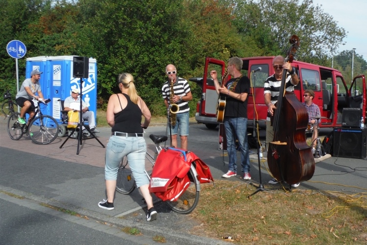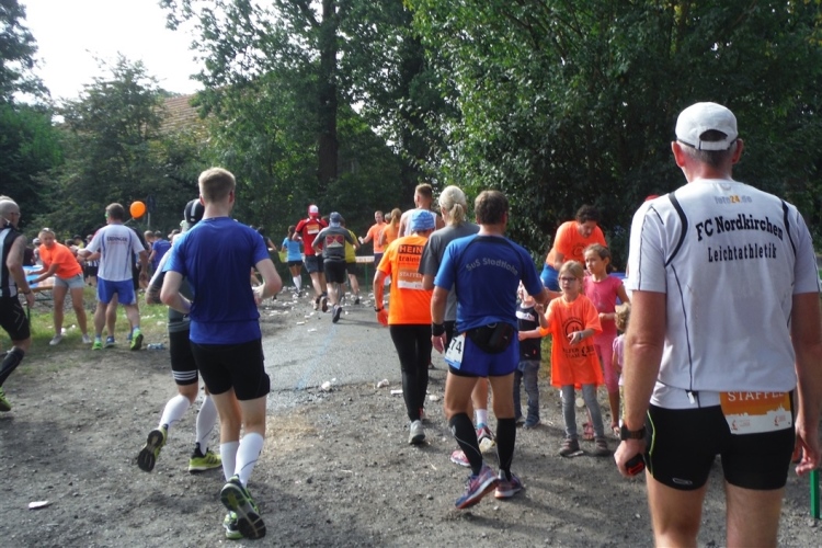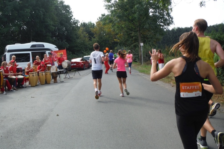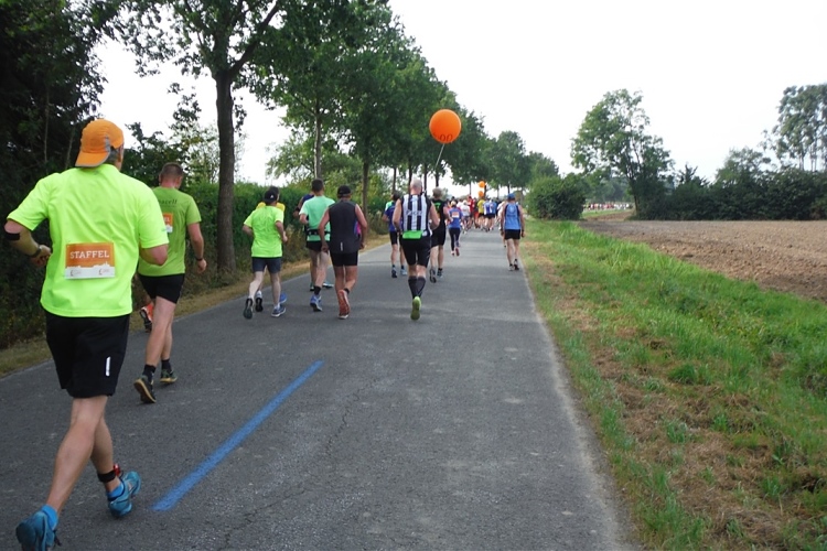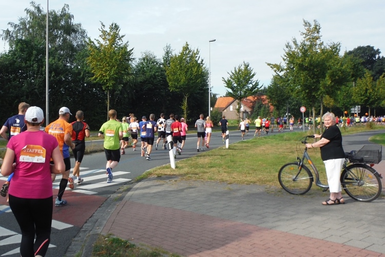 Ich verlasse Nienberge und mache mich auf den Weg nach Roxel. Selbst zwischen den Ortschaften finden sich immer wieder Fangruppen ein. KM 25: Haus Vögeding erfrischt mit seiner Verpflegungsstation. Die Band spielt „No, no, never“. Nein, die Devise des Tages werde ich nicht vergessen: Trinken, trinken, trinken. Frisch gestärkt laufe ich weiter Richtung Roxel. Die Windräder zeigen es an, es geht kein Lüftchen. Schatten ist rar auf diesem Streckenabschnitt.