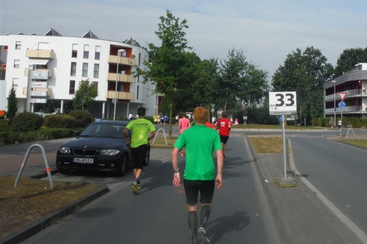 KM 31, der letzte Staffelwechsel. Immer noch warten viele Läufer auf ihre Staffelkameraden. Ich bin also gut dabei. KM 32, nächste Wasserstelle. Trinken, trinken, trinken. Auch wenn es nicht ganz so warm ist, wie angekündigt, höre ich nicht auf zu schwitzen. Doch dieser Zwischenstopp war etwas zu viel. Ich sehe die Ballons und mit ihnen meine Zielzeit 4 Stunden in der Ferne verschwinden. Die ersten längeren Gehpausen sind fällig. Vielen anderen geht es ebenso, sogar Staffelläufern. Ich biege nach links ab. Gievenbeck empfängt die Läufer. Viele junge Familien sind hier hin gezogen. Das erfordert natürlich auch neue Infrastrukturen, weshalb ein Gymnasium aus der Innenstadt hierhin verlegt wurde. Das Gynasium erstrahlt rechts in leuchtendem Grün. Die Umzäunung des Geländes ist farblich angepasst.