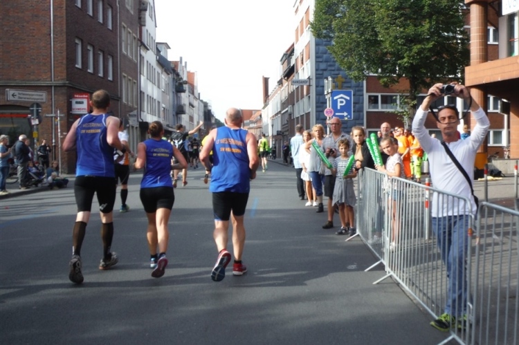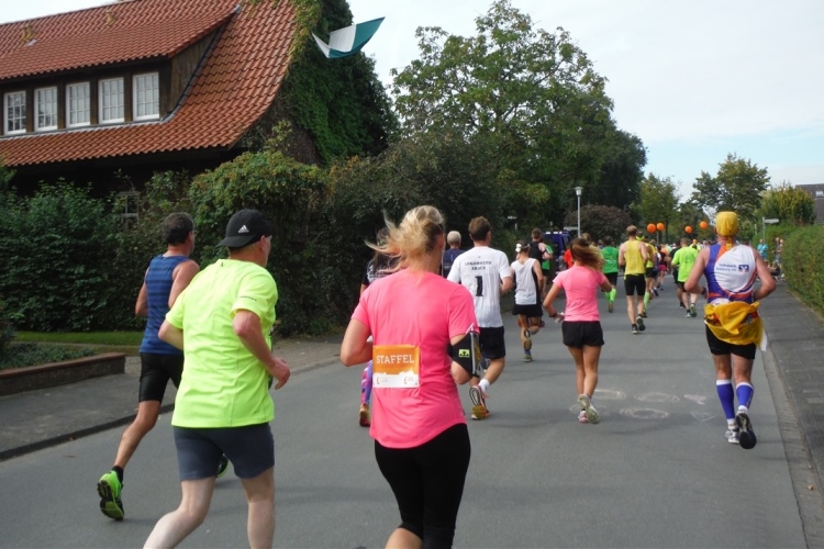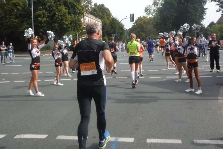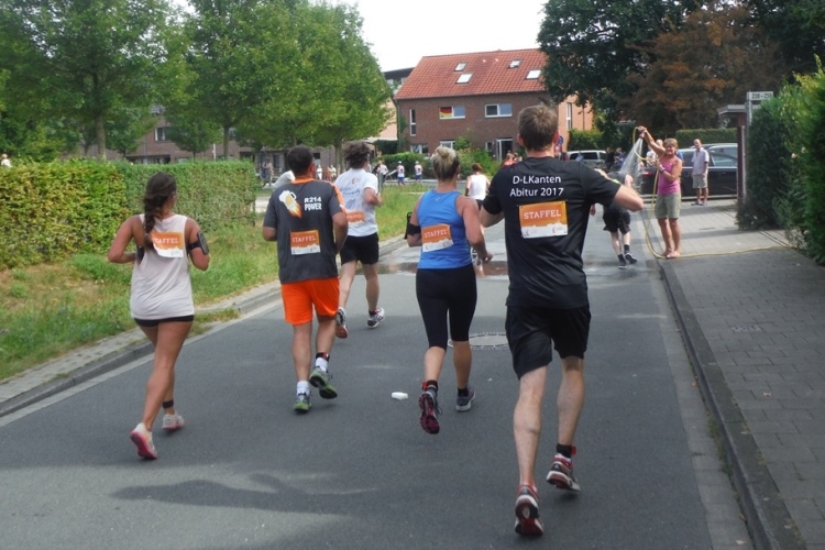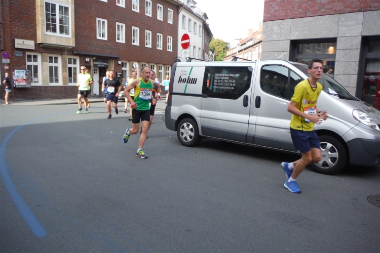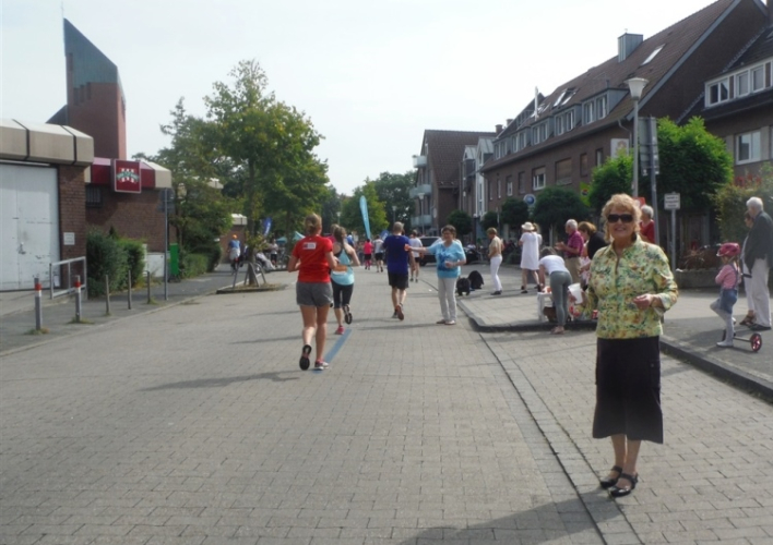 Rechts grüßt meine persönliche Mannschaft, feuert mich an und kommt unserem Fotoauftrag nach. Am Buddenturm, einem der letzten erhaltenen Stadttürme, verlasse ich die Promenade erstmal und begebe mich auf eine Runde im Kreuzviertel. Auf der Lazarettstraße habe ich 4 KM bewältigt, 25 Minuten bin ich unterwegs. Die ersten Staffelläufer, die 15 Minuten nach uns gestartet sind, holen uns bereits ein. Ja, wer nur etwa 10 Kilometer läuft sollte auch entsprechend schnell unterwegs sein.