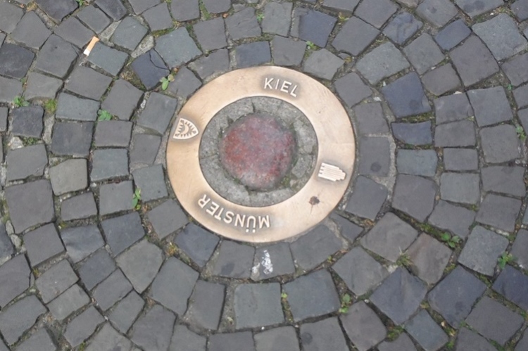 Über den krummen Timpen kommend biege ich in die Frauenstraße ein. Vor mir erhebt sich die Überwasserkirche, die Spitze ihres Turmes fehlt allerdings. Einmal fiel sie den Wiedertäufern im 16. Jahrhundert und einmal, Anfang des 18. Jahrhunderts, einem Sturm zum Opfer. Ein drittes Mal wollten die Münsteraner einen Wiederaufbau nicht riskieren. Links neben der Kirche erhebt sich die neue Diözesanbibliothek. Wem das Lernen dort zu trocken ist, braucht nicht weit zu laufen. Auf der linken Seite grüßt die Traditionsbrauerei Pinkus Müller und schafft leicht Abhilfe. Für ein leckeres Bierchen ist es für mich zu früh, noch bin ich leichten Fußes unterwegs und will das ausnutzen. Zusätzlich spornt mich das Lob für unsere Seite, das ich hier von rechts und links bekomme, gerade richtig an. Grüße an Klaus, Anton und Joe werden mir mit auf den Weg gegeben und sind hiermit überbracht. Botengänger war auch der Kiepenkerl, an dessen Denkmal ich hier vorbei laufe. Neben dem Austausch für Waren sorgten die Kiepenkerle im Münsterland auch für den Austausch von Nachrichten und Gerüchten. Ich weiß zwar nicht, wie schnell diese unterwegs waren, mein Tempo ist aber noch so hoch, dass ich bereits auf die Neubrückenstraße einbiege und neben dem modernen Stadttheater auch die evangelische und die Martinikirche passiere. Sakralbaute werde ich heute noch zahlreich zu Gesicht bekommen, wen wundert‘s, hat Münster doch insgesamt 80 davon zu bieten.