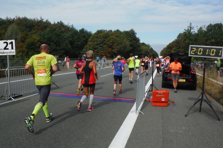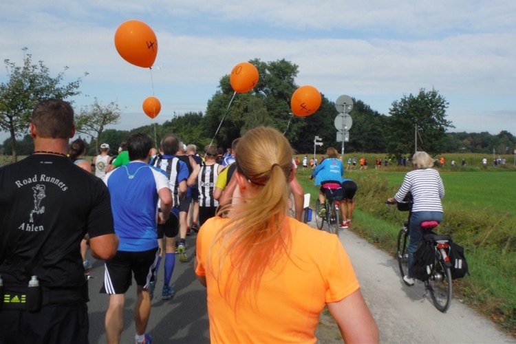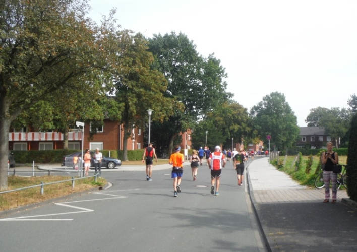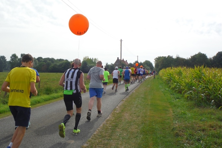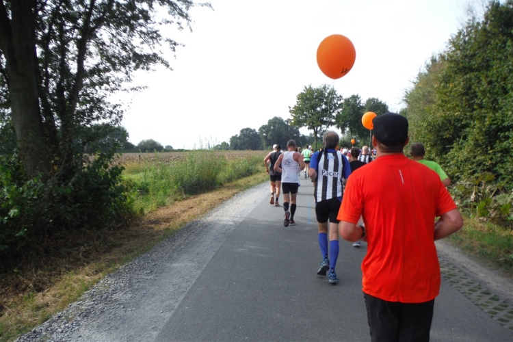 KM 19, Uhrenkontrolle, ich bin voll im Soll für 4 Stunden. Die Ballons der Pacer habe ich immer im Blick. Nur an den Verpflegungsstationen muß ich etwas abreißen lassen. Noch kann ich es ausgleichen und erreiche so kurz nach der Halbmarathonmarke Nienberge.