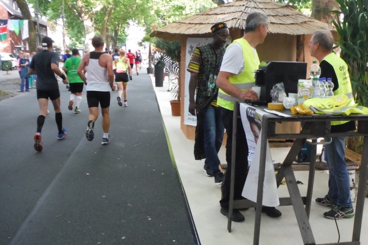 Mit Regen ist heute nicht zu rechnen. Erst recht nicht bei KM 13,5, dort sind wir nämlich in Afrika. Jedenfalls lautet so das Motto des Powerpoints. Vorbei geht es an Bambushütten, Elefanten, Zebras und Giraffen. Anschließend erreiche ich den Startbereich des Kidsmarathons. Zahlreiche Kiddies warten bereits, um von hier aus die finalen 1,5 KM der Strecke ins Ziel zurücklegen zu dürfen. Da könnte man glatt tauschen. Aber ich habe für das gesamte Vergnügen bezahlt und werde deshalb auch die ganze Strecke auskosten. Es würde mir auch viel entgehen, denn die nächste Trommlergruppe und Verpflegungsstation warten schon.