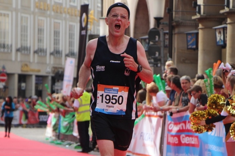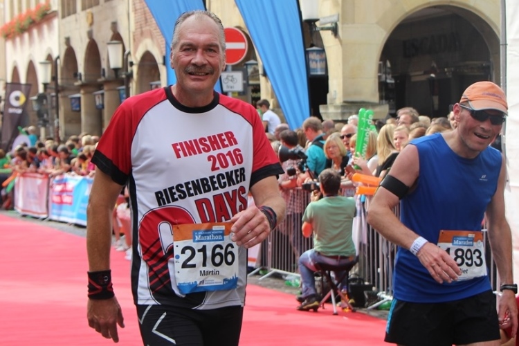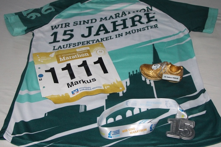 Als man mir das Finisher-Shirt überreicht, erlebe ich eine tolle Überraschung. Als Treueläufer, der alle Marathons in Münster mitgelaufen ist, bekomme ich zusätzlich einen kleinen goldenen Schuh. Eine tolle Idee, die so richtig passt zu diesem wieder überragenden Marathon. Da darf man ja gespannt sein, was sich die Veranstalter in den kommenden Jahren noch einfallen lassen.