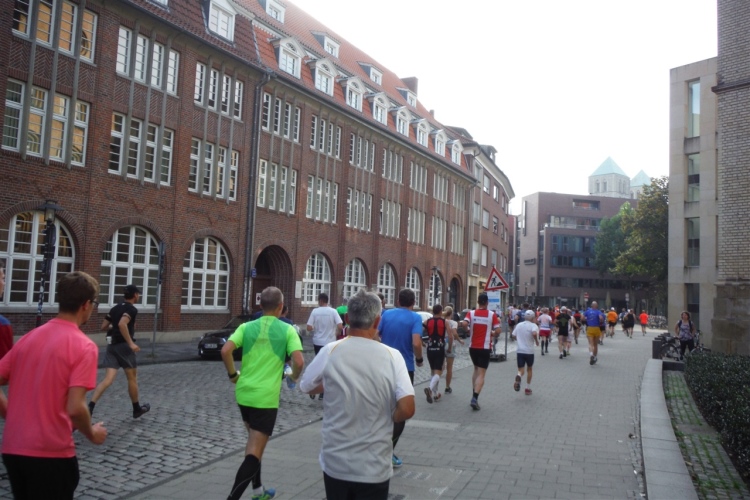 Nach und nach mischen sich immer mehr Staffelläufer unter die Marathonis. Bei den jetzt idealen Bedingungen läuft es wie geschmiert, da könnte man das Trinken schon mal vergessen. Die freundlichen Helfer, heute sind wieder über 1.000 an der Strecke, lassen das nicht zu und recken mir das kühle Nass entgegen. KM 8 liegt hinter mir, als ich die Promenade für heute verlassen muß. Nach rechts biege ich zum Ludgeriplatz ab. Vor mir liegt die Ludgerikirche, die dem ersten Bischof Münsters geweiht ist. Viele Zuschauer feuern uns an. Die Ballons der 4-Strunden-Läufer fest im Blick, biege ich in die Klosterstraße ein. Links klatschen ein paar Nonnen Beifall, während ich die Synagoge von Münster bewundere.