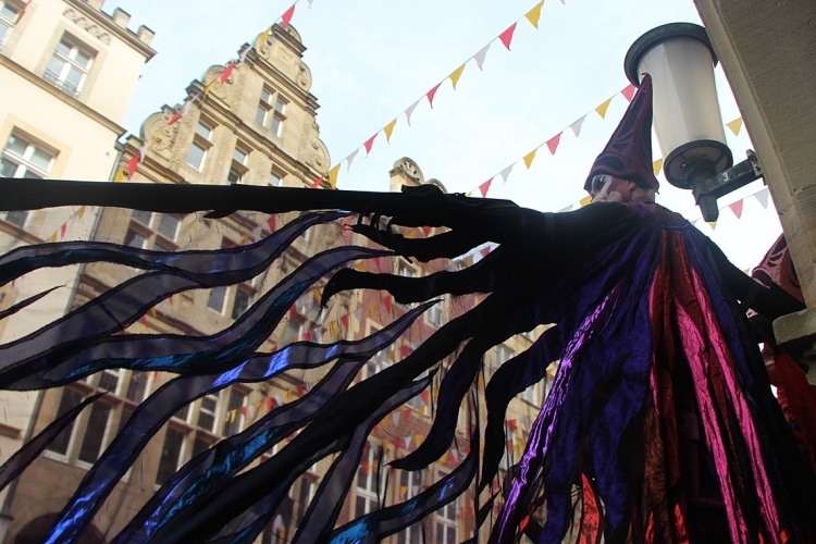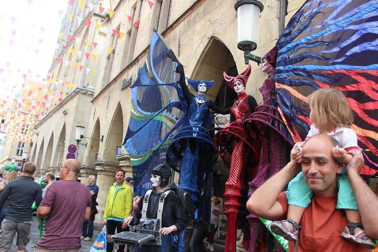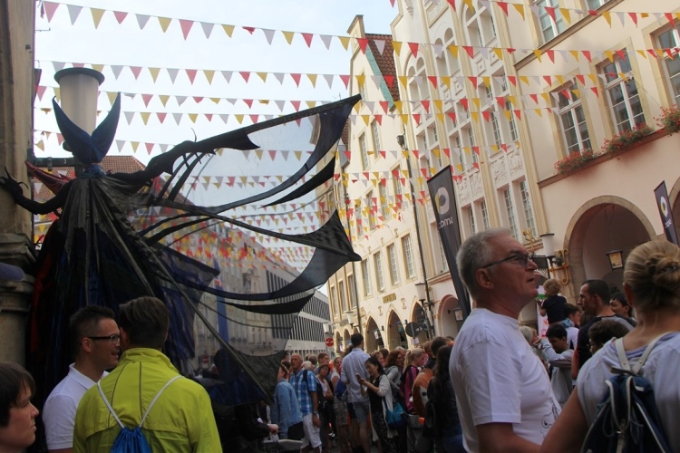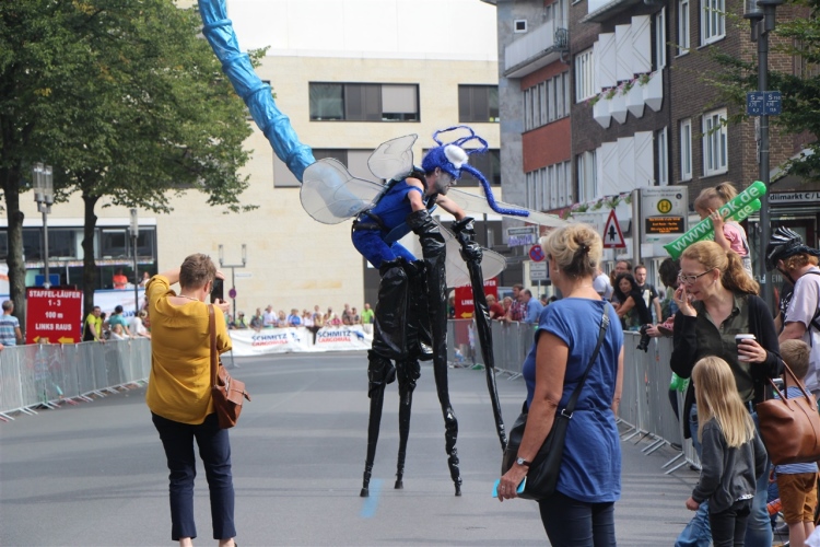 Jetzt kann ja nicht mehr viel passieren. Oder wollen mich die als Libellen verkleideten Stelzenläufer am Ende der Aegidistraße aufhalten? Sicher nicht, denn ich habe genug Platz, um in die Rothenburg einzubiegen. An der rechten Häuserwand ist eine Weltzeituhr mit Glockenspiel. Darauf mag ich nicht warten. Gedanklich bin ich schon einige Meter weiter.