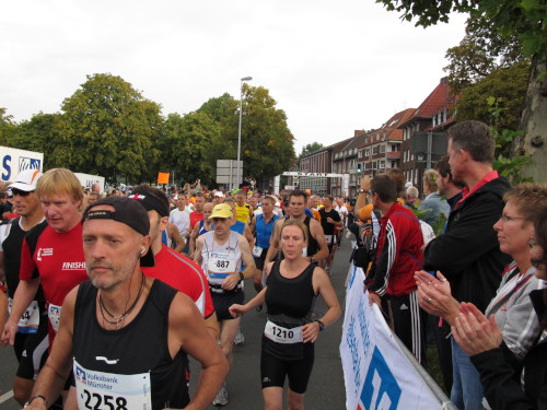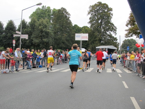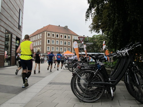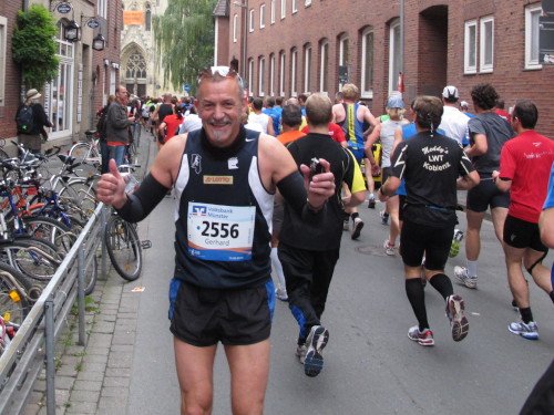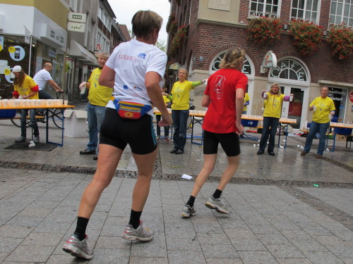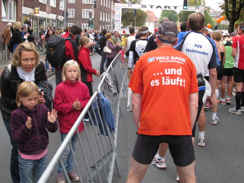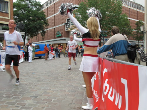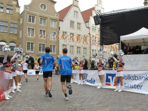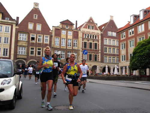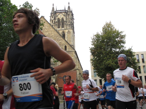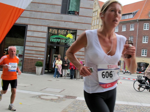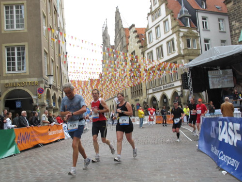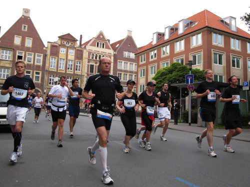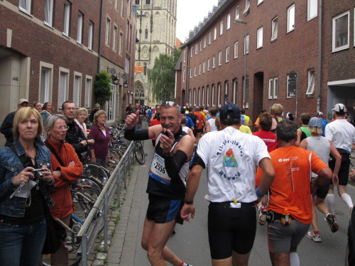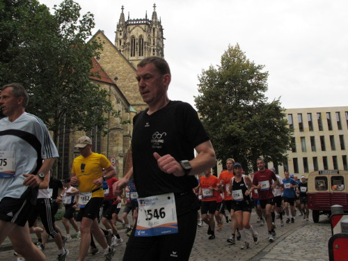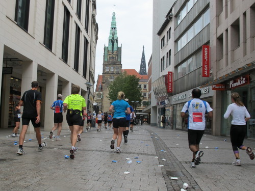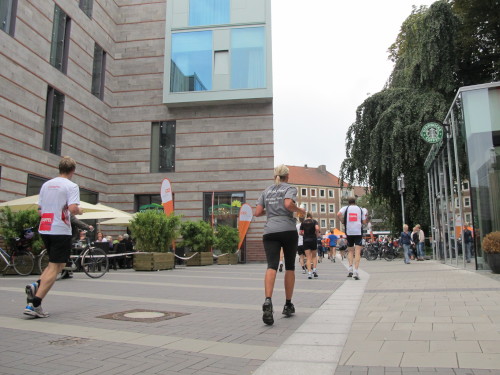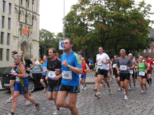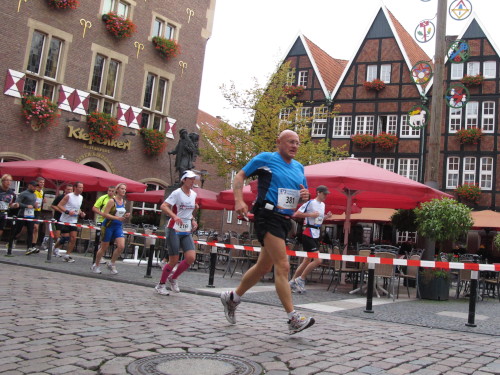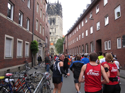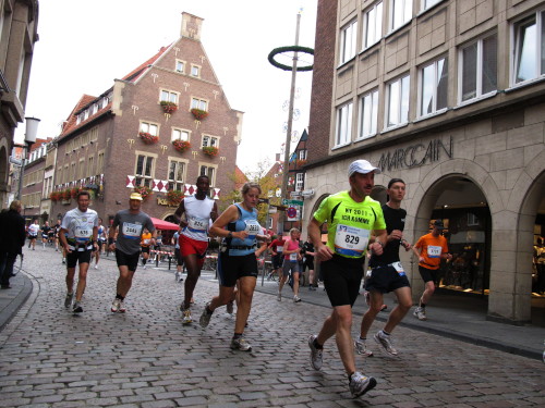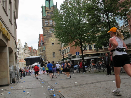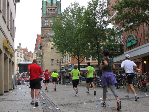 Einige Kilometer weiten sind wir in der nördlichen Peripherie gelandet, immer begleitet von engagierten Frühaufstehern am Straßenrand. Das Feld hat sich sortiert, man läuft entspannt, lediglich ein paar hektische Staffelläufer schaffen es nicht, ohne Körperkontakt zu überholen. Dann sind wir im Zentrum, passieren das Treff-Hotel, wo das Personal Ausschau nach der Chefin hält. Dann kommt der Stadthausturm mit der großen Showbühne und man kann schon einmal einen zaghaften Blick auf den Prinzipalmarkt werfen. Hier schlägt das Herz der Marathon-City, schon jetzt sind viele Zuschauer da. Gleich neben dem Stadthausturm steht übrigens das Rathaus, in dem 1648 der Westfälische Frieden ausgehandelt wurde, der den dreißigjährigen Krieg beendete.