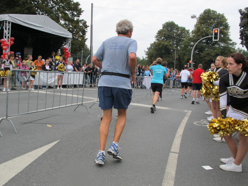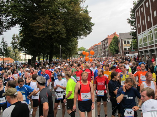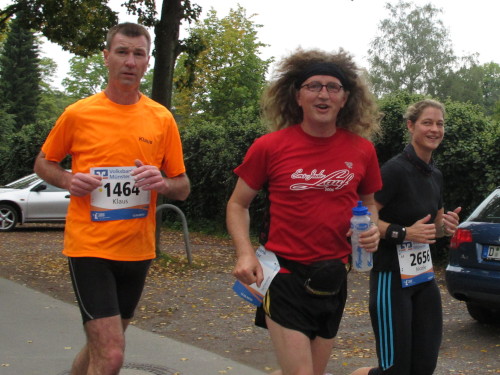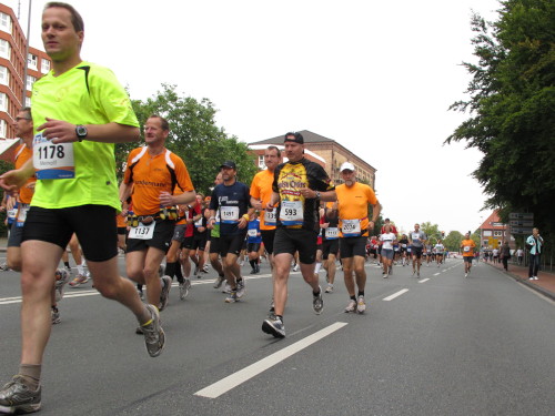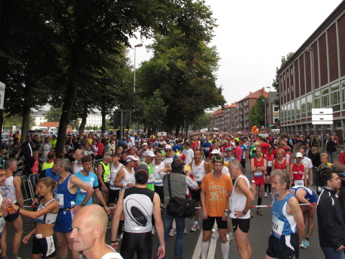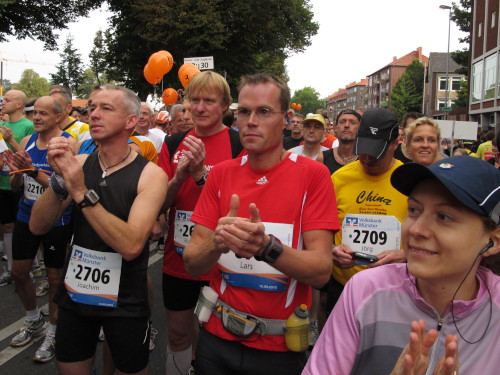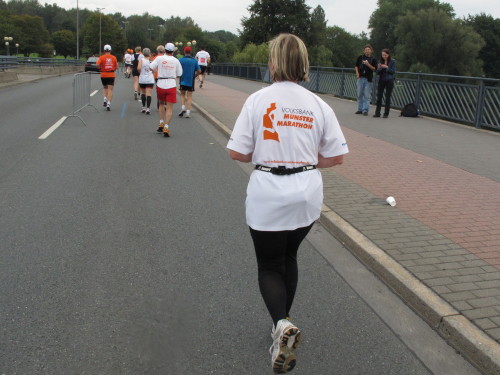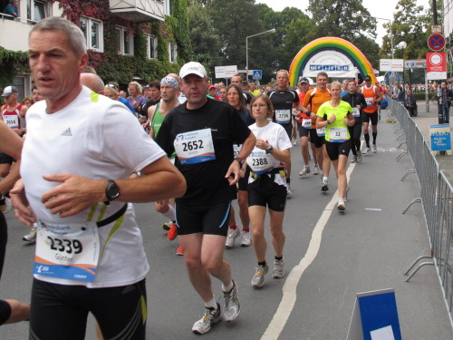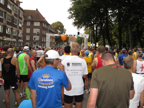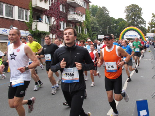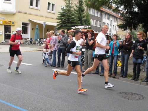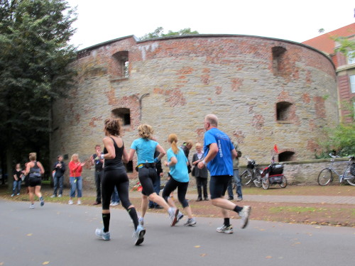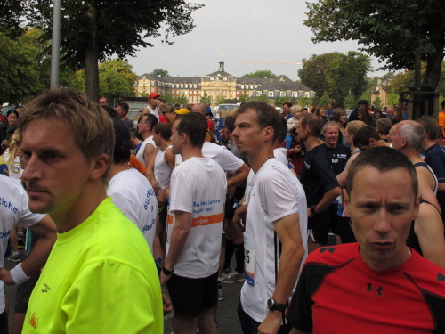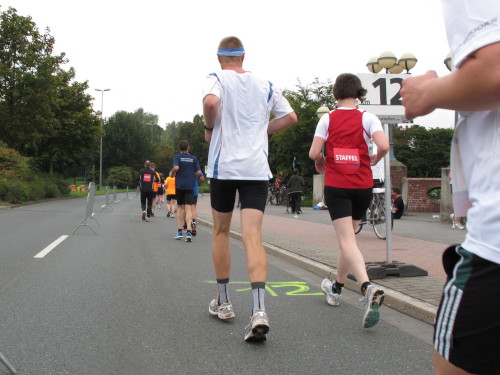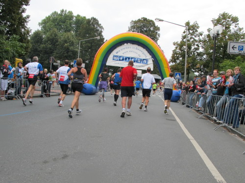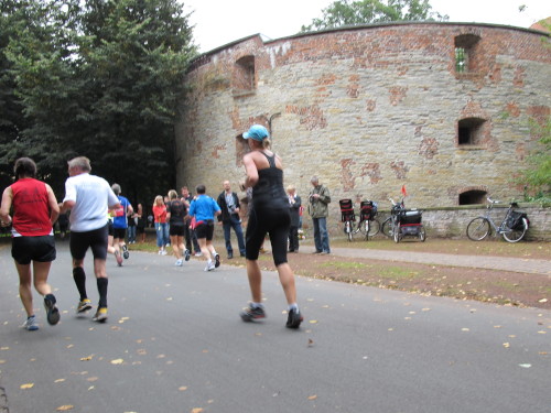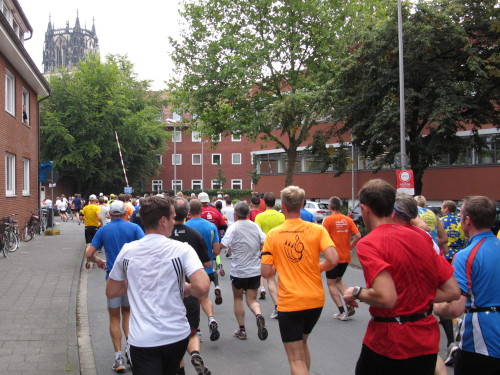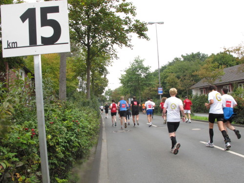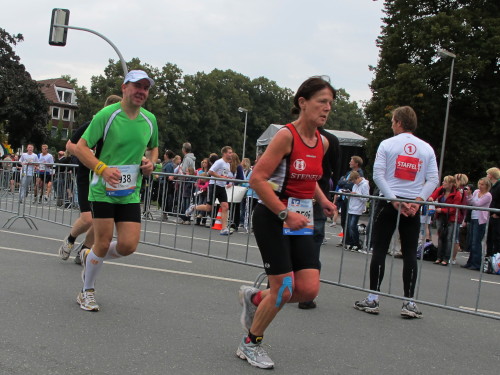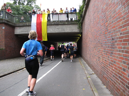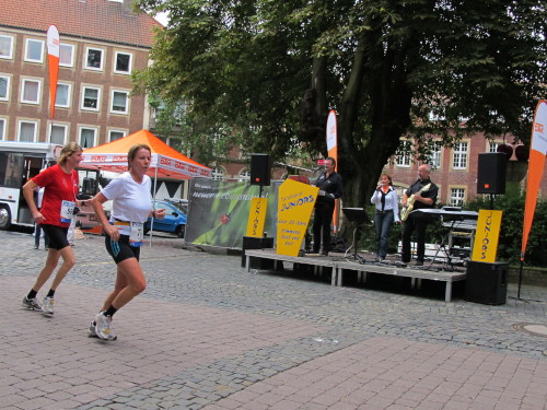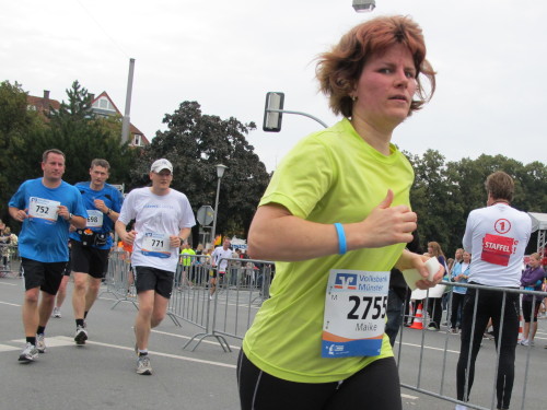 Einige Kilometer weiten sind wir in der nördlichen Peripherie gelandet, immer begleitet von engagierten Frühaufstehern am Straßenrand. Das Feld hat sich sortiert, man läuft entspannt, lediglich ein paar hektische Staffelläufer schaffen es nicht, ohne Körperkontakt zu überholen. Dann sind wir im Zentrum, passieren das Treff-Hotel, wo das Personal Ausschau nach der Chefin hält. Dann kommt der Stadthausturm mit der großen Showbühne und man kann schon einmal einen zaghaften Blick auf den Prinzipalmarkt werfen. Hier schlägt das Herz der Marathon-City, schon jetzt sind viele Zuschauer da. Gleich neben dem Stadthausturm steht übrigens das Rathaus, in dem 1648 der Westfälische Frieden ausgehandelt wurde, der den dreißigjährigen Krieg beendete.
