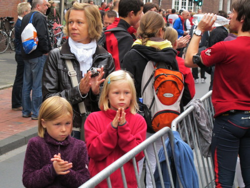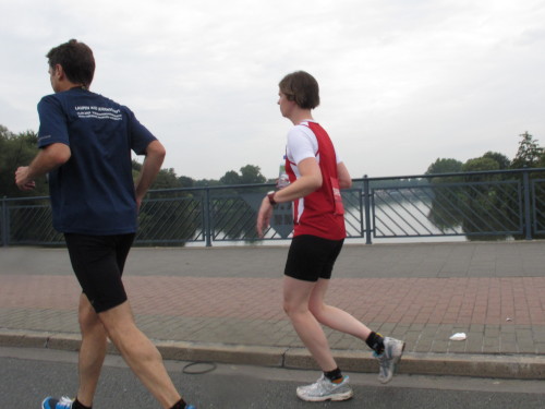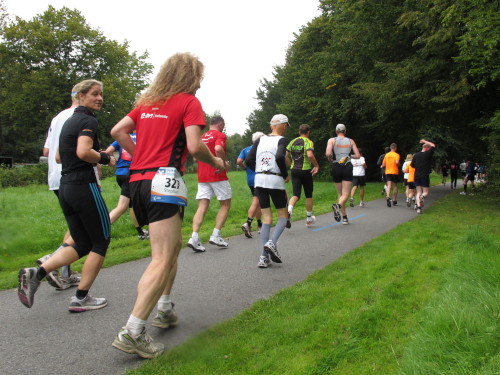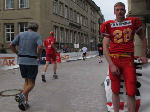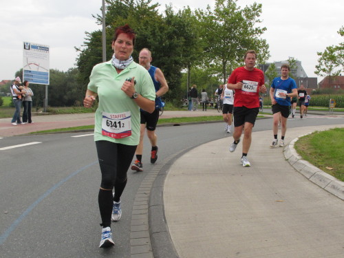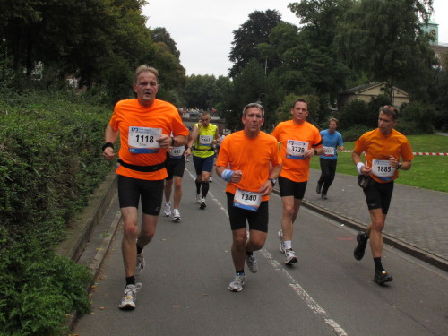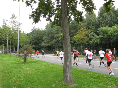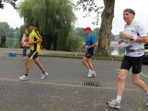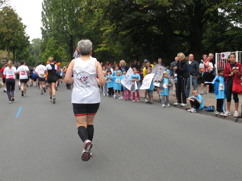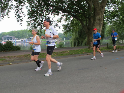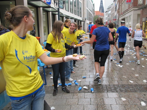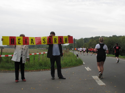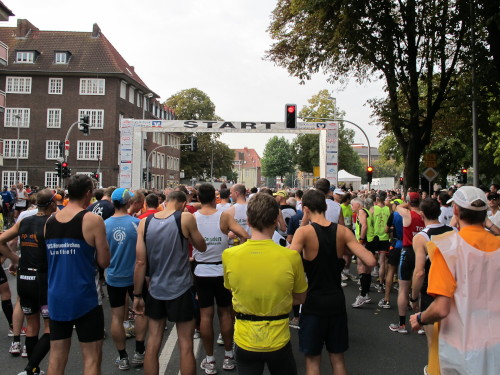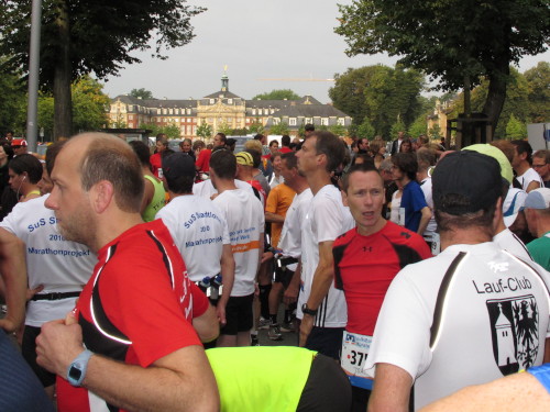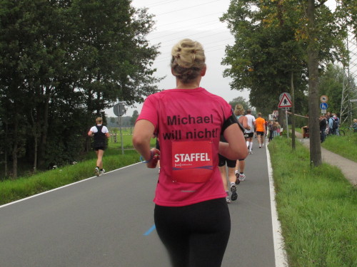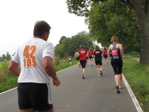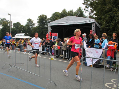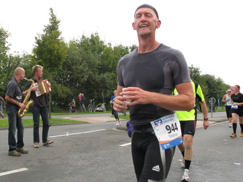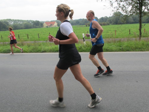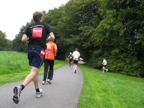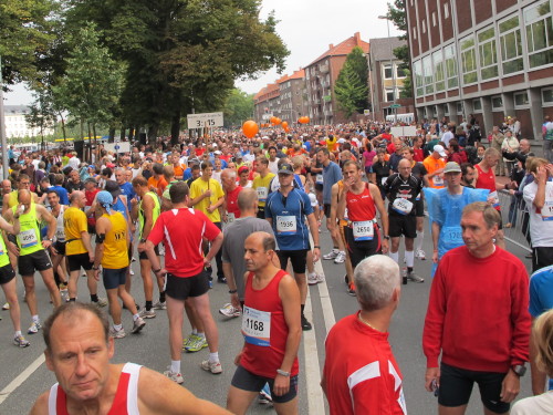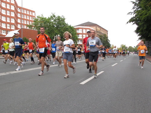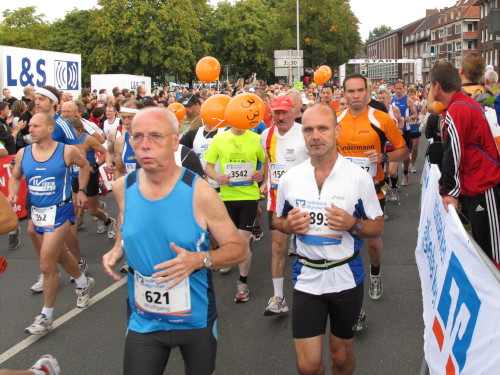 Einige Kilometer weiten sind wir in der nördlichen Peripherie gelandet, immer begleitet von engagierten Frühaufstehern am Straßenrand. Das Feld hat sich sortiert, man läuft entspannt, lediglich ein paar hektische Staffelläufer schaffen es nicht, ohne Körperkontakt zu überholen. Dann sind wir im Zentrum, passieren das Treff-Hotel, wo das Personal Ausschau nach der Chefin hält. Dann kommt der Stadthausturm mit der großen Showbühne und man kann schon einmal einen zaghaften Blick auf den Prinzipalmarkt werfen. Hier schlägt das Herz der Marathon-City, schon jetzt sind viele Zuschauer da. Gleich neben dem Stadthausturm steht übrigens das Rathaus, in dem 1648 der Westfälische Frieden ausgehandelt wurde, der den dreißigjährigen Krieg beendete.