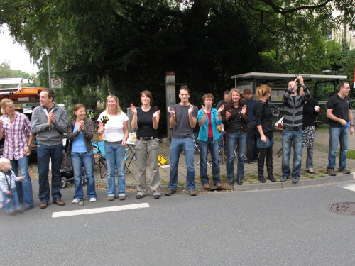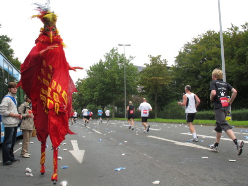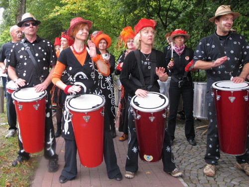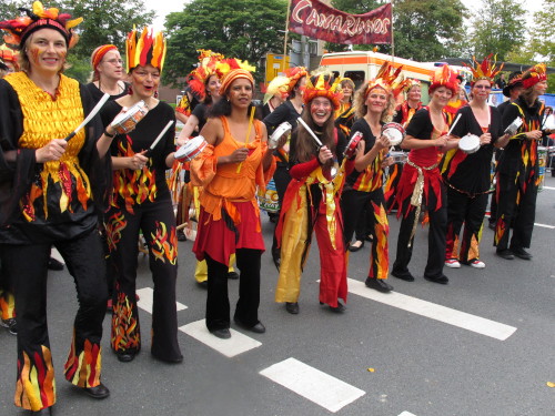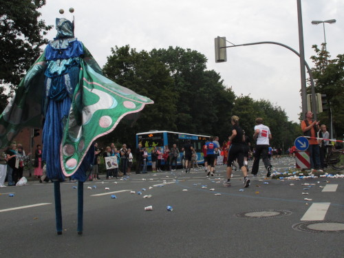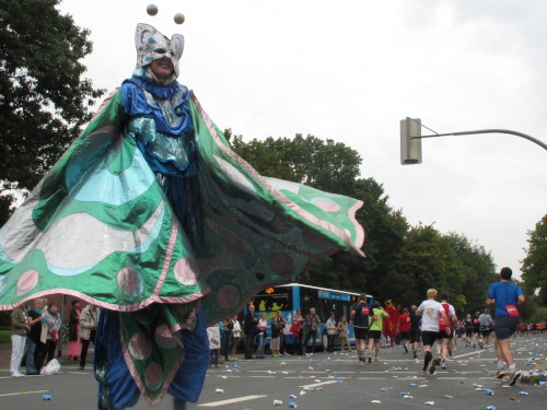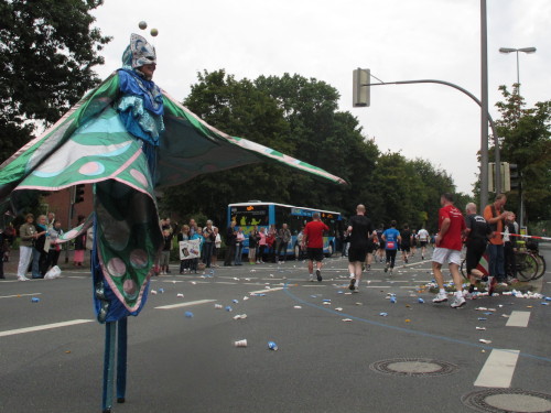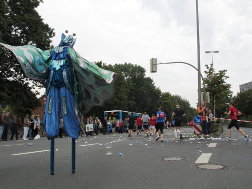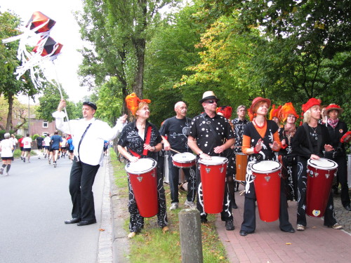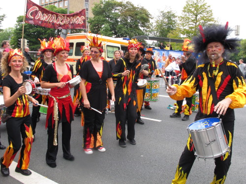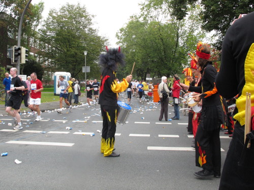 Gleich versteht man sein eigenes Wort nicht mehr, solchen Lärm machen die Trommler der Canarinhos und die begeisterten Zuschauer. Gleichzeitig haben wir eine erste Begegnung mit einer Münsteraner Besonderheit, den Stelzenläufern. In bunten, phantasievoll gestalteten Kostümen, hier zum Beispiel ein Feuervogel, sind sie für Läufer und Zuschauer gleichermaßen eine Attraktion.