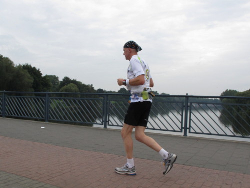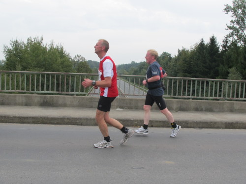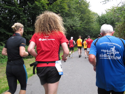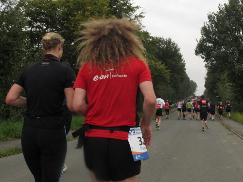 Den Läufer im roten Hemd vor mir glaube ich zu kennen. Nur die Mähne, die an Tina Turner erinnert, irritiert mich noch. Obwohl wir gerade mal 12, 13 Kilometer gelaufen sind, kriegt der seine Füße kaum hoch. Ultra-Schlappschritt nennt man das in Fachkreisen. Dann ist klar, er ist’s, der Steppenhahn, Internet-Pionier in Sachen Laufen. „Komm her Stephan, ich mach ein Foto, dann kommst Du mal auf ´ne gescheite Seite.“ „Ja, mach mal, hab extra meine Haare gewaschen“, dazu lacht er noch. Wie’s zu dem üppigen Kopfschmuck kommt, will ich wissen. „40 Monate nicht zum Friseur gegangen.“ Donnerwetter, 400 Euro gespart bei dem Tarif, den ich mit meinen Resthaaren bezahlen muss.