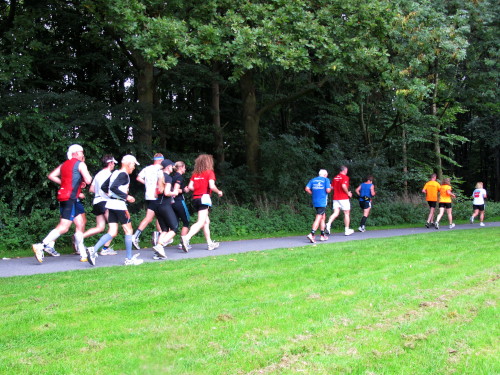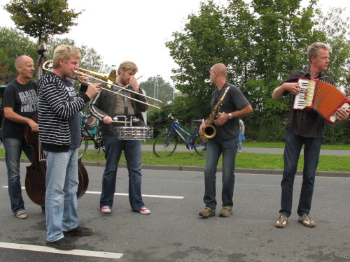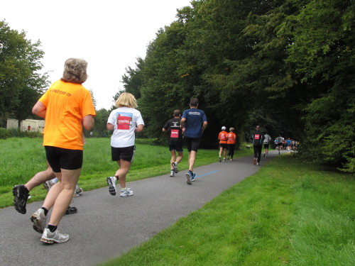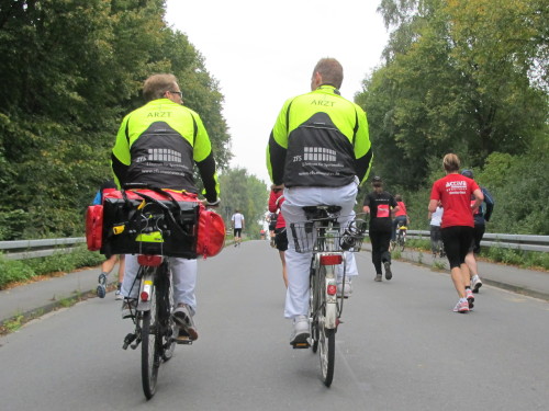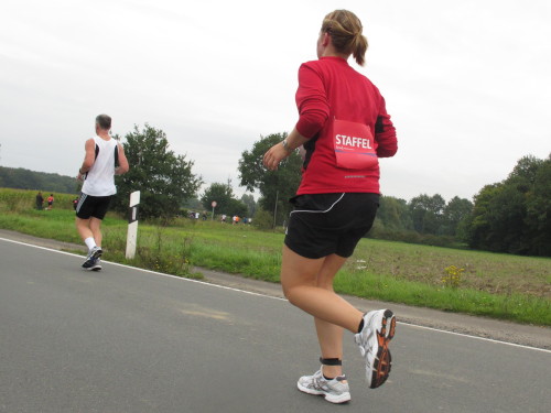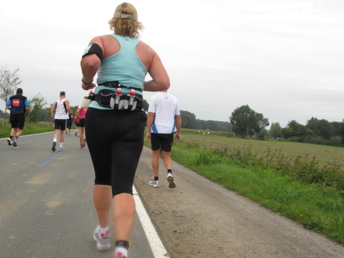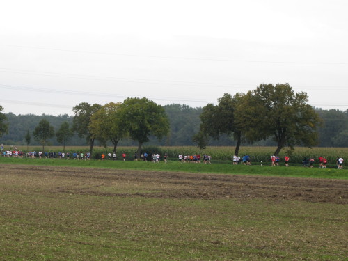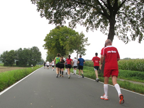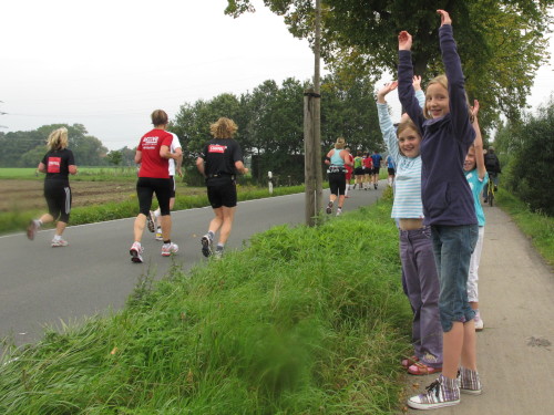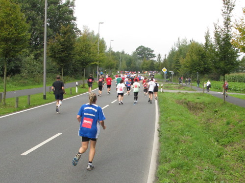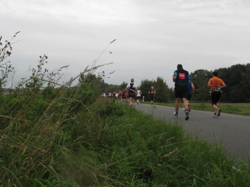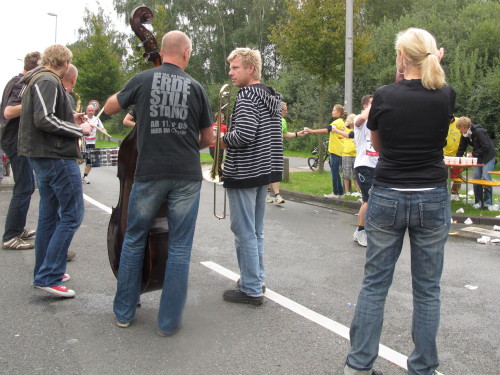 Km 15, wir sind beim Technologiehof, Münsters erste Adresse für Technologie-Unternehmen und Startups und dann auf der Mendelstraße in Richtung Gievenbeck. Bei einer der unzähligen Getränke- und Verpflegungsstellen gibt’s handgemachten Jazz vom Feinsten. Den westlichen Stadtteil sparen wir aber zunächst aber noch aus und laufen rechts in die Felder nach Nienberge. Die Brücke über die B 54 ist die einzige nennenswerte Steigung des Tages. Zwei Ärzte auf Rädern fahren die Strecke ab. Für sie gibt es heute nichts zu tun.