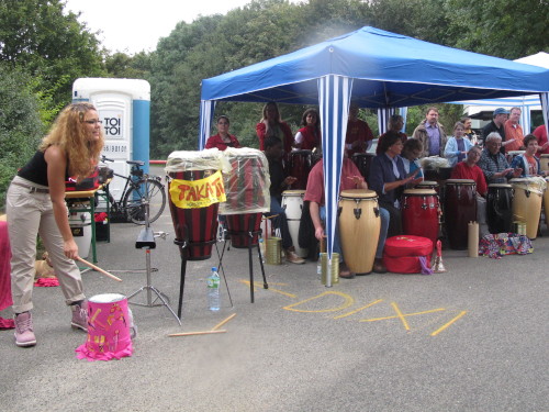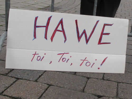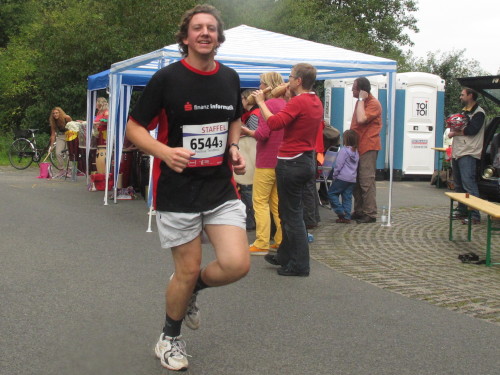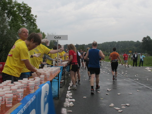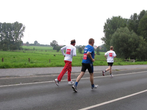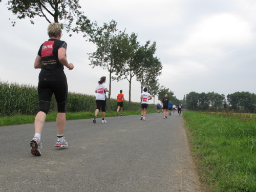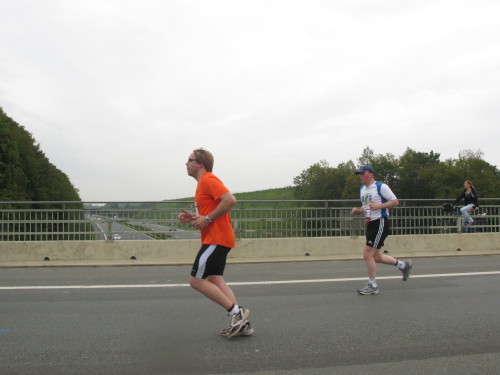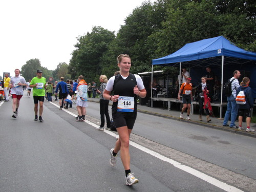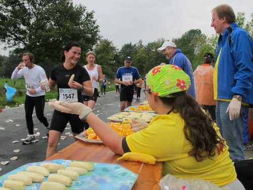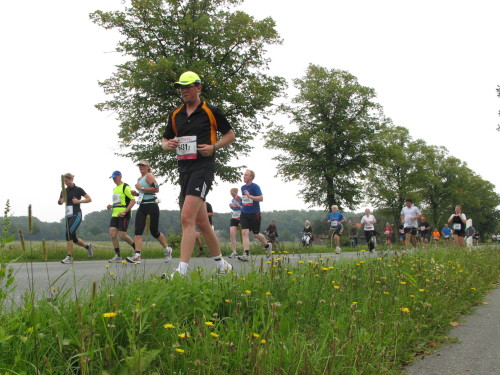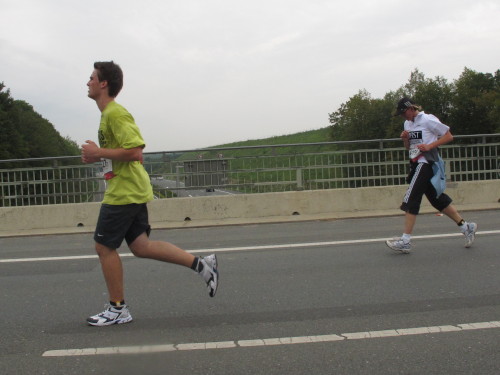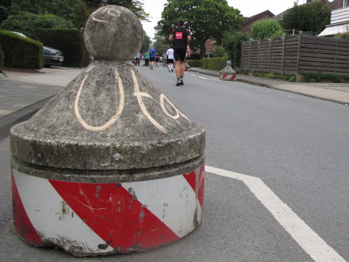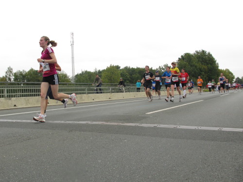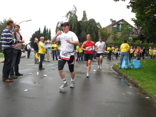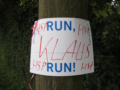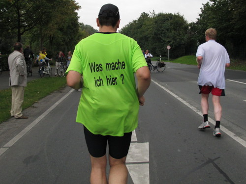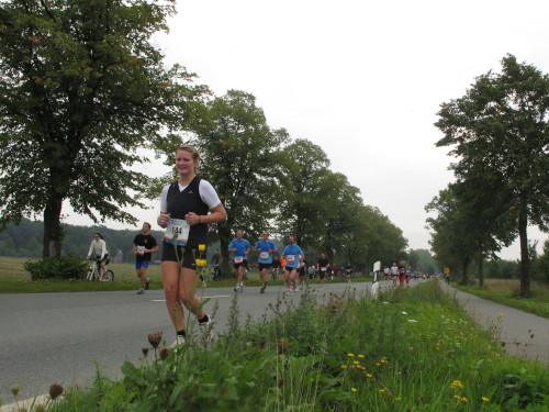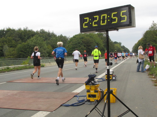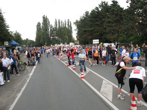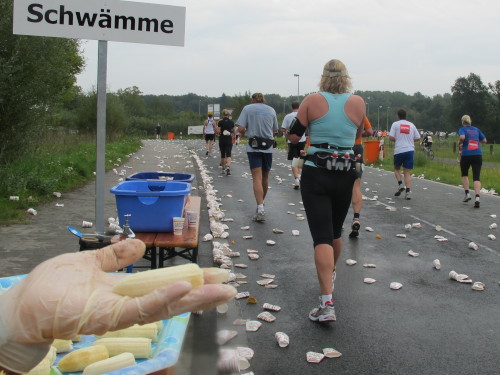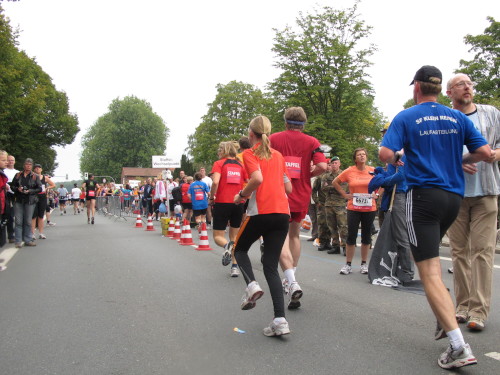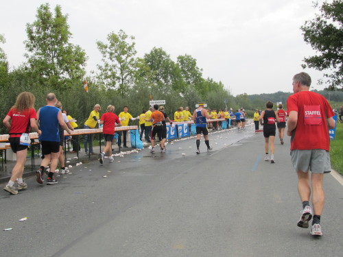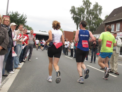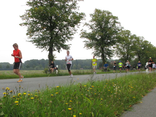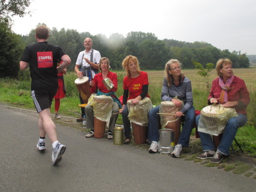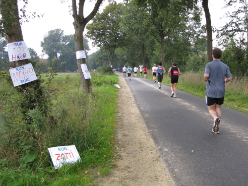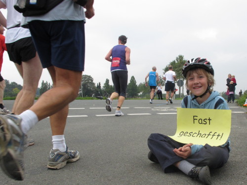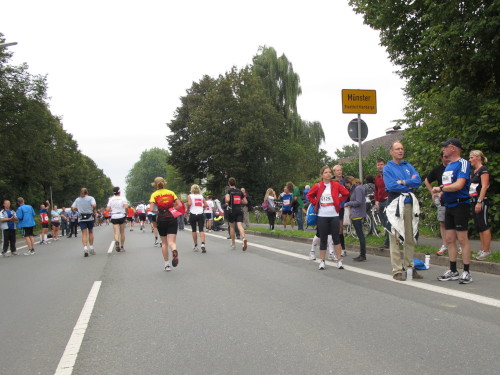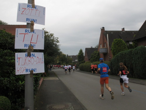 „Taka tun“ nennt sich eine Trommlergruppe, die sich mitten in der Pampa postiert hat. Ihre Chefin fegt wie ein Derwisch durch die Gegend, ist mal am Tanzen, mal schlägt sie selbst die Trommel. Man sieht’s, es macht Spaß. Der Funke springt über. Lachende Gesichter, statt gequälter Minen. Auch die an den Bäumen hängenden, aufmunternden Botschaften der Fans an die Läufer verfehlen nicht ihre Wirkung. Motivation, wo man sie nicht erwartet. Von Leuten, die ganz offensichtlich wissen, was beim Marathon geleistet wird, auch hier hinten im Feld. Ich will die Staffelläufer, die sich noch keine 42 km zutrauen, da nicht ausnehmen. Auch wenn sich gerade eine übermotivierte Läuferin im sagenhaften 6:30er Schritt und einem „Zur Seite!“ den Weg freischreien will.
