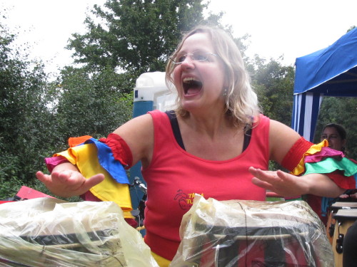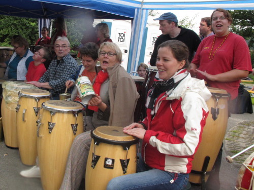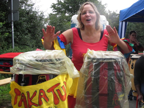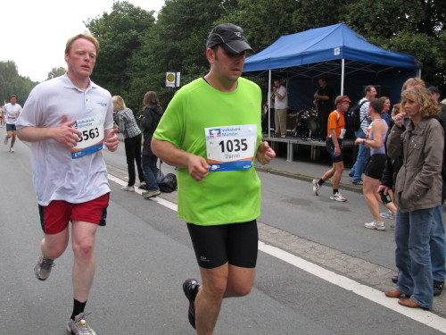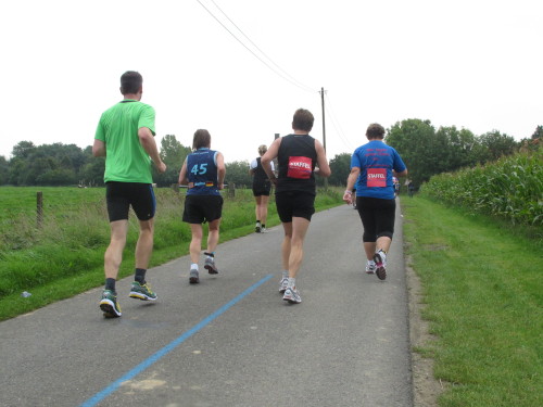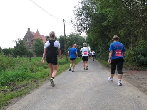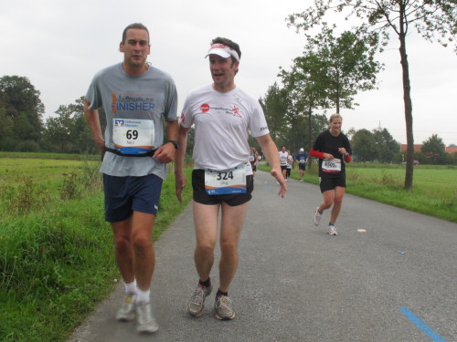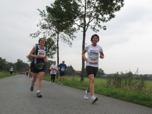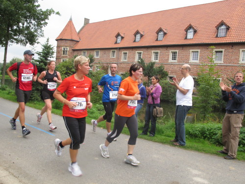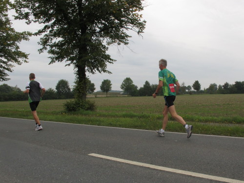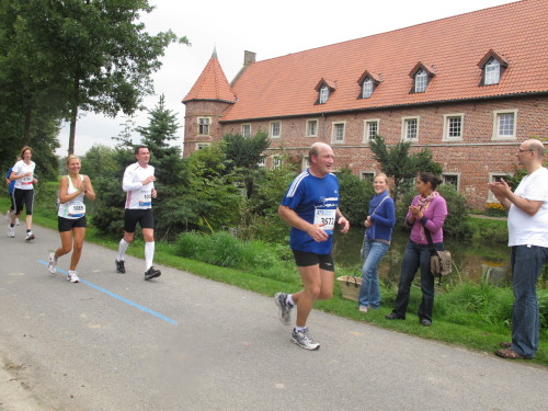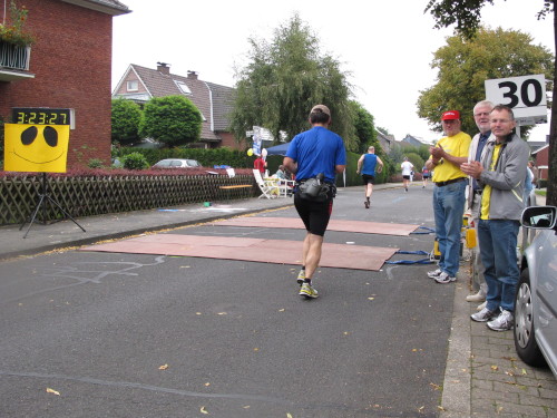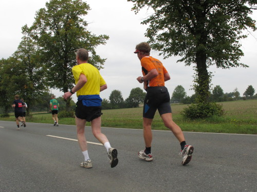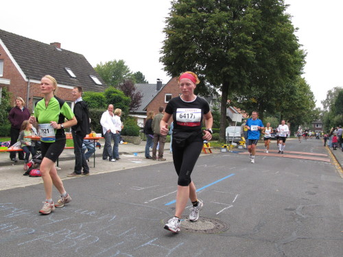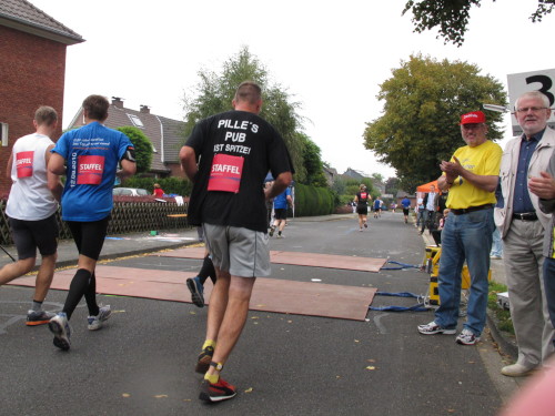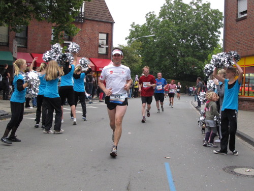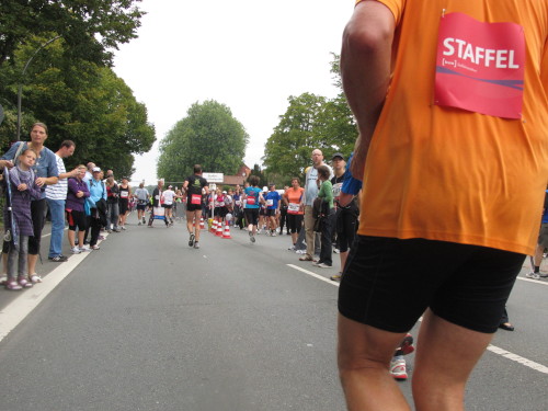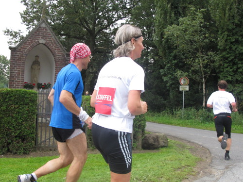 Kaum sieht man den Kirchturm von Roxel, hört man auch schon den Lärm. Die Leute in Roxel stört der leichte Nieselregen wenig, sie feiern Marathon. Balancao mit ihren Trommeln bestimmen den Rhythmus. Jürgen Baumhör stellt die Läufer namentlich vor, so gut es geht. Durch die Staffelläufer ist das Feld noch ziemlich belebt. Auch ein Grund, weshalb ich gegen diesen Wettbewerb grundsätzlich nichts einwende. Die Straßen- und Gartenfeste gehen weiter. Zwischenzeit bei km 30? Vergiss es. Dabei sein ist alles. Statt zu massieren (wer braucht hier hinten schon so was?) machen die Physio-Mädels die Welle. Auf dem Weg nach Gievenbeck gibt es Blues, dann läuft man in eine leichte Senke, lässt es rollen und wird von Trommeln weiter vorwärts getrieben.