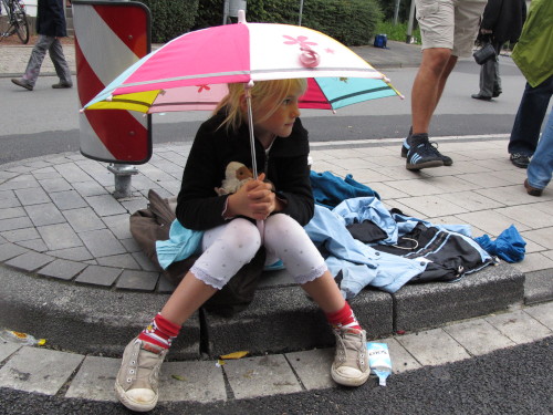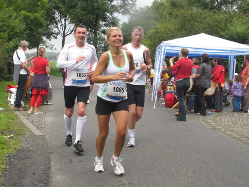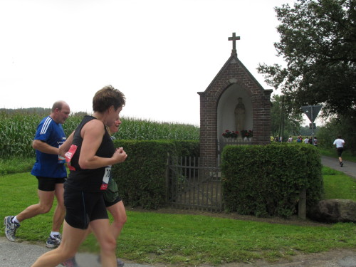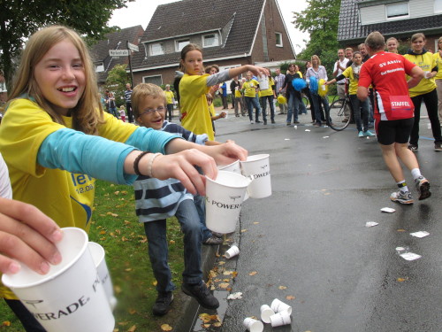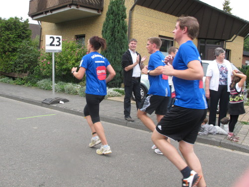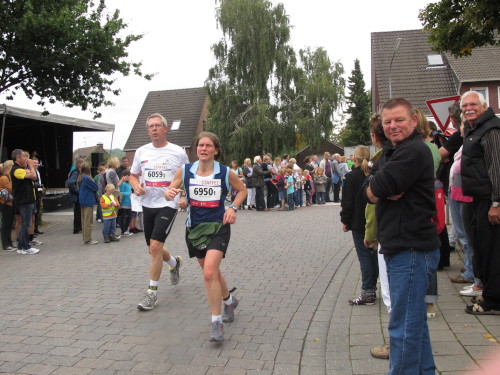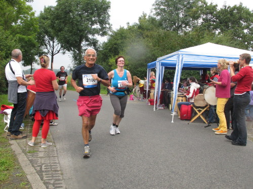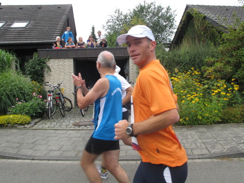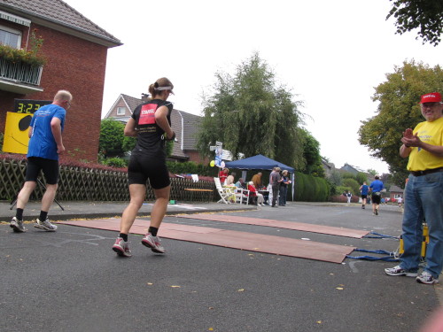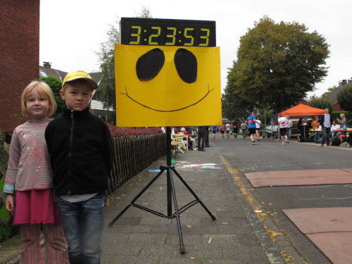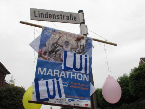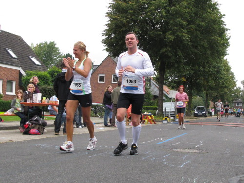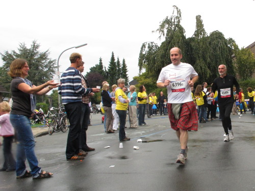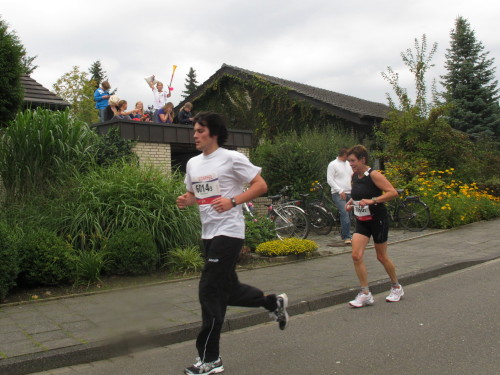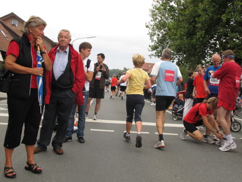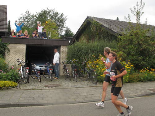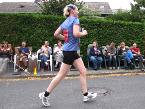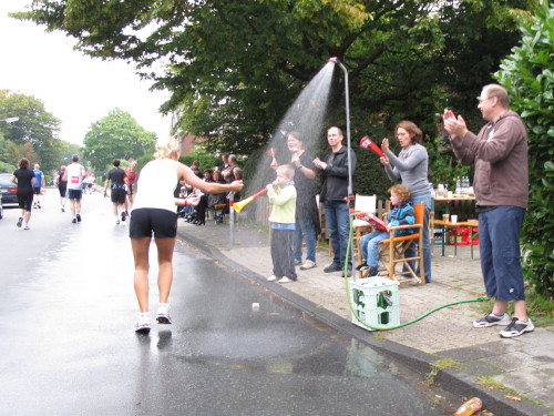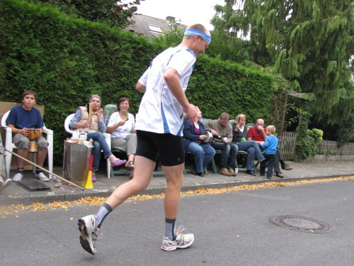 Die Halbdistanz wird erreicht. 2:20 Stunden. Wer viel fotografiert und quatscht, den bestraft der Zeitnehmer. Während eine solche Zeit für manchen ein Alptraum ist, ist meine Horror-Vorstellung ein leerer Foto-Chip. Also halte ich bei den halbnackten Samba-Tänzerinnen wieder voll drauf und auch das Frühstückbuffet vor dem Haus entgeht mir nicht. Geht es nach den Kids bei der Getränkestelle, müsste ich das Wasser literweise in mich rein schütten. „Darf ich Dich wenigstens nass machen?“ „Nein, ich bin es schon.“ Gut erzogen, der Junge. Er lässt es sein. Durch den Ort wird man regelrecht getrieben. Überall, sogar auf dem Garagendach, stehen oder sitzen Leute und feiern „ihre“ Läufer. Es ist herrlich. Hier hat sich ein kleiner Fanclub von Hawe postiert. „Er kommt gleich“, sage ich. Wenn ich weiter so bummele, holt er mich mit seinen 5-Stunden-Läufern auch tatsächlich noch ein.