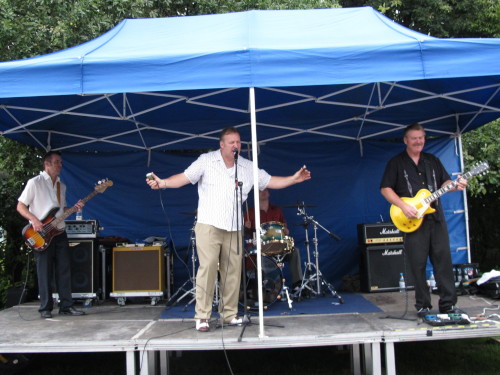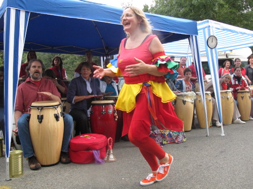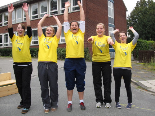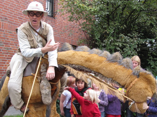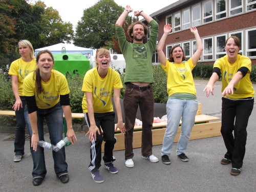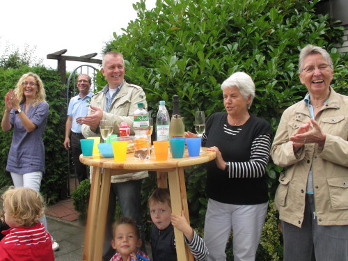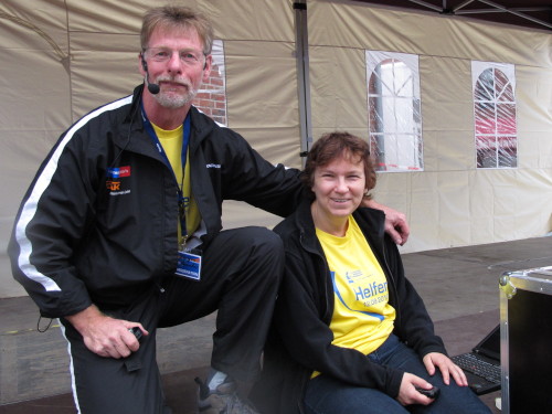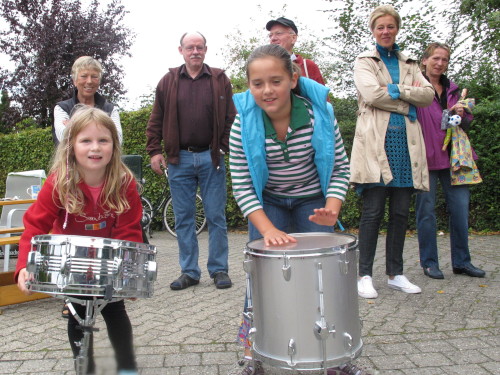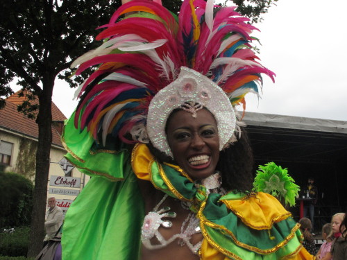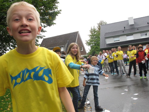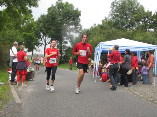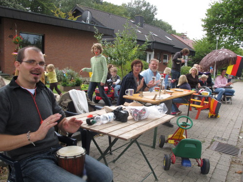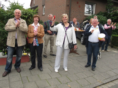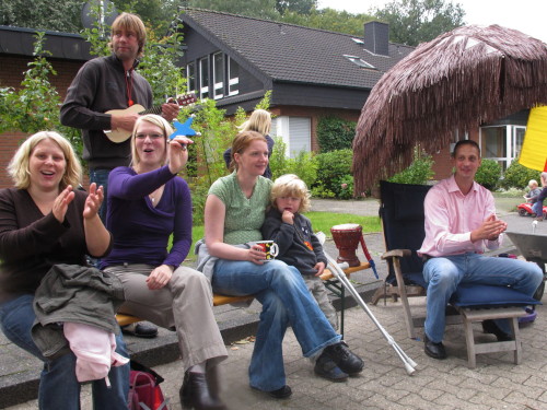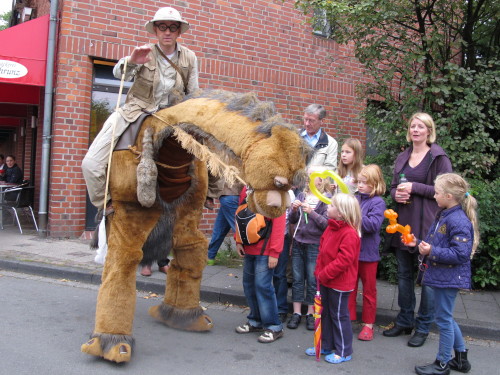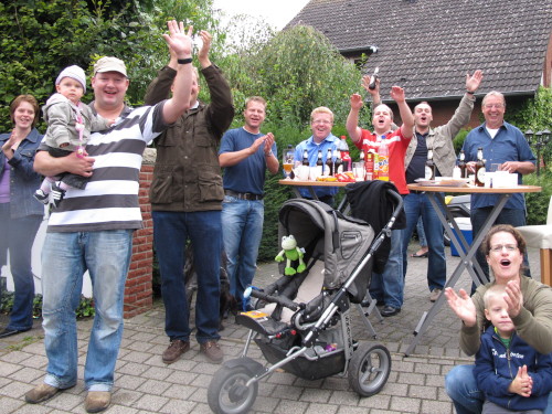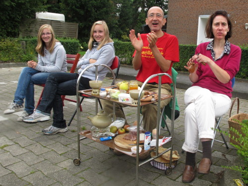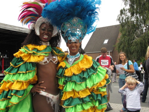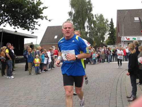 Die Halbdistanz wird erreicht. 2:20 Stunden. Wer viel fotografiert und quatscht, den bestraft der Zeitnehmer. Während eine solche Zeit für manchen ein Alptraum ist, ist meine Horror-Vorstellung ein leerer Foto-Chip. Also halte ich bei den halbnackten Samba-Tänzerinnen wieder voll drauf und auch das Frühstückbuffet vor dem Haus entgeht mir nicht. Geht es nach den Kids bei der Getränkestelle, müsste ich das Wasser literweise in mich rein schütten. „Darf ich Dich wenigstens nass machen?“ „Nein, ich bin es schon.“ Gut erzogen, der Junge. Er lässt es sein. Durch den Ort wird man regelrecht getrieben. Überall, sogar auf dem Garagendach, stehen oder sitzen Leute und feiern „ihre“ Läufer. Es ist herrlich. Hier hat sich ein kleiner Fanclub von Hawe postiert. „Er kommt gleich“, sage ich. Wenn ich weiter so bummele, holt er mich mit seinen 5-Stunden-Läufern auch tatsächlich noch ein.