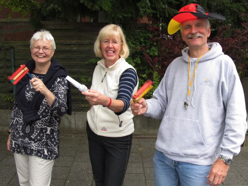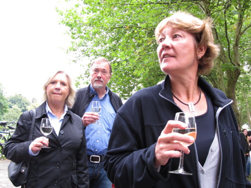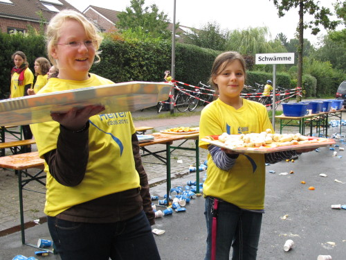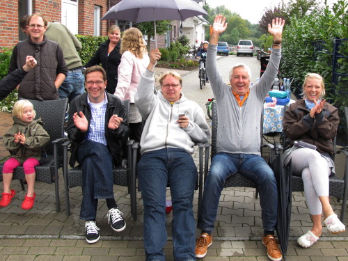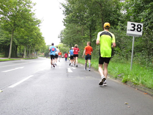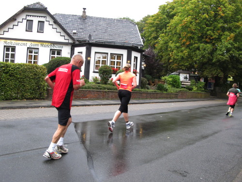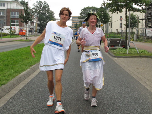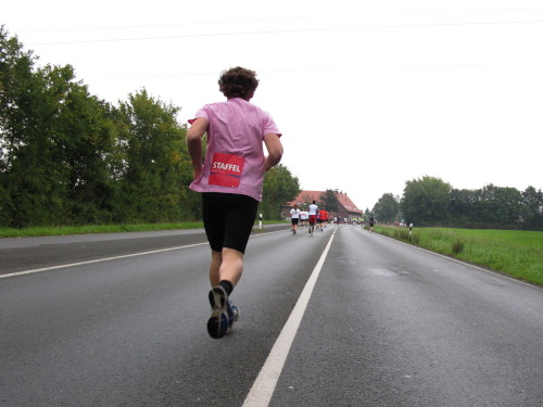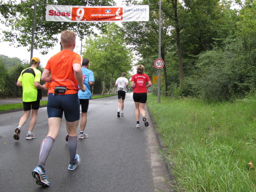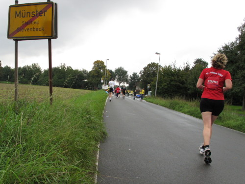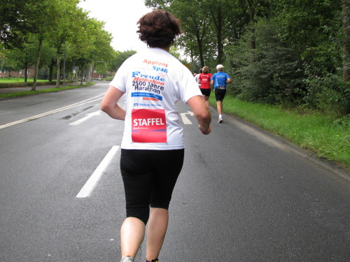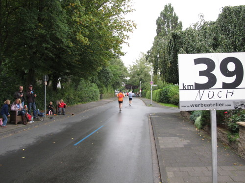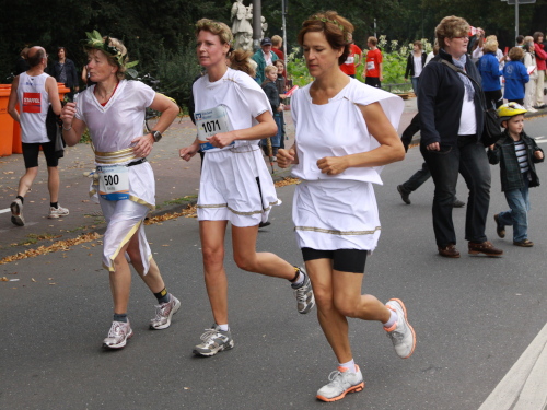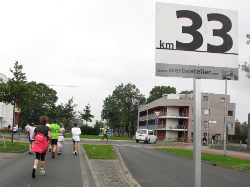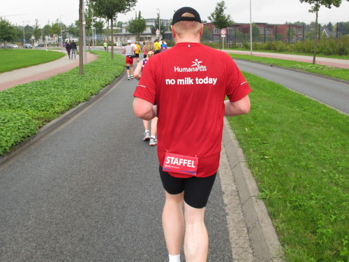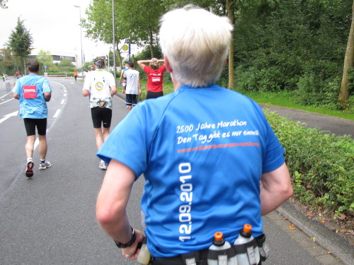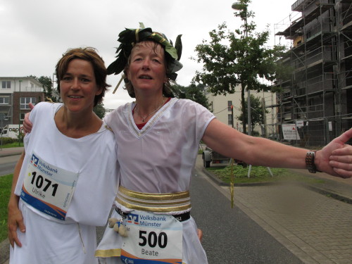 In Gievenbeck (km 33) das gleiche Bild. Menschen an der Straße und in den Gärten, Stimmung und Anfeuerung, wie man es sich wünscht. Beate und Ulrike holen mich ein, beide in griechischer Tracht und Beate zusätzlich mit Lorbeerkranz. „Scheiß Marathon, nichts zu trinken“, schimpft sie. „Kein Ouzo und kein Retsina.“ So hat jeder sein Problem. Gleich überholen wir einen Läufer, der beklagt mit seinem Shirt einen ganz anderen Missstand: „No milk today“.
