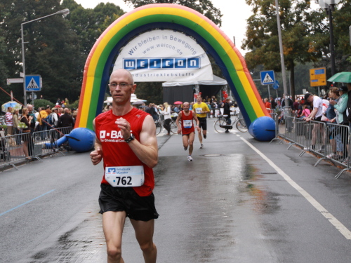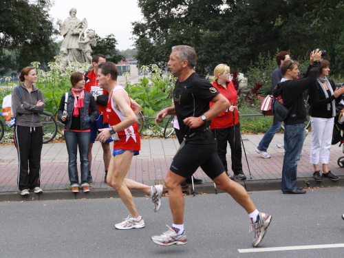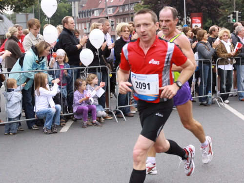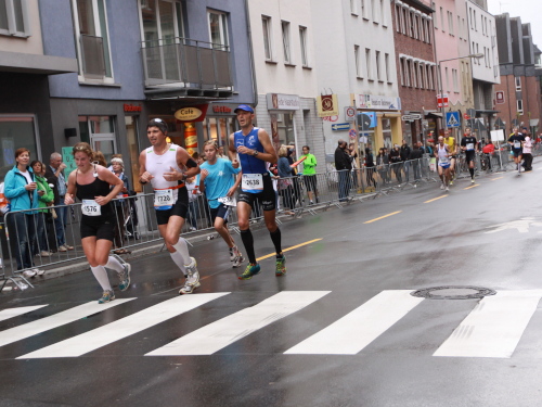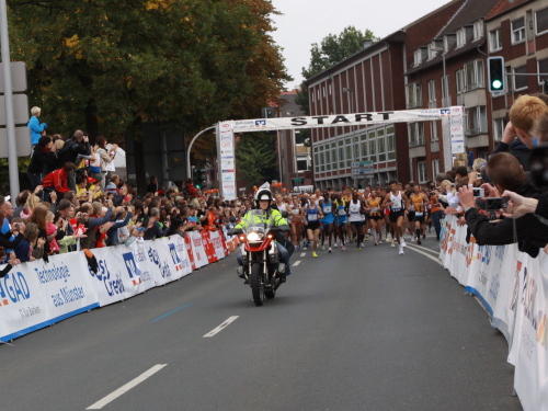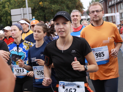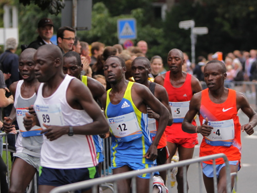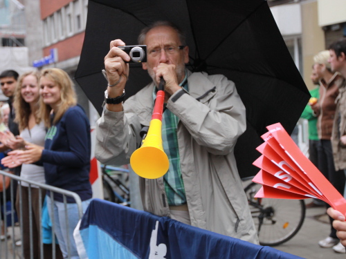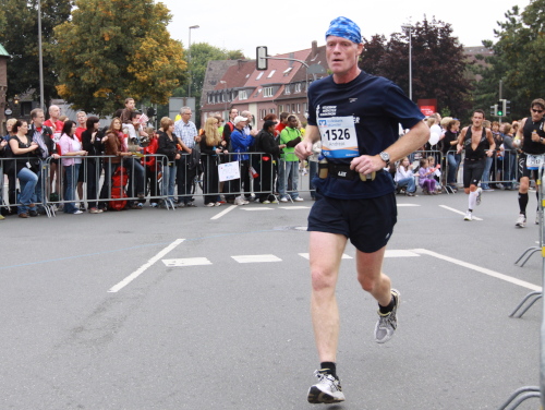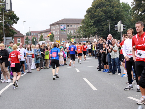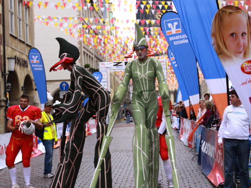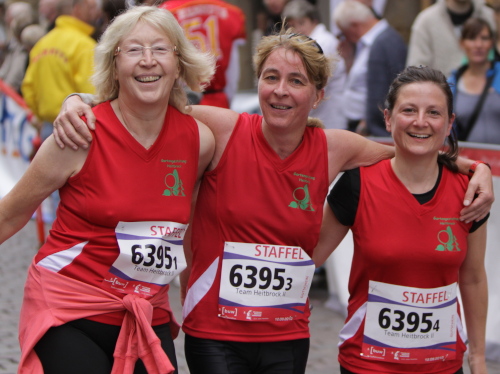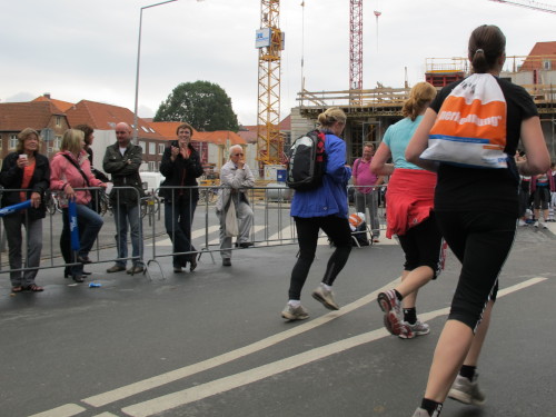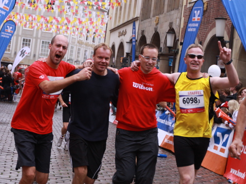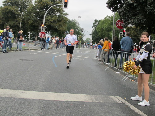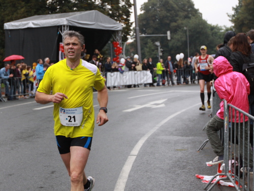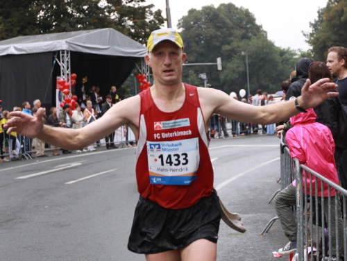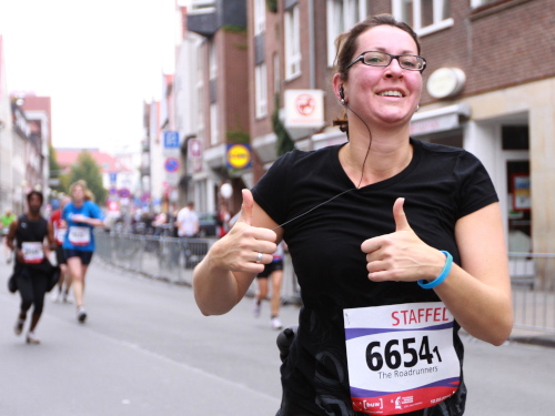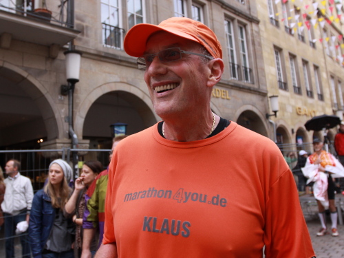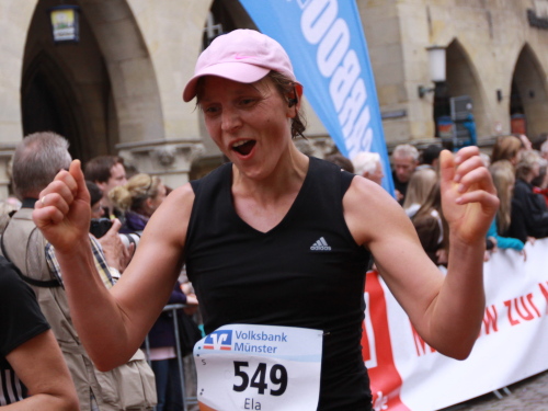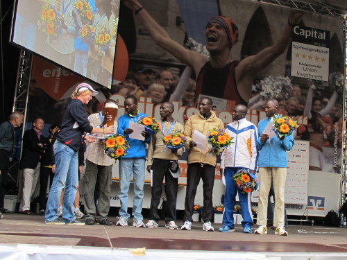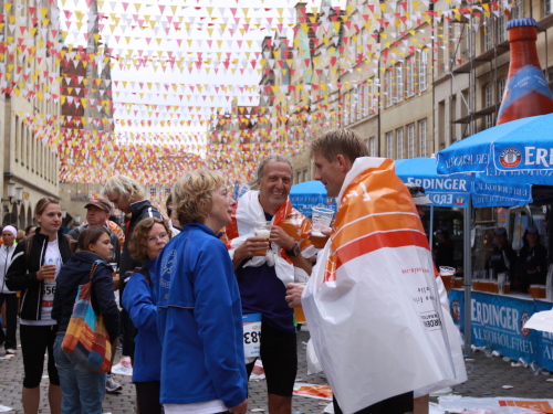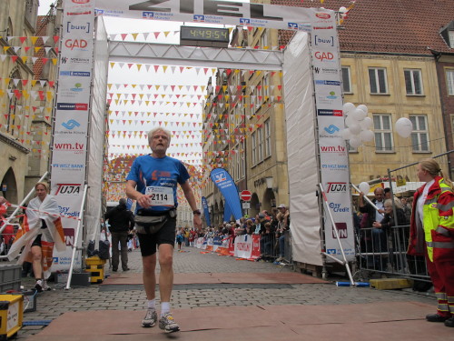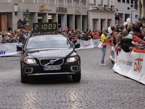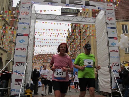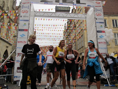 Ja, es ist schön. Eine kleine Traileinlage an der Baustelle, dann das Finale zunächst auf der Aegidiistraße. Was juckt mich das bucklige Pflaster, nichts tut mehr weh. Nach fast fünf Stunden sind die Leute noch immer aus dem Häuschen. Am Stadthausturm kriege ich noch die Siegerehrung der Männer mit, 2:10 noch was, Sieg und Streckenrekord für Patrick Muriuki ……