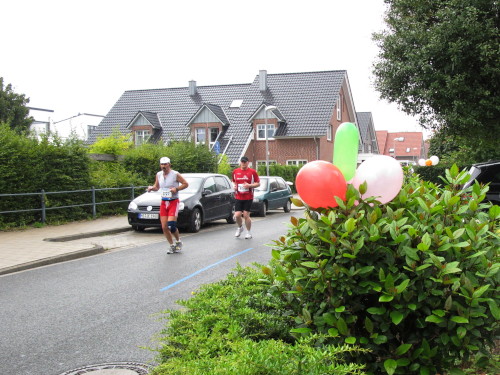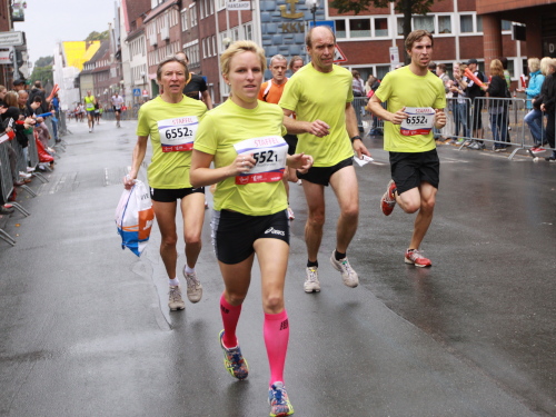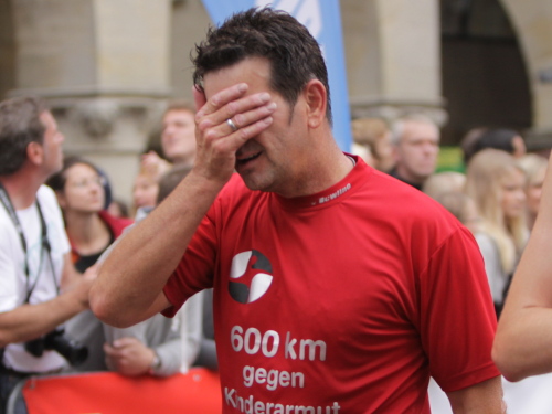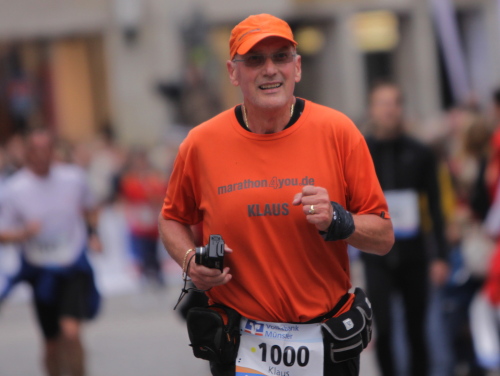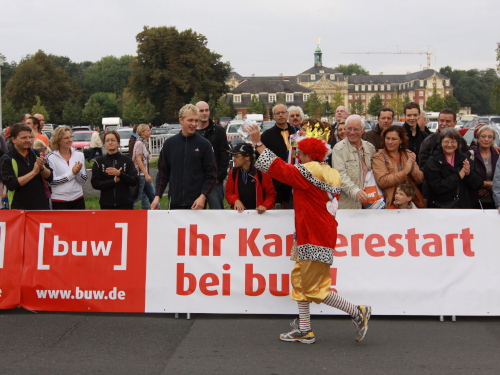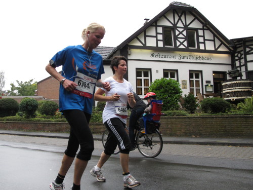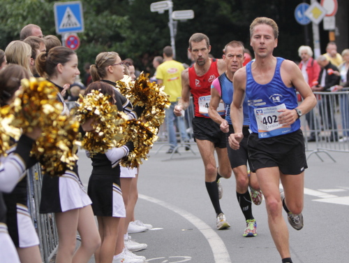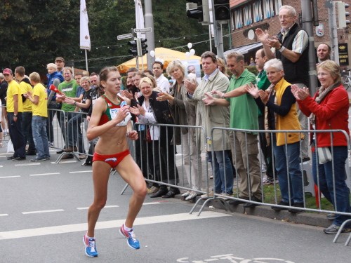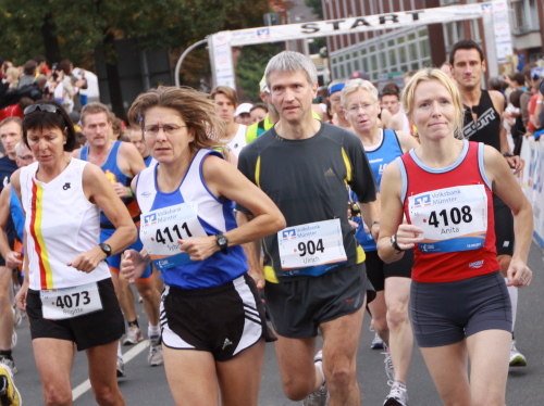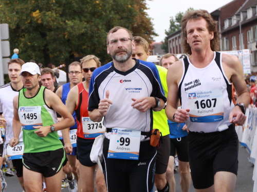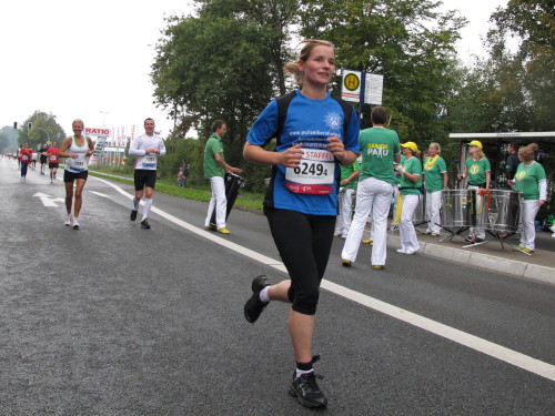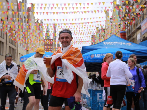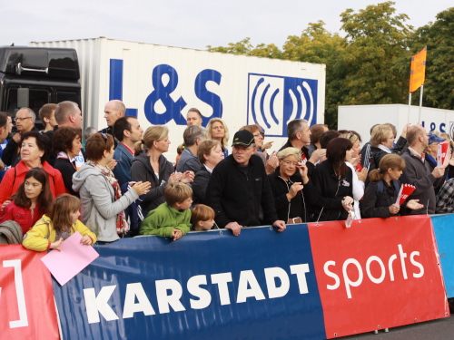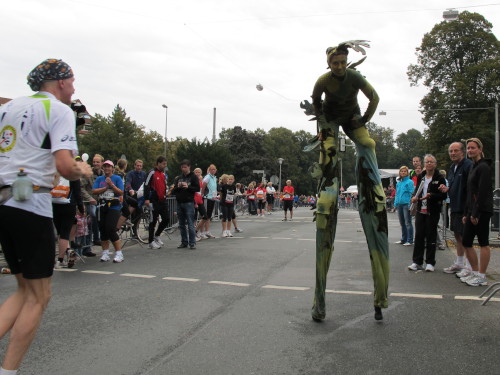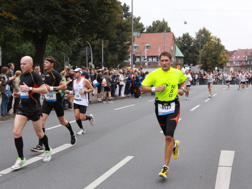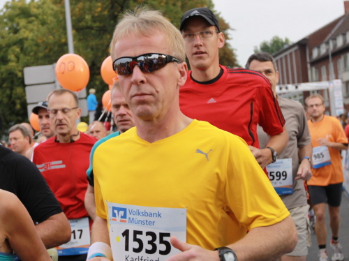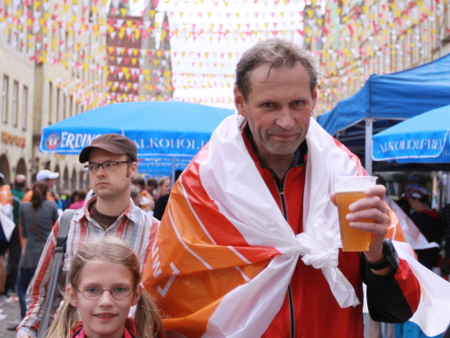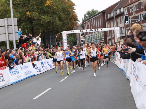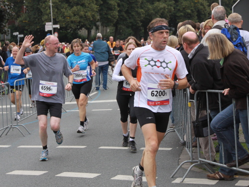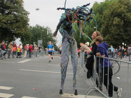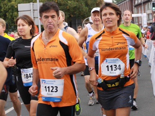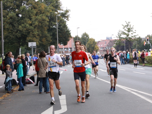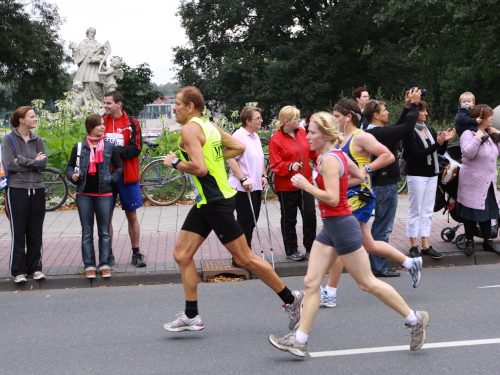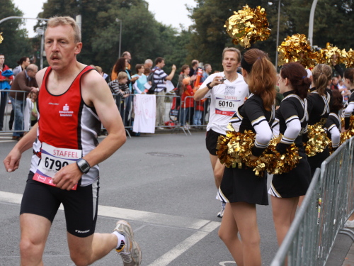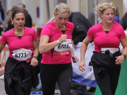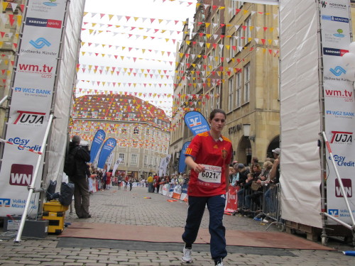 Ja, es ist schön. Eine kleine Traileinlage an der Baustelle, dann das Finale zunächst auf der Aegidiistraße. Was juckt mich das bucklige Pflaster, nichts tut mehr weh. Nach fast fünf Stunden sind die Leute noch immer aus dem Häuschen. Am Stadthausturm kriege ich noch die Siegerehrung der Männer mit, 2:10 noch was, Sieg und Streckenrekord für Patrick Muriuki ……