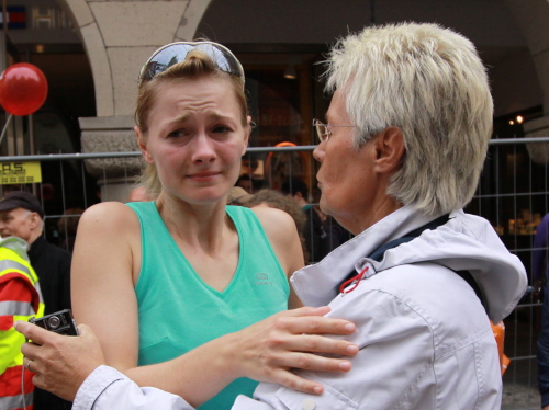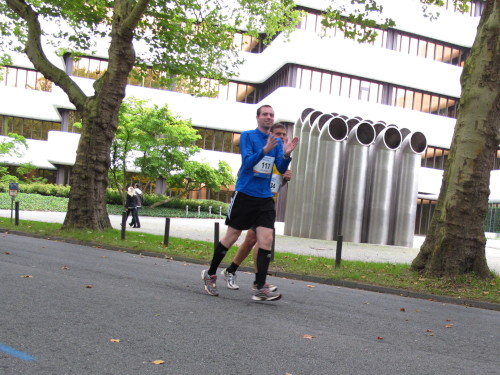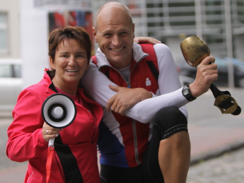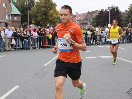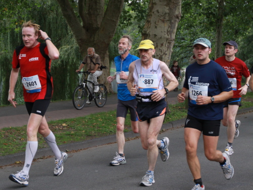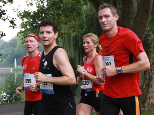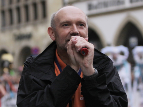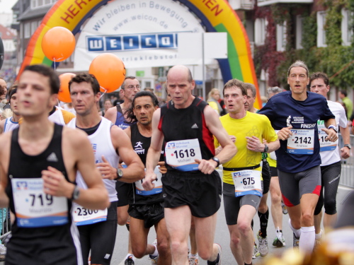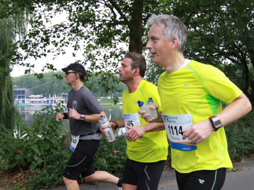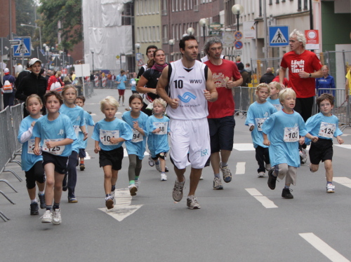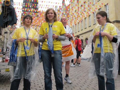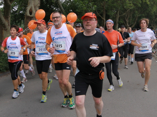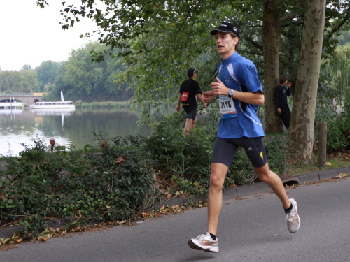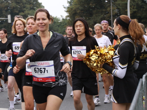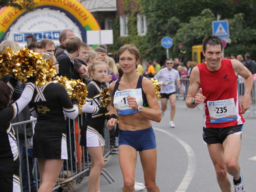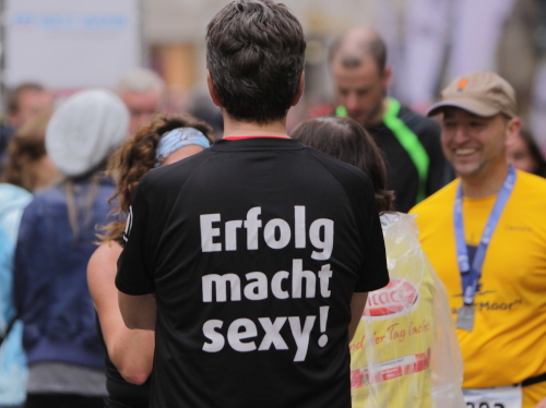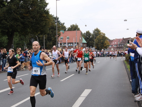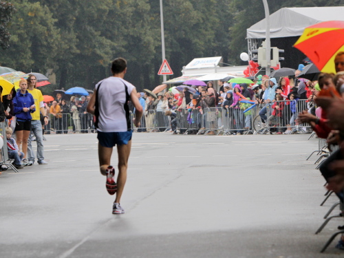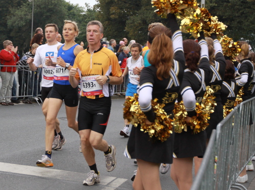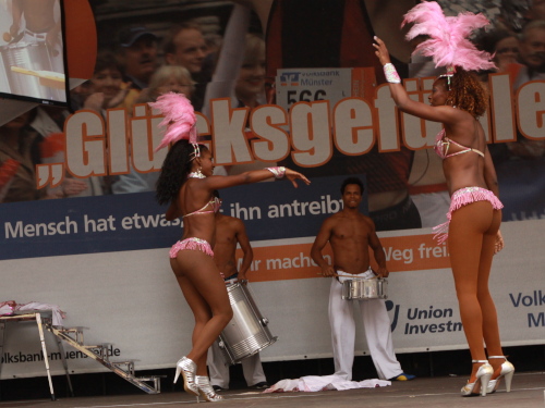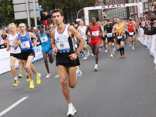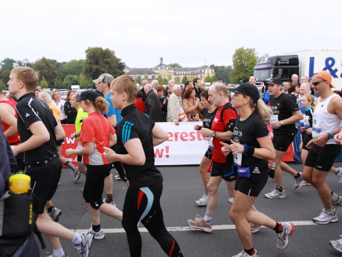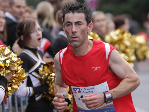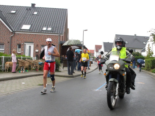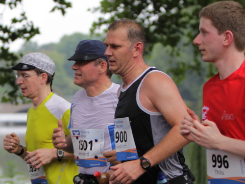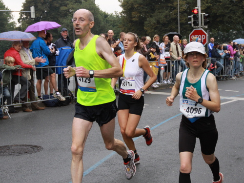 Ja, es ist schön. Eine kleine Traileinlage an der Baustelle, dann das Finale zunächst auf der Aegidiistraße. Was juckt mich das bucklige Pflaster, nichts tut mehr weh. Nach fast fünf Stunden sind die Leute noch immer aus dem Häuschen. Am Stadthausturm kriege ich noch die Siegerehrung der Männer mit, 2:10 noch was, Sieg und Streckenrekord für Patrick Muriuki ……
