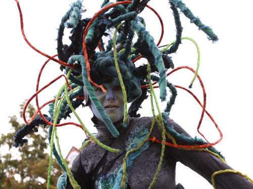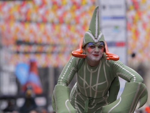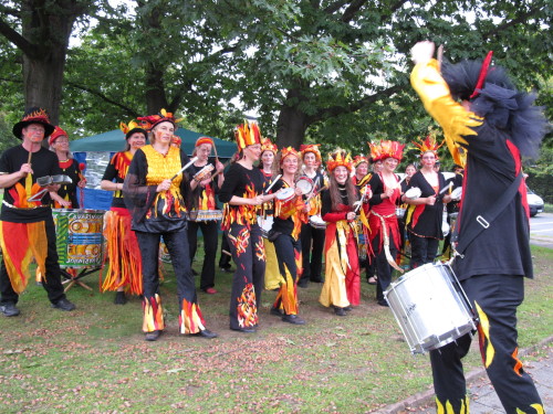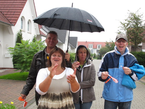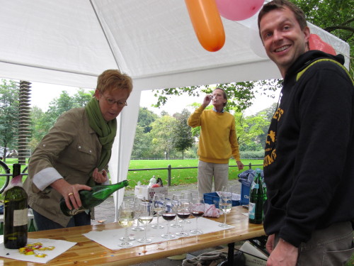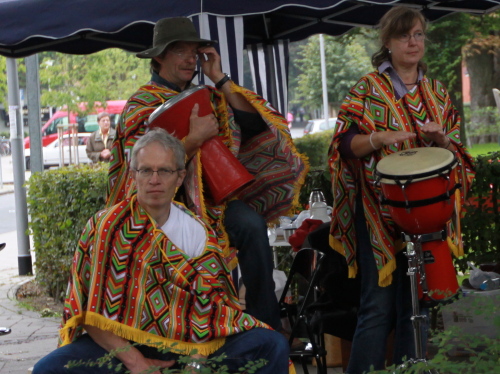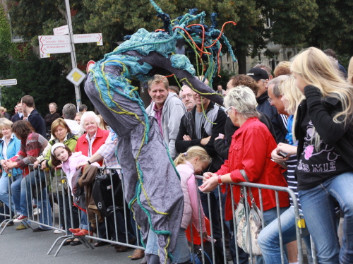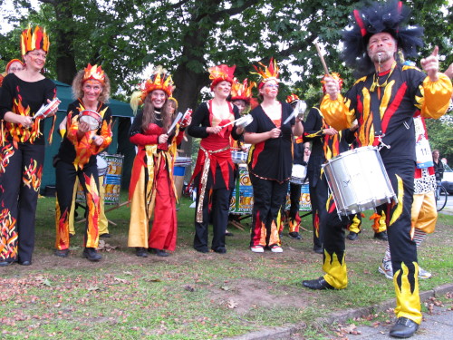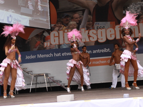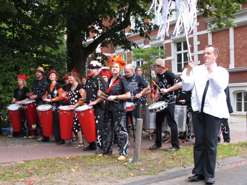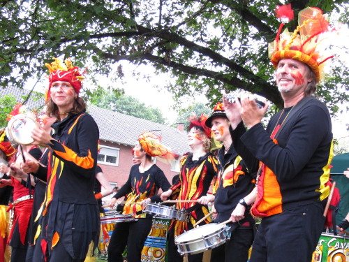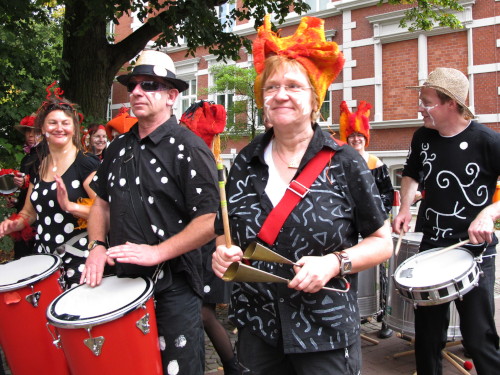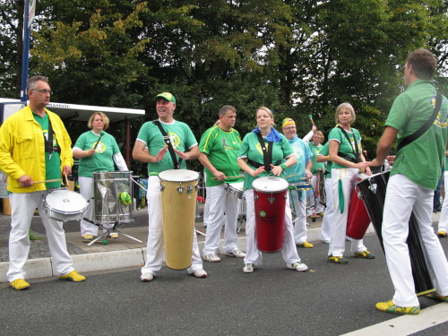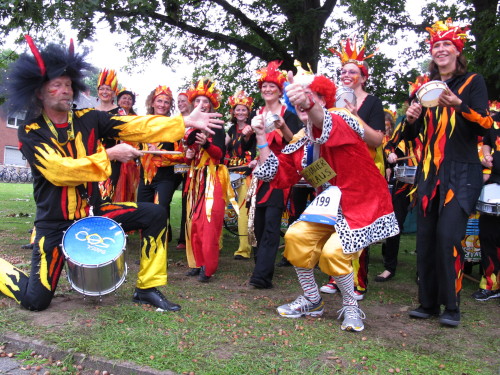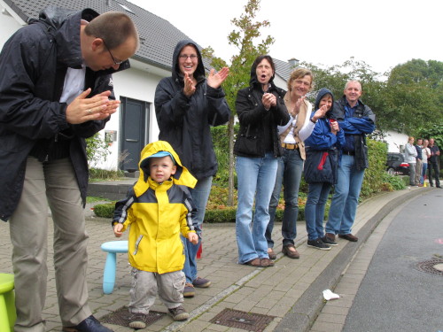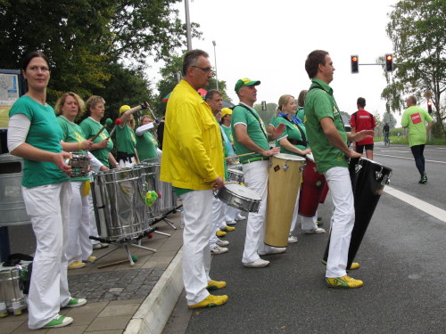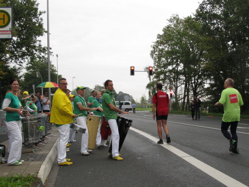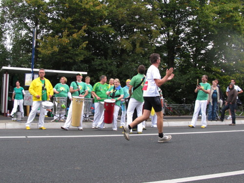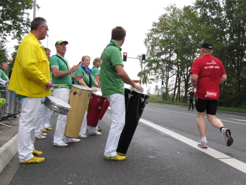 Km 38, die Stadt hat uns wieder. Es wird hart. Km 39, eine abgelegene Wohnstraße, ein paar Leute feuern mich an. Km 40, Trommler machen Dampf, Michel treibt seine Späße. Mir reicht’s. „Come on“, muntert mich ein Kamerad auf, „jetzt wird es schön.“ Die nächsten Trommler, Stelzenläufer und eine Bombenstimmung. Hoffentlich haben Beate und Ulrike den Weinausschank hier auch gesehen. Roter und Weißer sind im Angebot.