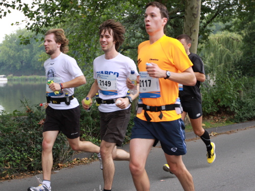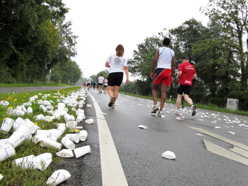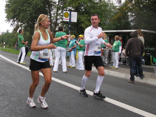 Alle 2,5 km Wasser oder/und Verpflegung. Wasser, Iso, Obst, ab der zweiten Hälfte auch Cola