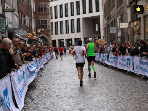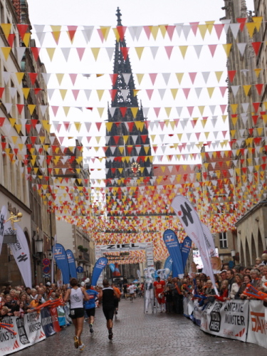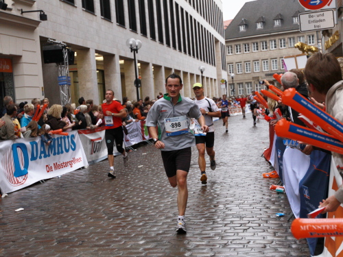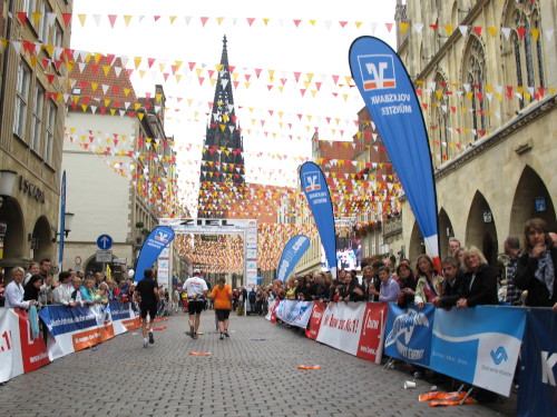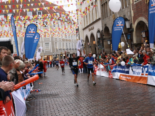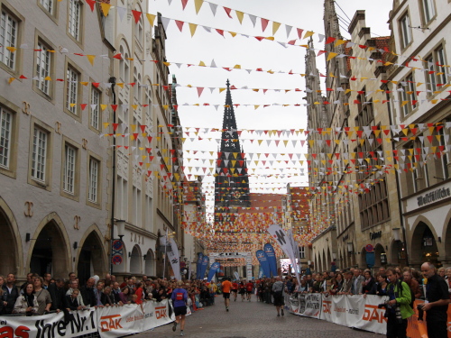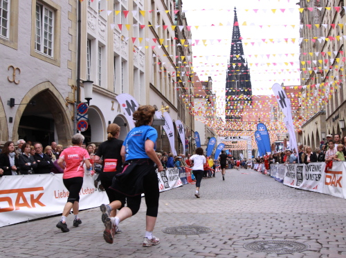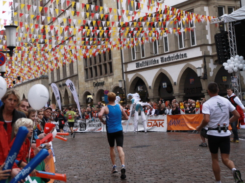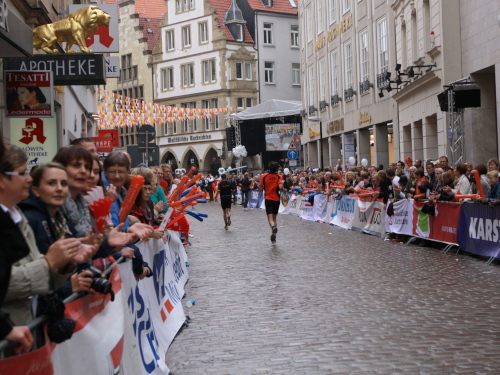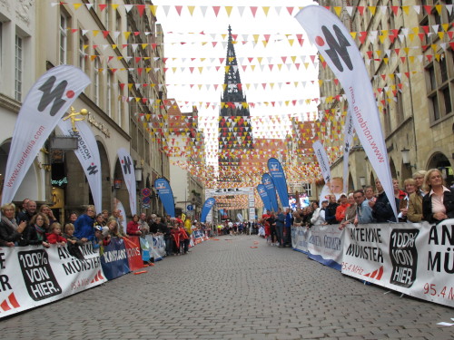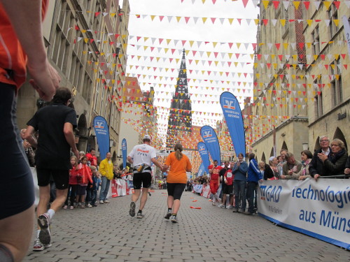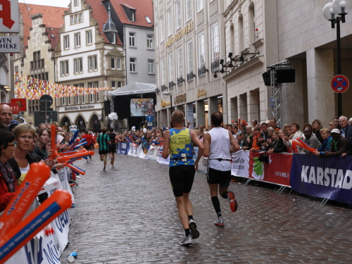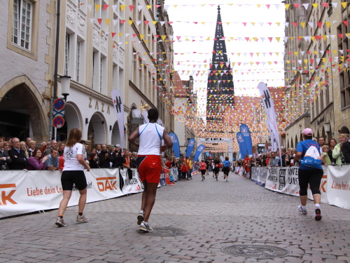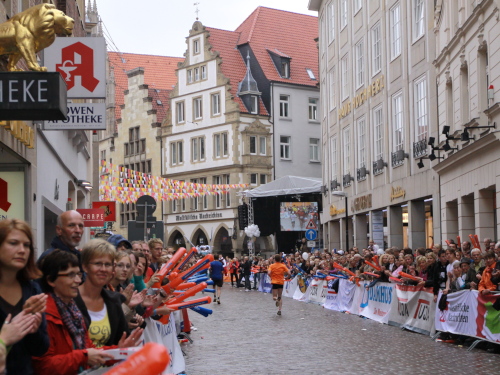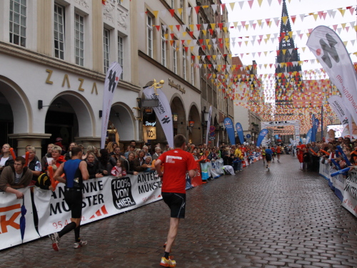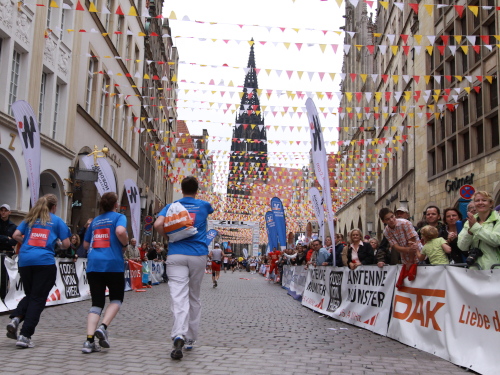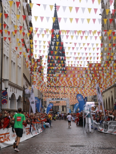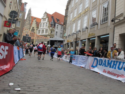 Noch 195 Meter, Prinzipalmarkt, Marathon-City, Jubelarien. Verstehe wer will, warum sie alle wie blöd rennen. Das ist doch zum Stehenbleiben, zum Hinlegen, zum Genießen.